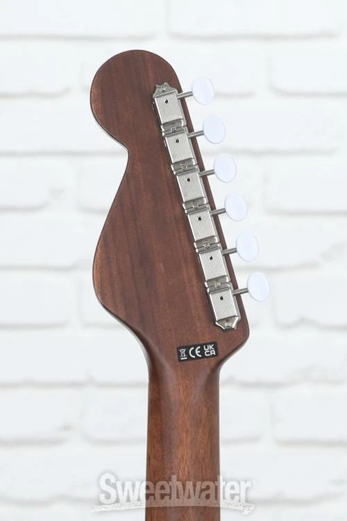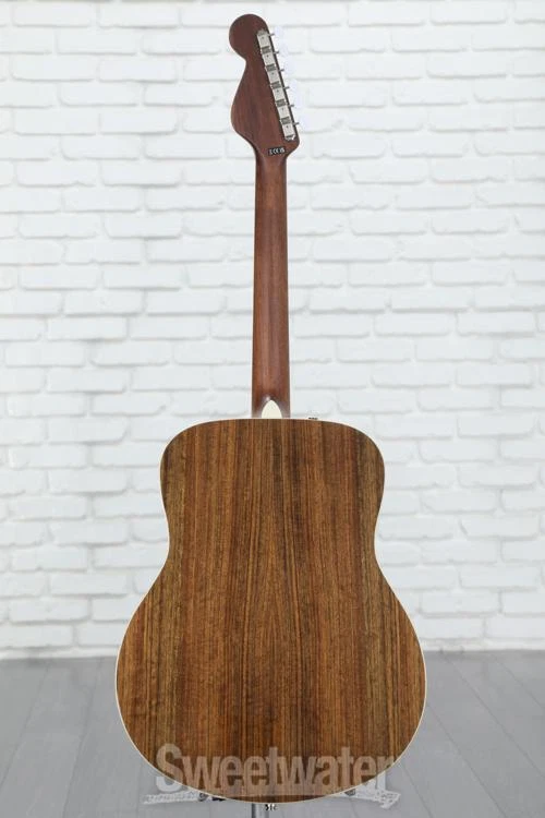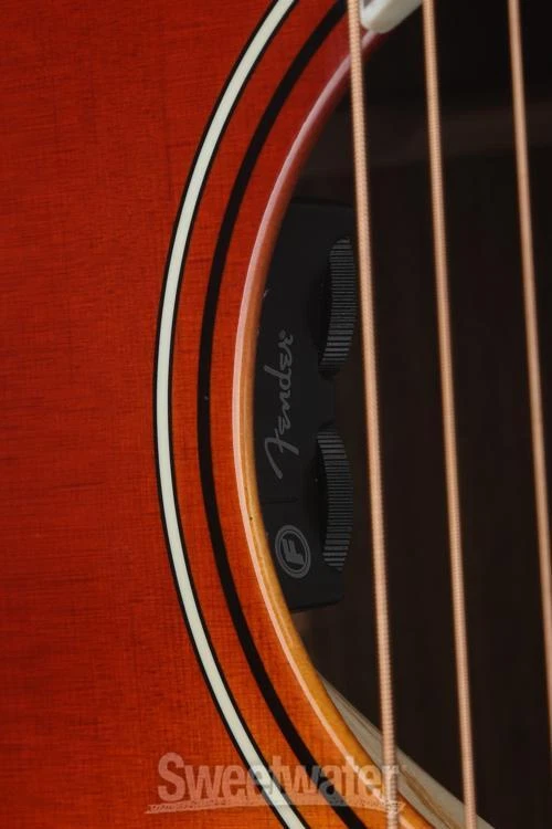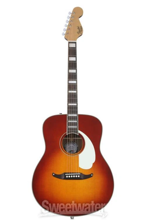 Beach Vibes with Professional Perks! The California Vintage Palomino by Fender blends solid tonewoods, stage-ready features, and West Coast style into one timeless acoustic-electric guitar that demands double takes! Bold tonewood credentials across the entire body include a solid Sitka spruce top, ovangkol back and sides, an okoume neck, and an ovangkol fingerboard. Such vibrant materials usher the classic appeal of full-bodied acoustic tone packed with plenty of volume and projection. Sweetwater guitarists have found the Auditorium body shape makes the California Vintage Palomino playable and balanced in any scenario. Meanwhile, an okoume neck with a vintage-inspired modern “V” carve optimizes comfort for strums, plucks, and picking across an ovangkol fingerboard. The California Vintage Palomino’s built-in Fishman Sonitone Plus system delivers top-notch amplification for an authentic sound fueled by not just one but two capture points for sound. Finally, this masterpiece is stitched together with a Viking-style bridge, bold block Sweetwater is an Authorized Fender Dealer Genuine New Item Sweetwater's 2-year warranty and 55 point inspection Fender California Vintage Palomino Acoustic-electric Guitar - Sienna Sunburst 6-string Acoustic-electric Guitar with Spruce Top, Ovangkol Back, Sides, and Fingerboard, and Okoume Neck - Sienna Sunburst Beach Vibes with Professional Perks! The California Vintage Palomino by Fender blends solid tonewoods, stage-ready features, and West Coast style into one timeless acoustic-electric guitar that demands double takes! Bold tonewood credentials across the entire body include a solid Sitka spruce top, ovangkol back and sides, an okoume neck, and an ovangkol fingerboard. Such vibrant materials usher the classic appeal of full-bodied acoustic tone packed with plenty of volume and projection. Sweetwater guitarists have found the Auditorium body shape makes the California Vintage Palomino playable and balanced in any scenario. Meanwhile, an okoume neck with a vintage-inspired modern “V” carve optimizes comfort for strums, plucks, and picking across an ovangkol fingerboard. The California Vintage Palomino’s built-in Fishman Sonitone Plus system delivers top-notch amplification for an authentic sound fueled by not just one but two capture points for sound. Finally, this masterpiece is stitched together with a Viking-style bridge, bold block inlays, and a Stratocaster headstock for chiseled looks that mirror the rugged, beautiful duality of West Coast terrain. Solid tonewoods up the ante Par for the course, the Fender team sourced high-quality solid tonewoods for the California Vintage Palomino acoustic-electric guitar. A solid Sitka spruce top delivers gold-standard acoustic guitar tone with strong resonance and a dynamic sensitivity that fuels passionate playing. Ovangkol back and sides support spruce with lasting sustain and a full-bodied tone that’s frequently compared to mahogany. These tonewoods pair well with the fine-tuned power, playability, and focus of an Auditorium body style. Auditorium guitars walk a fine line by enhancing the dimensions of all-purpose dreadnoughts with some player-friendly tweaks. At either end, your hands are freer to fret and strum, thanks to a drawn-in waist that also enhances clarity. Such features make the California Vintage Palomino an exceptional pick for gigs and recording, but most importantly, the guitar is downright fun to play hour after hour. “V” is for vintage ... with a modern twist! “V” neck profiles are making a serious comeback, and for good reason! This retro neck style features a subtle ridge that gives your thumb better comfort and support. “V” necks were widespread when guitars were built with hand tools. Modern machinery made smoother shapes possible, but many players still value the extra grip and support the old-school “V” provides. The Fender California Vintage Palomino’s okoume neck optimizes the “V”-shape neck to suit today’s players, and the result is a modern feel with just the right grip for accurate fretting. Dual-source electronics Developed by Fishman and Fender, the Sonitone Plus is a pickup/preamp combo that captures your acoustic’s sound in two places rather than just one. An under-saddle piezo captures all the snap and pluck of strings and surface frequencies, while an internal body transducer gathers important nuances within the sound chamber. The resulting tone is richer and more vibrant when plugging in. What’s more, the Sonitone Plus system protects good looks with controls placed discreetly within the soundhole, including a blend control for mixing the Sonitone Plus’ dual sources into something just right for you and your audience’s ears. Fender California Vintage PalominoFeatures: Packed with solid tonewoods, gig-ready electronics, and vintage West Coast looks Auditorium body is inspired by dreadnought power and versatility but with better balance and tighter bass Warm, full-bodied tone sculpted with a Sitka spruce top and an ovangkol body Comfortable okoume neck with a high-performance modern “V” profile Fishman Sonitone Plus dual-source electronics fuel natural-sounding amplification Soundhole-mounted Fishman controls guard vintage appeal Eye-catching Viking-style bridge, block inlays, and Stratocaster headstock Innovative Performance-X bracing enhances tone and volume Specification Detail String Type Steel Number of Strings 6 Left-/Right-handed Right-handed Body Shape Palomino Vintage Back & Sides Wood Solid Ovangkol Top Wood Solid Sitka Spruce Top Finish Satin Polyurethane Color Sienna Sunburst Body Bracing Performance X Binding Aged White Neck Wood Okoume Neck Shape Modern V Radius 16" Fingerboard Material Ovangkol Fingerboard Inlay Pearloid Block Number of Frets 20 Scale Length 25.5" Nut Width 1.69" Nut/Saddle Material Bone (nut) Tuning Machines Vintage Style Electronics Fishman Sonitone Strings Fender Phospher Bronze, .012-.052 Case/