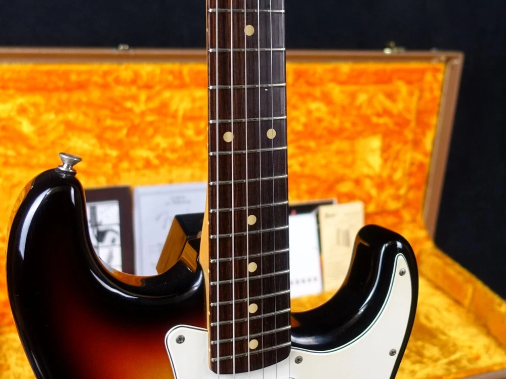 Description Among the many Custom Shop Stratocasters, the "1960" spec Stratocaster is one of the most popular models. This particular 3-Color Sunburst NOS finish '60 Stratocaster was made in 1999, as confirmed by the neck date and certificate of authenticity. This model, which features the sought-after fat sound of the era, comes with an alder body, maple neck, and a slab rosewood fingerboard—classic wood materials for the period. The neck grip is a moderate 60s-style C-shape with a 7.25-inch radius, vintage-style frets, and an 11-point screw pickguard, faithfully reproducing the specifications of a 1960 Strat. The electronics feature a 5-way switch (replacement), master volume, front tone, and center tone controls—another classic, straightforward setup. In terms of condition, there are noticeable signs of use, including dents, scratches, and some dulling of the finish and parts. The headstock also shows marks from clip-on tuners. However, there are no major visible damages that would significantly affect its aesthetics or playability, so the overall condition is decent. Parts replaced include the nut (cow bone), rubber for pickup height adjustment, and the switch was upgraded from the original 3-way to a more practical 5-way (the original 3-way switch is included). The frets are vintage-style and show some wear, but there is still about 60-70% fret height remaining, and there is no noticeable buzzing or dead spots during play. *Note: The back panel screws and tremolo arm are missing. Weight: Approximately 3.61 kg. About Us If you have any problem, please contact us. Your satisfaction is important to us. We have results that I sold of tens of thousands of by Internet sale. We have pride ourselves in the Quality of items we offer. All our items has been checked by technician. As every seller dealing with pre-owned branded items in Japan we have as well license from local government to offer services of this kind. We are officially registered as legal business and we have to comply with all rules and regulations including tax requirements from the Japanese government. International Buyers - Please Note: Import duties, taxes and charges are not included in the item price or shipping charges. These charges are the buyer's responsibility. Please check with your country's customs office to determine what these additional costs will be prior to bidding/buying. These charges are normally collected by the delivering freight (shipping) company or when you pick the item up - do not confuse them for additional shipping charges. We do not mark merchandise values below value or mark items as “gifts” - US and International government regulations prohibit such behavior.