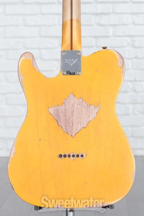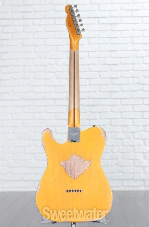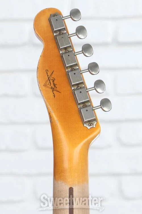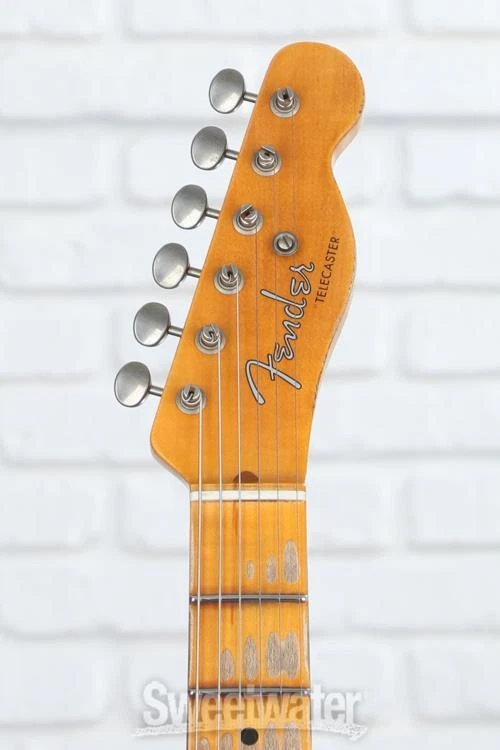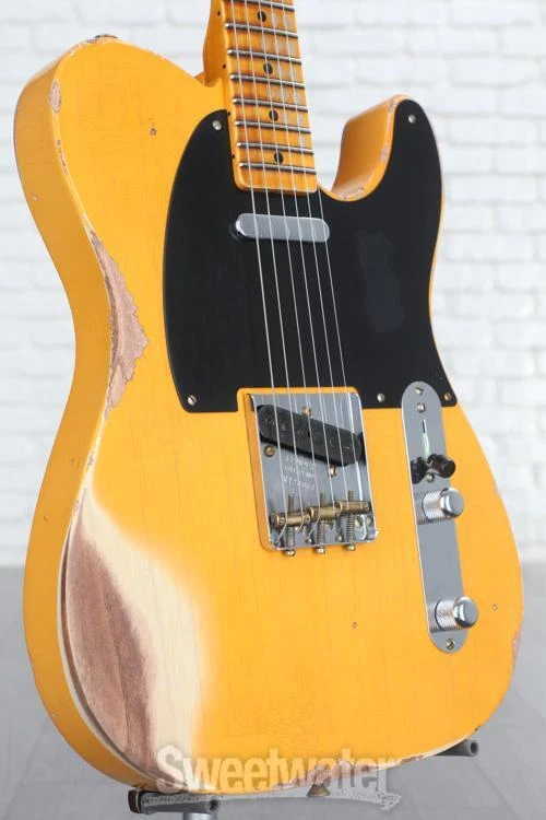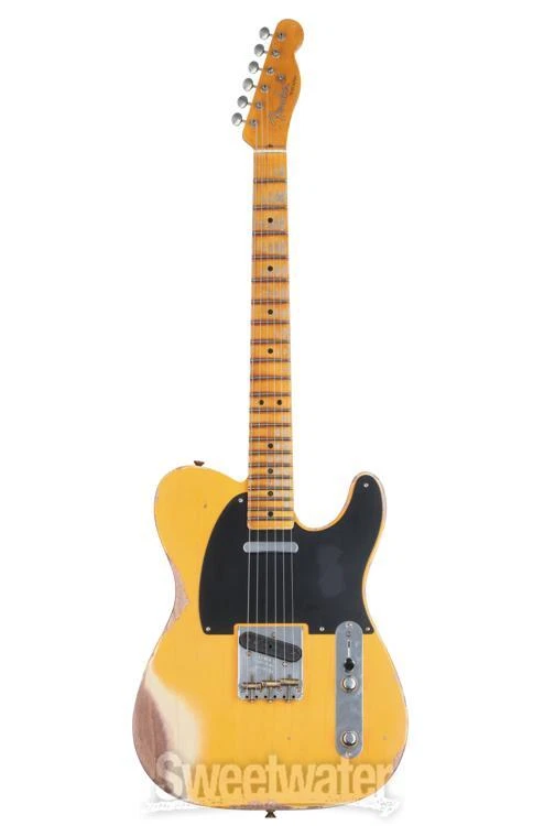 No-frills Classic that Started It All Experience history with the Fender Custom Shop’s 1952 Telecaster, designed with brilliant attention to detail to faithfully recreate the timeless essence of the Tele that started it all. Sweetwater’s guitar pros agree that the hand-selected 2-piece ash body — paired with a solid 1-piece, rift-sawn maple neck — captures the aesthetic and tonal elegance of this founding Fender. The classic comfort of the ’57-style soft “V” neck profile is topped with 21 narrow-tall frets, providing thumb-over players with a vintage 7.25–9.5-inch compound-radius. Era-accurate tones are easily achieved, thanks to the Custom Shop’s hand-wound ’50/’51 Blackguard pickups, which are outfitted with ’51 Modified Nocaster wiring. Vintage flares range from the tuning machines, the bone nut, and the disk string tree, all the way down to the ’51-’54 brass barrel saddles in the bridge. It all equates to a timeless Tele that isn’t just for show!Original Sweetwater is an Authorized Fender Custom Shop Dealer Genuine New Item Sweetwater's 2-year warranty and 55 point inspection Fender Custom Shop '52 Telecaster Heavy Relic - Aged Nocaster Blonde Solidbody Electric Guitar with Ash Body, Maple Neck, Maple Fretboard, and 2 Single-coil Pickups - Aged Nocaster Blonde No-frills Classic that Started It All Experience history with the Fender Custom Shop’s 1952 Telecaster, designed with brilliant attention to detail to faithfully recreate the timeless essence of the Tele that started it all. Sweetwater’s guitar pros agree that the hand-selected 2-piece ash body — paired with a solid 1-piece, rift-sawn maple neck — captures the aesthetic and tonal elegance of this founding Fender. The classic comfort of the ’57-style soft “V” neck profile is topped with 21 narrow-tall frets, providing thumb-over players with a vintage 7.25–9.5-inch compound-radius. Era-accurate tones are easily achieved, thanks to the Custom Shop’s hand-wound ’50/’51 Blackguard pickups, which are outfitted with ’51 Modified Nocaster wiring. Vintage flares range from the tuning machines, the bone nut, and the disk string tree, all the way down to the ’51-’54 brass barrel saddles in the bridge. It all equates to a timeless Tele that isn’t just for show! Original tones masterfully selected The hand-selected, 2-piece ash body not only looks the historic part, but it honors the timeless tones that have been gracing records since its inception. Highly shock-resistant, ash is physically and tonally sturdy, imparting a loud, gleaming character that is reinforced by strong mids and hearty low-end punch. A 1-piece maple neck provides a sonic consistency that reliably produces crystalline, bright tones. The responsive mid and upper registers are accompanied by solid sustain and straightforward overtones in the lows. Together, a wonderfully balanced profile combines great projection and note-separation with tight bass and robust highs, revolving around a sturdy middle register that is underpinned by a vintage warmth. A neck cut above the rest The Fender Custom Shop spared no effort in honoring historic details, crafting a 1-piece maple neck and fingerboard that’s rift sawn to help eliminate ray fleck, being physically and tonally the sturdiest cut. For those who gig on the road, rest assured that the choice of maple means a lighter weight and climate adaptability, making it highly resistant to twisting and warping. Cut with a ’57 soft “V” neck profile, thumb-over players will feel right at home, though it maintains a comfort and versatility to accommodate anyone looking to experience classic Tele design. A vintage compound-radius fingerboard boasts a 7.25- to 9.5-inch range, sprawling with 21 narrow-tall (6105) frets. Vintage-style tuning machines, a bone nut, and a disk string tree accompany a ’51–’54 Tele bridge, loaded with brass barrel saddles to keep you reliably in tune with timeless panache. Blackguard sought-after sonics In order to capture the timeless tone of this Telecaster’s hand-selected woods, the Custom Shop loaded in their hand-wound ’50/’51 Blackguard pickups. Period-precise construction ensures vintage tone with dynamic string response. Wired up with ’51 modified Nocaster wiring, rock the 3-way switch in position 1 to blend both pickups together, granting you even greater control over the sonic domain of this '52 Tele. Position 3 employs dark vintage circuit wiring to add an ageless character to the neck sound. The namesake pickups are paired with the revered single-ply black phenolic pickguard, better known as the blackguard. Fender Custom Shop '52 Telecaster Heavy Relic Features: Custom Shop Hand-wound ‘50/’51 Blackguard pickups boast vintage warmth with an emphasis on dynamics 2-piece ash body is hand-selected to deliver rich mids with tight bass Rift-sawn maple neck is lightweight, sturdy, and climate adaptable, cut to help eliminate ray fleck 1-piece fingerboard and neck construction produce crips, even tones with great projection 1957-style soft “V” neck profile is era-accurate, great for thumb-over playstyles while remaining versatile 21 narrow-tall (6105) frets sprawl the vintage compound-radius (7.25–9.5-inch) fingerboard Classic ’51 Nocaster wiring allows for blending both pickups when in switch position 1 Vintage-style tuners, disc string tree, and bone nut provide stable, reliable tone ’51-’54 3-Saddle Vintage Tele bridge is loaded barrel brass RSD saddles, perfect for managing intonation with classic flare Deluxe hardshell case, strap, and certificate of authenticity included Specification Detail Number of Strings 6 Left-/Right-handed Right-handed Body Type Solidbody Body Shape '52 Telecaster Time Capsule Body Material 2-piece Select Ash Color Aged Nocaster Blonde Body Finish Nitrocellulose Lacquer Neck Material 1-piece Riftsawn Maple Neck Shape 1957 Soft V Neck Joint Bolt-on Radius 7.25"-9.5" compound Fingerboard