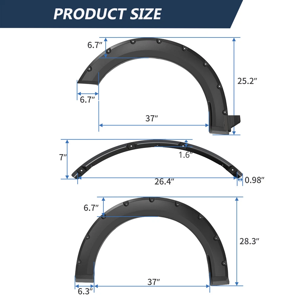Lamp Assembly Control Arms Floor Mats Catalytic Converters Cooling Systems Coils & Modules Mirrors Wheel Lugs Exhaust Shocks & Struts Other PRODUCT DESCRIPTION Compatible With: 2021-2022 Ford F150 F-150 Features: PREMIUM PP MATERIAL Each set of Fender Flares is made of premium material to ensure that the fenders are brighter and more durable. EASY TO INSTALL Accurate trimming to fit the wheels perfectly. Installation manual and necessary mounting hardware kit are included in the package. UV PROTECTION Add UV powder during the production process to ensure that the fender flares are free of chalking and cracking. Matte black finish design, it could be painted according to the specific color of your vehicle. OFF ROAD LOOK Protect the wheel well from mud, scratches and other external damage. Package Included : 4pcs Fender Flares (front & rear) Mounting hardware Installation instruction SHIPPING The shipping rates listed are only for residential or commercial destinations in the continental 48 United States. All international sales will go through eBay Global Shipping Program.Please ask us if there are any questions. We only ship the item to the address that is sent to us at the time of checkout. Please verify the correct shipping address in your PayPal account before making your payment. If we ship your item to an old or invalid address and you are not able to locate the item, we are not responsible for shipping a replacement. Currently, we do not ship to Hawaii, Alaska, Puerto Rico,APO/FPO/PO Boxes. We use USPS, UPS & FedEx as shipping method. Payments cleared before 12 PM PST, will be shipped on the same day. PAYMENT We accept PayPal and all forms of credit card. We will only ship to the confirmed Paypal shipping address given with the payment. We do not offer local pick up service. RETURN 30 days Money Back Guarantee. If any package that needs to be returned, please contact our customer service first to receive a RMA form. All return items MUST be in brand new condition. ABOUT US Specialized in aftermarket auto parts since 2012, we source and work directly with professional manufacturers to provide the highest quality parts at the most economical prices. We also have over 5 years of shipping experience with FedEx and USPS.Our Packing Quality is Guaranteed,Item shipping is Timely! On Jul 5, 2023 at 00:42:22 PDT, seller added the following information: On Jun 13, 2024 at 12:24:34 PDT, seller added the following information: