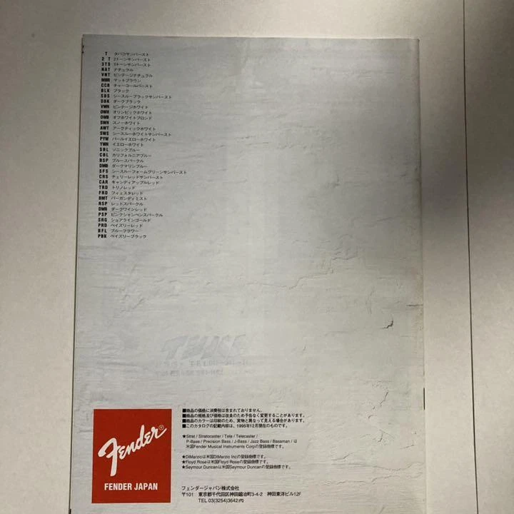 Item Title Fender Japan 1996 Catalog 35 Pages Payment Supports managed payments Please pay within 5 days after auction is finished. About Us We are located in Japan. It's our pleasure to make you happy by proposing our recommend item. If you have any questions or request about items, please feel free to ask us. International Buyers - Please Note: -Import duties, taxes, and charges are not included in the item price or shipping charges. These charges are the buyer's responsibility. -Please check with your country's customs office to determine what these additional costs will be prior to bidding/buying. -These charges are normally collected by the delivering freight (shipping) company or when you pick the item up - do not confuse them for additional shipping charges. -We do not mark merchandise values below value or mark items as - gifts - The US and International government regulations prohibit such behavior. Thank you for your understanding.