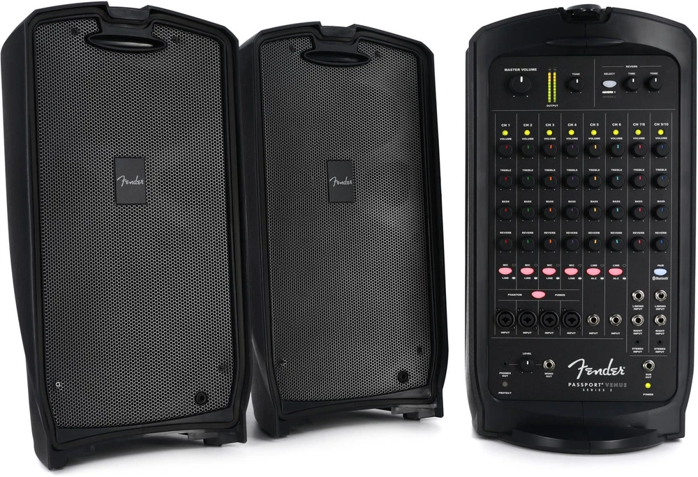 Power-packed Portable PA The portable Fender Passport Venue S2 delivers the stellar PA sound you're looking for! Don't let its compact size fool you; the Passport Venue S2 pumps out 600 watts of power. The Passport Venue S2's integrated 10-channel mixer has plenty of inputs — suitable for a bands, DJ gigs, large meetings, panel discussions, worship services, and more. Each channel is equipped with a volume and tone control to shape the sound of your voice or instrument, and a 20dB pad helps to protect the speakers from hot sources. Custom-designed Fender drivers provide detailed and clear sound void of the unpleasant boxiness that plagues some portable PA systems. Additionally, the Passport Venue S2 is Bluetooth-equipped for streaming audio between sets and during meetings and events. Packed with functionality, the Fender Passport Venue S2 portable PA has what you need for your gigs and events — available from Sweetwater Sweetwater is an Authorized Fender Dealer Genuine Open Box Item Sweetwater's 2-year warranty Fender Passport Venue S2 Portable PA System 600W, 7-channel Portable PA System with 5 Mic/Line Inputs, 2 Instrument/Line Input, 3 Stereo Inputs, Two Speakers, and Bluetooth Compatibility Power-packed Portable PA The portable Fender Passport Venue S2 delivers the stellar PA sound you're looking for! Don't let its compact size fool you; the Passport Venue S2 pumps out 600 watts of power. The Passport Venue S2's integrated 10-channel mixer has plenty of inputs — suitable for a bands, DJ gigs, large meetings, panel discussions, worship services, and more. Each channel is equipped with a volume and tone control to shape the sound of your voice or instrument, and a 20dB pad helps to protect the speakers from hot sources. Custom-designed Fender drivers provide detailed and clear sound void of the unpleasant boxiness that plagues some portable PA systems. Additionally, the Passport Venue S2 is Bluetooth-equipped for streaming audio between sets and during meetings and events. Packed with functionality, the Fender Passport Venue S2 portable PA has what you need for your gigs and events — available from Sweetwater now! Class D power amp for clear, powerful audio The Fender Passport Venue S2 comes loaded with a powerful Class D power amp that produces bright and intelligible tone perfect for small to medium-sized venues. The 2-speaker system is great for DJs and live performers, who will love the rich, full sound of this versatile, small-form-factor PA. It's also ideal for presentations and speeches. Take it from the Sweetwater crew — the Fender Passport Venue will give you years of exceptional performance. Designed for your portable PA needs Compact and portable, the Fender Passport Venue is perfect for traveling musicians, with a durable construction that can withstand a rigorous performance schedule. The intuitive controls are simple to use — so you don't have to be a professional audio engineer to get a great sound. With a 1/8" stereo input and Bluetooth compatibility, piping in streaming audio and pre-recorded material is effortless. The Fender Passport Venue S2 provides you with all the tools you need to deliver impressive event audio. Fender Passport Venue S2 10-channel Portable PA Features: Portable 10-channel PA system that offers big sound in a small footprint 600W Class D-powered PA delivers crystal-clear highs and thundering lows Inputs: 4 x XLR, 1 x TRS, 2 x TS, 2 x 1/4" stereo, and 1 x 1/8" stereo Controls: 2-band EQ, Volume, Reverb, and 20dB pad for each channel Bluetooth-equipped for streaming audio Perfect for solo performers, small ensembles, and speaking presentations Specification Detail Type Portable PA System Speaker Drivers 2 x 10" LF, 2 x 1.2" HF Number of Mixer Channels 10 Number of Mic Preamps 4 Phantom Power Yes, Global EQ 8 x 2-band Effects Reverb Inputs 4 x XLR-1/4" combo (mic/line), 2 x 1/4" (Line/Hi-Z), 4 x 1/4" (L/Mono, R), 2 x 1/8" (aux in) Outputs 2 x 1/4" (4 ohm), 2 x 1/4" (line, sub), 1 x 1/8" (headphones) Bluetooth Yes Total Power 600W Class D Enclosure Material Molded Plastic Mounting Options Pole, Floor Power Source Standard IEC AC power cable Height 23" Width 29" Depth 11" Weight 48 lbs. RETURN INFORMATION We want you to be completely happy with your purchase from Sweetwater. If you are not satisfied with your product, you may return it for a refund of the purchase price within 30 days. If your purchase was eligible for Free Shipping, the shipping cost will be deducted from your credit or refund. Returns must be in the complete and original packaging with all accessories and complete documentation (Owner's Manual, warranty card, quick start guides, etc.), show no signs of wear or use, and include a Return Authorization number or be subject to a restocking fee.