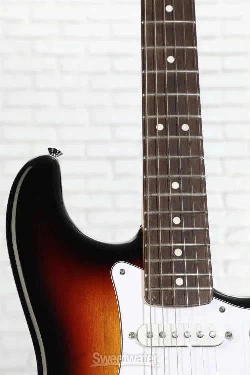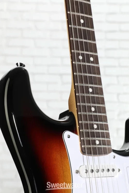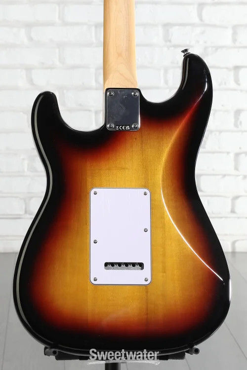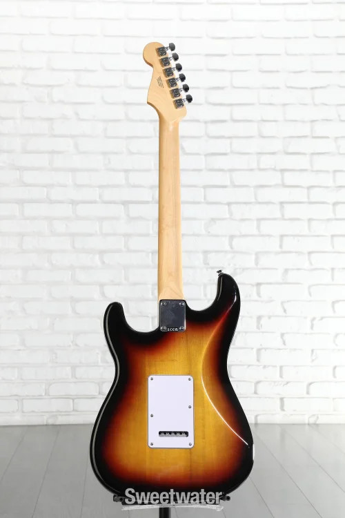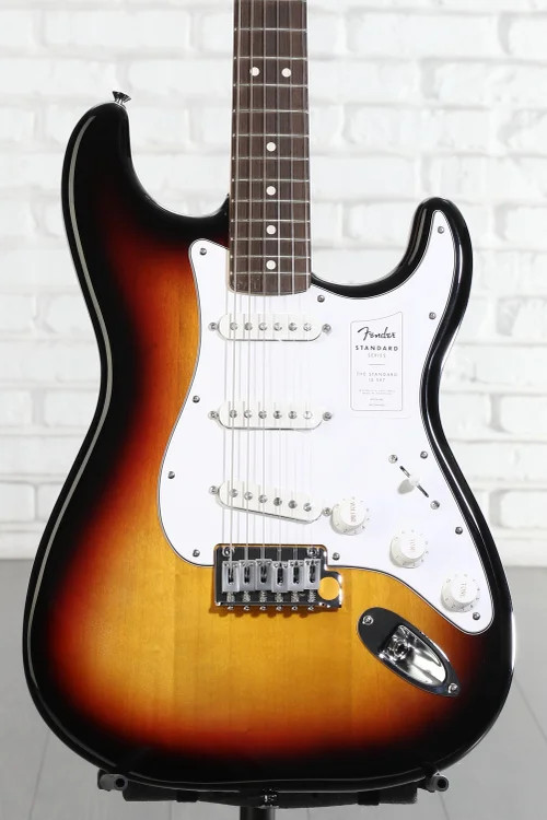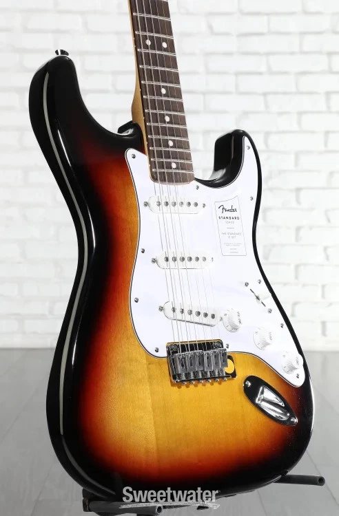 A Standard Approach to an Iconic Guitar When you’re ready to experience quintessential Fender design and playability, look no further than the Fender Standard Stratocaster. Built with the player in mind, the standard design allows beginners and aficionados alike to experience essential Fender features that make the brand’s guitars the first choice of so many Sweetwater guitarists. With a satin-finished and time-tested modern C-shaped neck and a 9.5-inch-radius Indian laurel fingerboard, this guitar is immensely comfortable for both chords and individually fretted notes. The Standard Single-coil Strat pickups offer the iconic snappy tone, with high-output ceramic magnets that offer a more aggressive sound at full volume. Achieve patented Strat vibrato and dynamic versatility with the onboard 2-point synchronized tremolo system, complete with even tension that is easy to use and stays in tune. Whether you’re buying your first guitar or looking to add some Strat sparkle to your collection, the Sweetwater is an Authorized Fender Dealer Genuine Open Box Item Sweetwater's 2-year warranty* and 55 point inspection Fender Standard Stratocaster Electric Guitar - 3-color Sunburst Solidbody Electric Guitar with Poplar Body, Maple Neck, Laurel Fingerboard, 3 Single-coil Pickups, and Tremolo - 3-color Sunburst A Standard Approach to an Iconic Guitar When you’re ready to experience quintessential Fender design and playability, look no further than the Fender Standard Stratocaster. Built with the player in mind, the standard design allows beginners and aficionados alike to experience essential Fender features that make the brand’s guitars the first choice of so many Sweetwater guitarists. With a satin-finished and time-tested modern C-shaped neck and a 9.5-inch-radius Indian laurel fingerboard, this guitar is immensely comfortable for both chords and individually fretted notes. The Standard Single-coil Strat pickups offer the iconic snappy tone, with high-output ceramic magnets that offer a more aggressive sound at full volume. Achieve patented Strat vibrato and dynamic versatility with the onboard 2-point synchronized tremolo system, complete with even tension that is easy to use and stays in tune. Whether you’re buying your first guitar or looking to add some Strat sparkle to your collection, the Standard Stratocaster offers all the playability, tonality, and style a Fender guitar can provide. Tried-and-true design The Fender Stratocaster is one of the most widely recognized and popular electric guitar designs worldwide. Its S-shaped body features dual cutaways for easy fretboard access, and its sleek tapered edges are comfortable for any player. This Standard Stratocaster is a no-frills representation of that legacy, capturing the beloved style and sound in one approachable instrument. Versatile single-coil pickups With three ceramic single-coil pickups, the Standard Strat offers a spectrum of tonal variety. The Standard Single-coil Strat pickups supply bright, smooth, clean tones that are at home in any genre, with high-output ceramic magnets that can push your amp into crunchier tones. This versatile guitar makes the perfect platform for experimenting with your sound and dialing in your setup. Use it to practice or perform across various styles with multiple techniques. C-shaped perfection The Standard Stratocaster's neck sports Fender's much-loved modern C shape. Combined with the 9.5-inch radius of the fretboard, this neck is excellent at reducing tension in your hand. Easy to play, the maple neck fits comfortably in the hand, allowing plenty of room to fret complex chords, pick out simple melodies, or shred through scales. The satin finish is smooth without being tacky, keeping your movements fluid, while the Indian laurel fretboard adds a splash of darkness to the guitar’s aesthetic. Fender Standard Stratocaster Features: Standard design offers Fender style with essential Stratocaster playability and features Satin-finished modern C maple neck with Indian laurel fingerboard maximizes speed and comfort 9.5-in. fingerboard radius is comfortable, smooth, and accessible Standard Single-coil Strat pickups supply iconic snappy tone with high enough output for crunchier tones 2-point synchronized tremolo system is easy to use and stays in tune Specification Detail Model Standard Stratocaster Number of Strings 6 Left-/Right-handed Right-handed Body Type Solidbody Body Shape Stratocaster Body Material Poplar Color 3-Color Sunburst Body Finish Gloss Polyurethane Neck Material Maple Neck Finish Satin Urethane Neck Shape Modern C Neck Joint Bolt-on Radius 9.5" Fingerboard Material Indian Laurel Fingerboard Inlay Dots Number of Frets 21 Fret Type Medium Jumbo Scale Length 25.5" Nut Width 1.6875" Nut Material Micarta Bridge/Tailpiece Fender Standard 2-Point Tremolo with Satin Chrome Steel Block Saddles Tuners Fender Standard Cast/Sealed Neck Pickup Fender Standard Strat Single-coil Middle Pickup Fender Standard Strat Single-coil Bridge Pickup Fender Standard Strat Single-coil Controls 1 x volume, 2 x tone Switching 5-way blade pickup switch Strings Nickel Plated Steel, .009-.042 Case/Gig Bag Sold Separately RETURN INFORMATION We want you to be completely happy with your purchase from Sweetwater. If you are not satisfied with your product, you may return it for a refund of the purchase price within 30 days. If your purchase was eligible for Free Shipping, the shipping cost will be deducted from your credit or refund. Returns must be in the complete and original packaging with all accessories and complete documentation (Owner's Manual, warranty card, quick start guides, etc.), show no signs of wear or use, and include a Return Authorization number or be subject to a restocking fee. Fast, FREE Shipping! Nearly every order received by 3PM Eastern ships the SAME DAY! FREE shipping to lower 48 states. Our central location reaches most states in 1-4 business days 99.95% warehouse accuracy We are proud