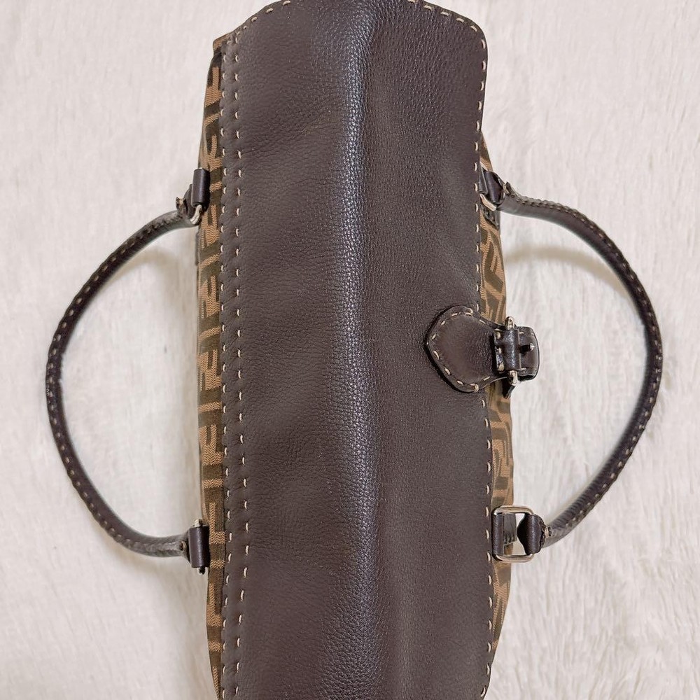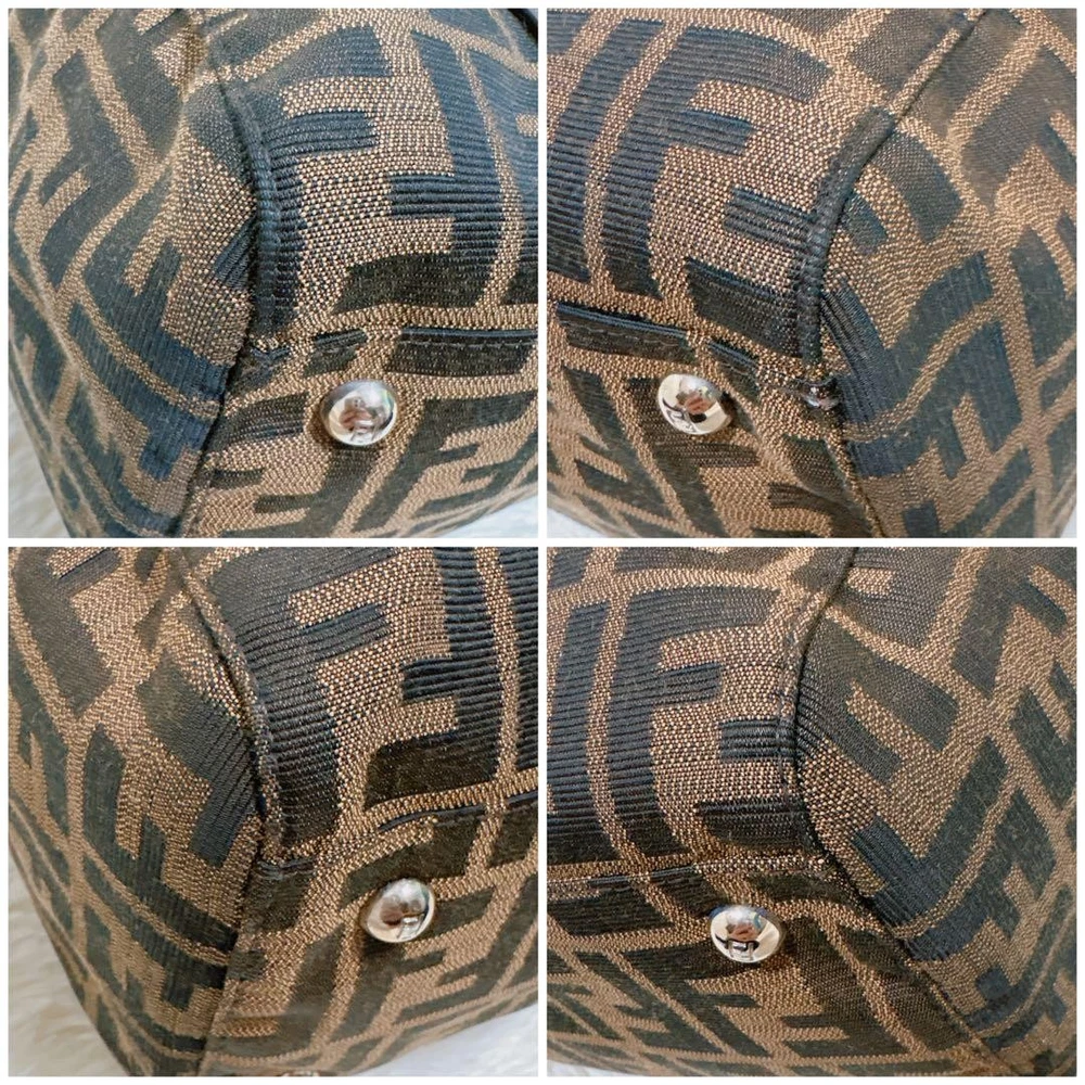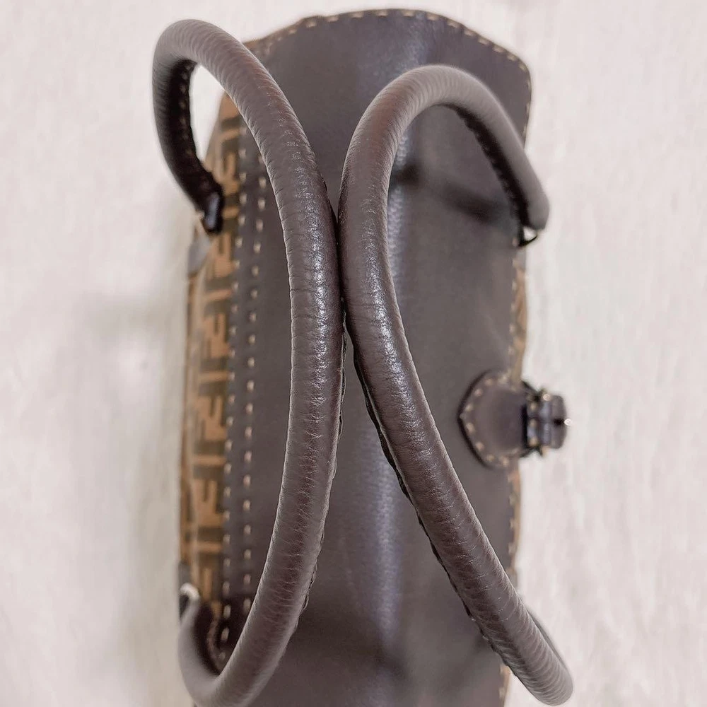 This is a Fendi Selleria Linda handbag featuring the iconic Zucca pattern combined with high-quality leather, showcasing a vintage charm. The dimensions are: Height 9.84 inches, Width 13.19 inches, Depth 4.33 inches, Handle Length 19.69 inches, and Handle Height 6.30 inches. It features a magnetic closure and one interior zipper pocket. There are some scuffs and stains on the interior and leather parts due to use, but it is in relatively good condition. The canvas part shows no noticeable stains or scuffs. Notably, there is a slight perfume odor. The color is brown and khaki (Zucca pattern). The materials are canvas and leather. I promise fast shipping via FedEx or DHL as soon as possible! Import duties, taxes and charges are not included in the item price or shipping charges. These charges are the buyer’s responsibility. These charges are normally collected by the delivering freight (shipping) company or when you pick the item up - do not confuse them for additional shipping charges.