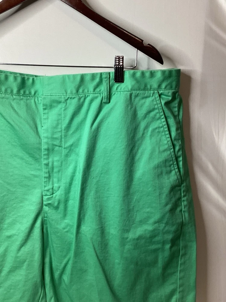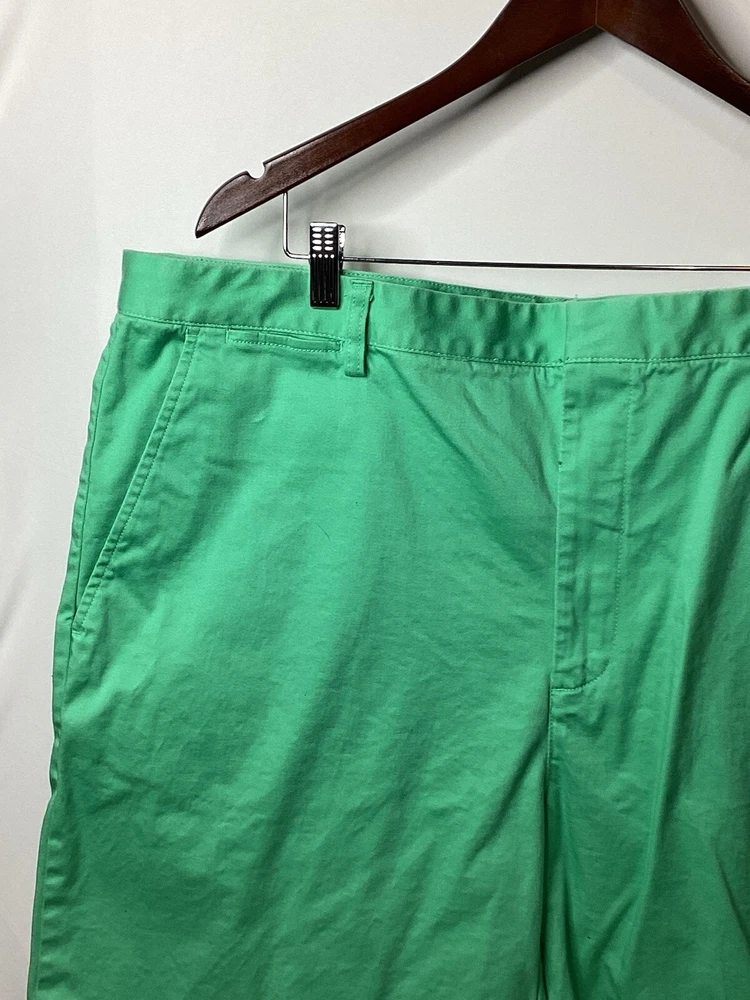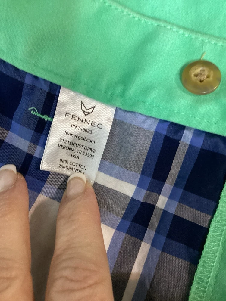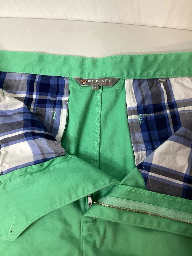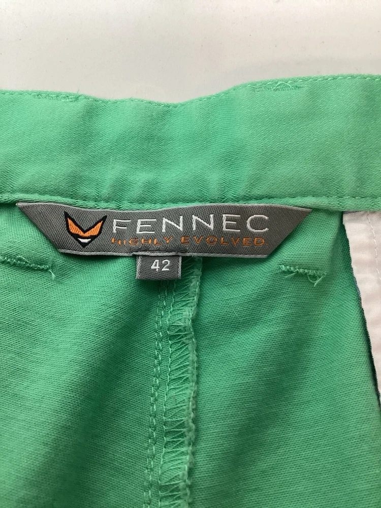 These Fennec Highly Evolved Men's Shorts in size 42 are a stylish choice for various occasions such as travel, casual outings, or even formal events. Made from green canvas fabric with a button accent, these chino-style shorts feature a flat front and a 9-inch inseam. The shorts are designed with a regular fit and have a mid-rise waist, making them comfortable and versatile for the summer, fall, and spring seasons. With features like easy care, stretch, and pockets, these American-themed shorts offer a blend of outdoor and preppy style for the modern man.