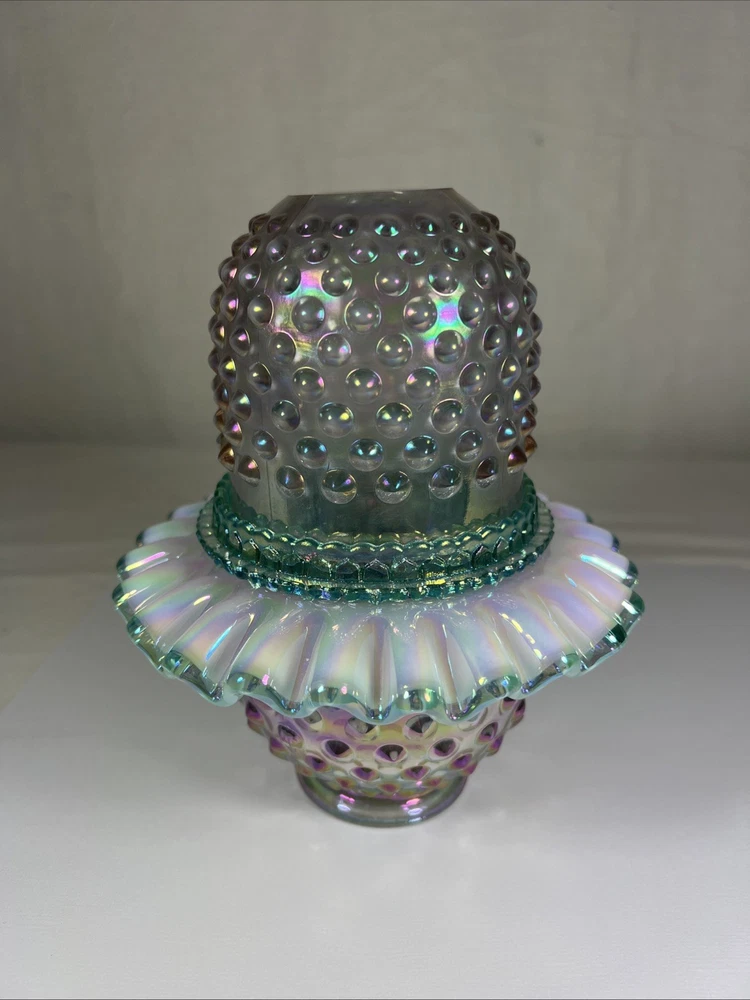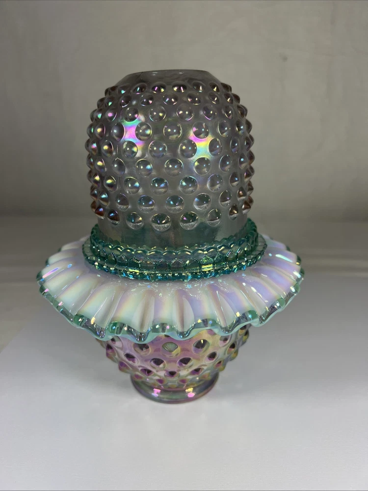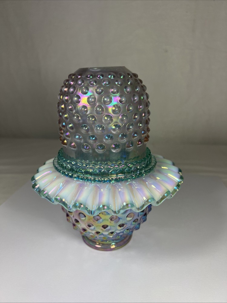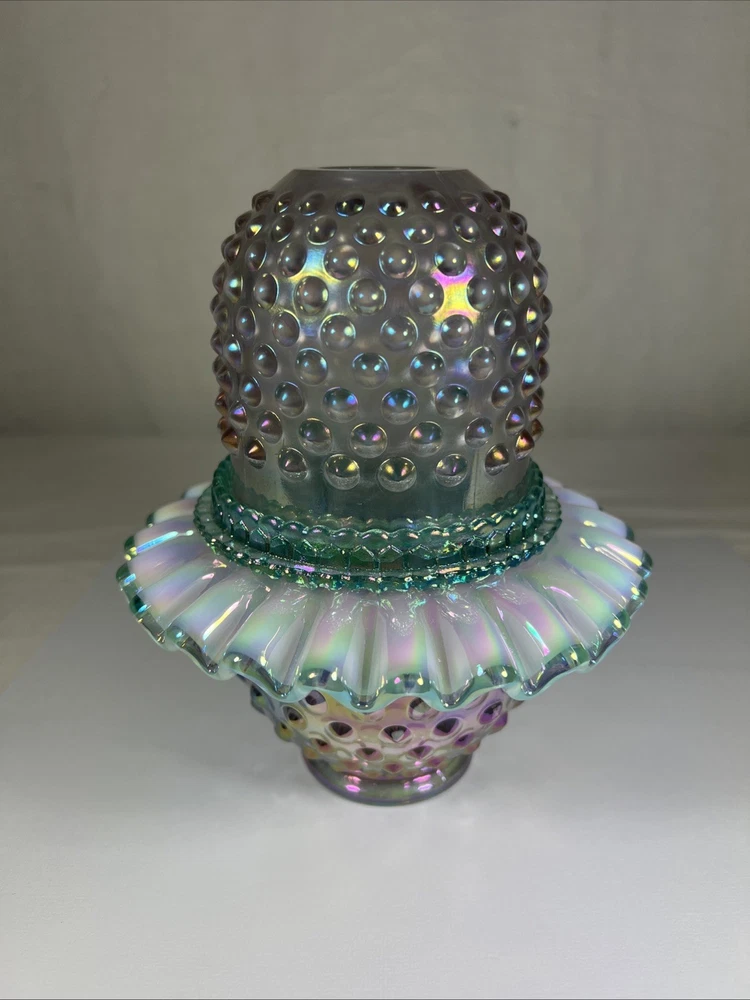 Number in Pack:1Subject:3 Piece Fairy LampColor:Rose Magnolia W/ Sea Mist Green InsertType:Candle HolderPattern:HobnailMaterial:GlassCountry of Origin:United StatesFinish:IridescentBrand:FentonStyle:1994