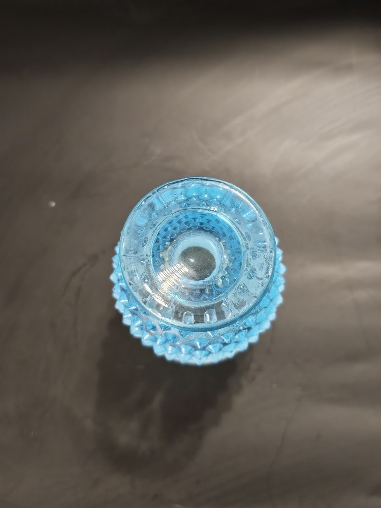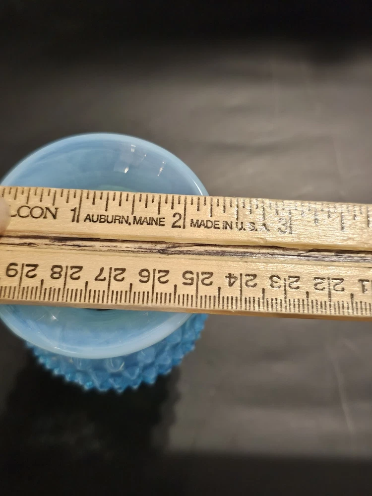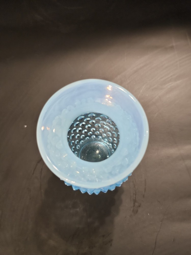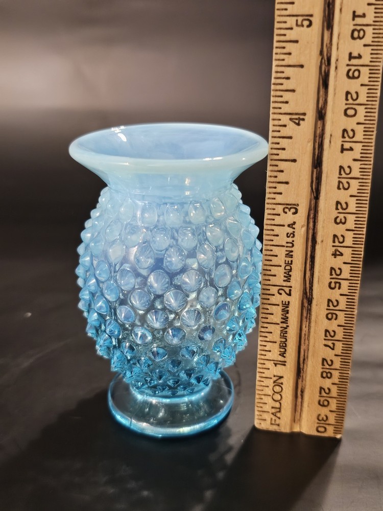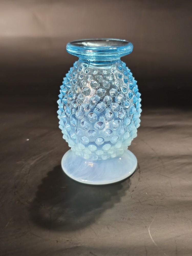 No chips or cracks. 2 available. Price is PER vase The Fenton Aqua Blue Opalescent Hobnail Small Flared Rim Bud Vase is a vintage piece of decorative glassware originating from North America. Handmade in the United States, this 3-1/2" vase features a beautiful glossy finish and a textured hobnail pattern, giving it a unique 3D effect. Crafted with opalescent glass in a studio setting, this vase adds a touch of elegance to any space with its vibrant blue color and Fenton brand reputation.