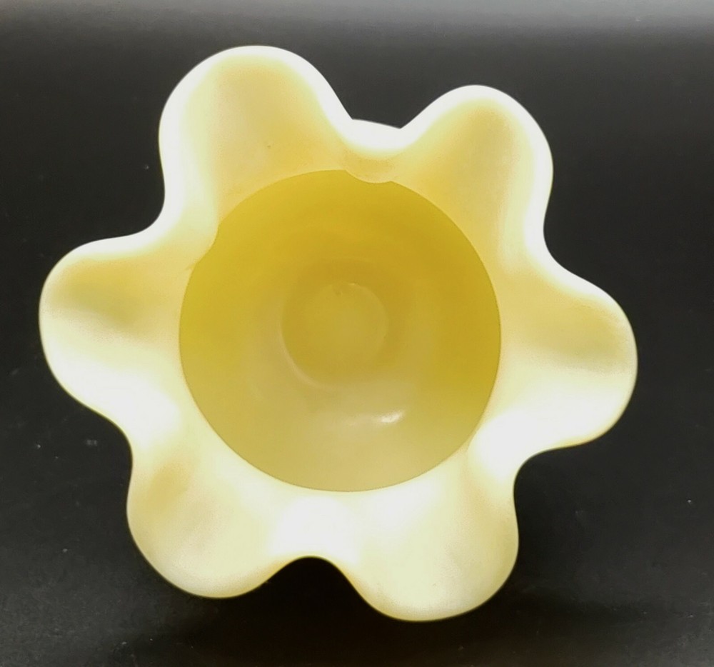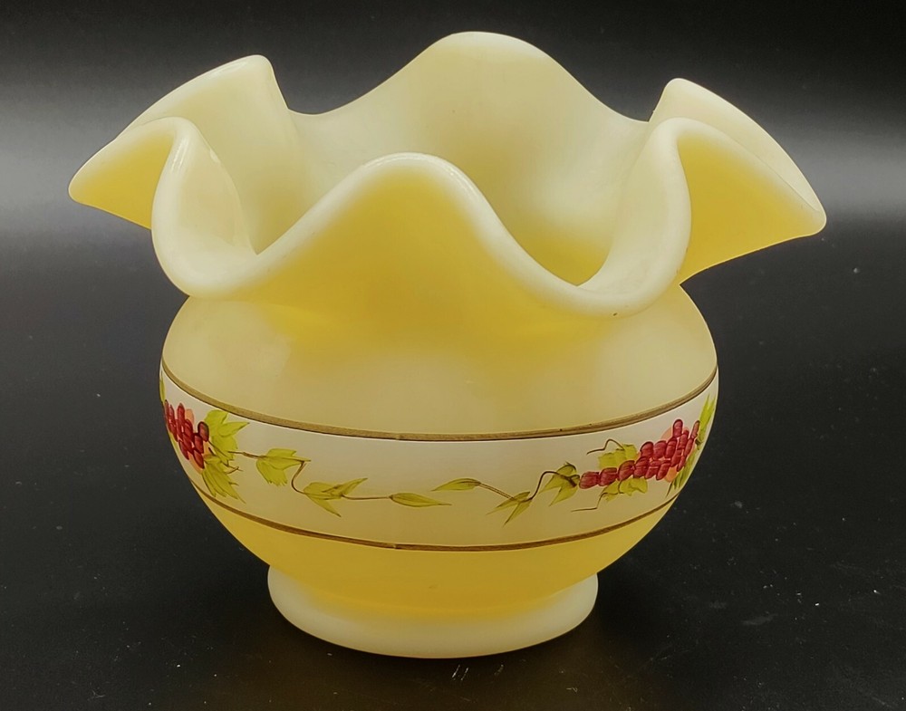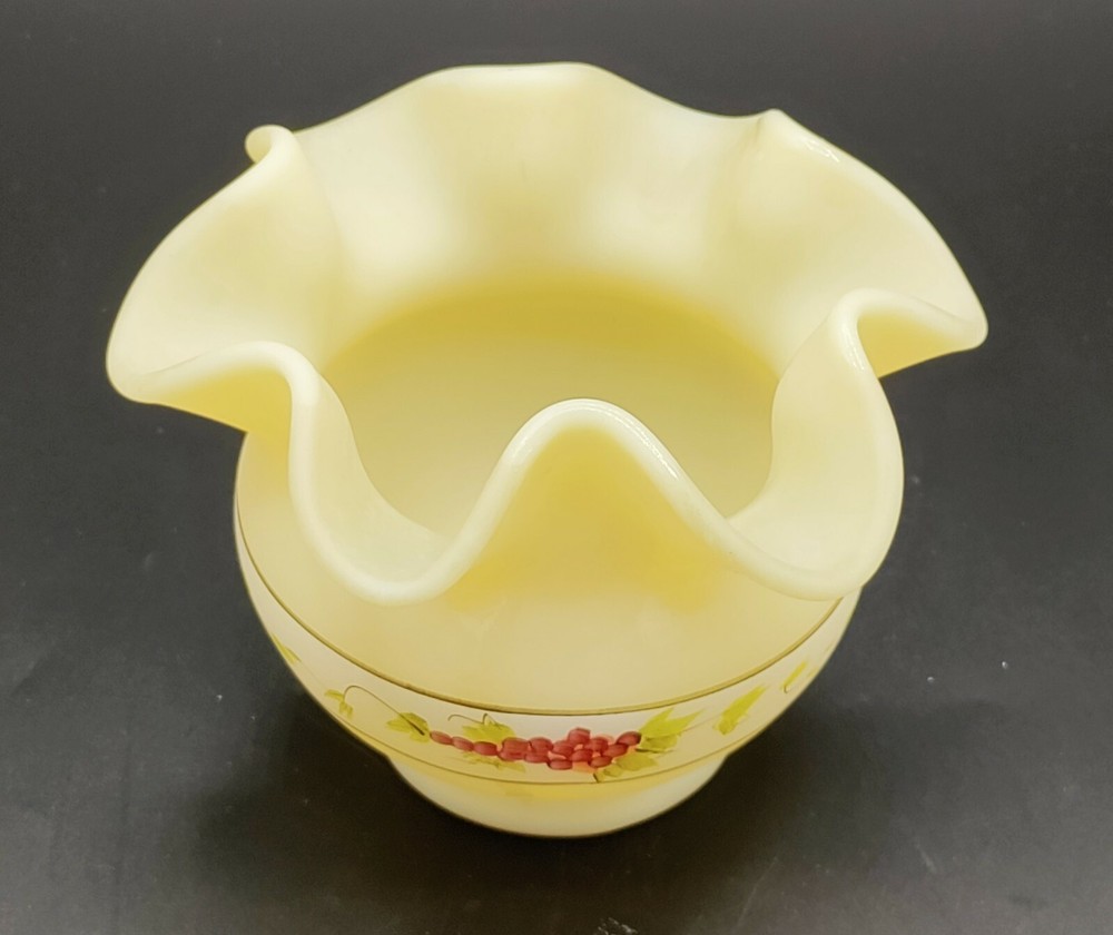 Fenton Art Glass Custard Satin Glass Vase Ruffled Grapes Signed Beverly C. measures 5-1/4" across x 3-3/4" tall Excellent condition, no damage Thanks for viewing!