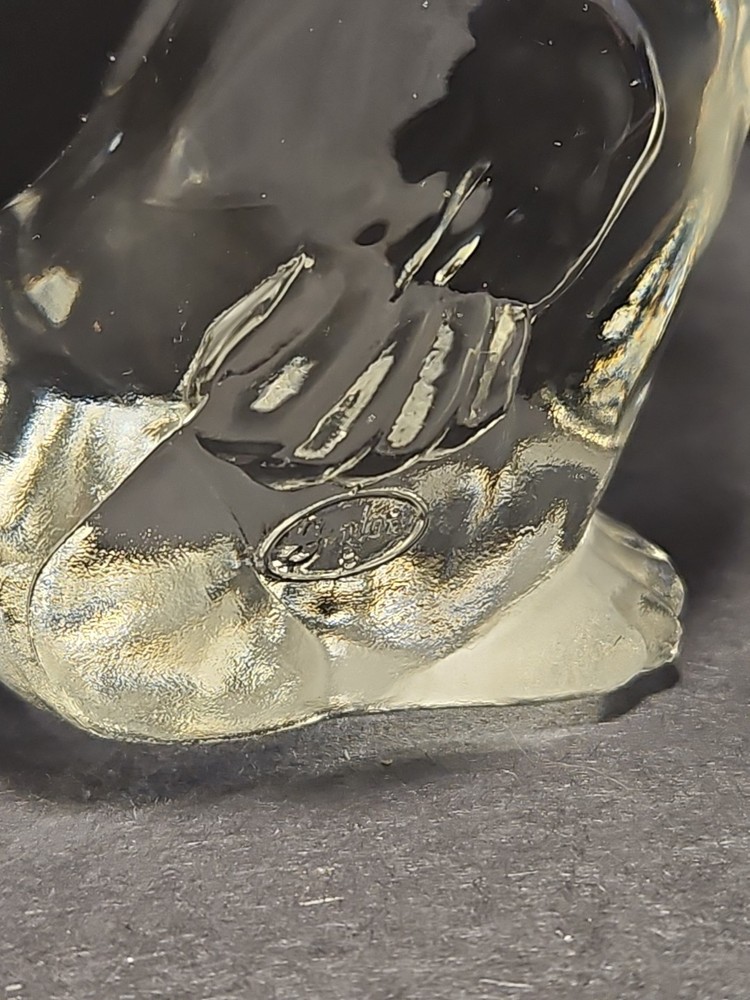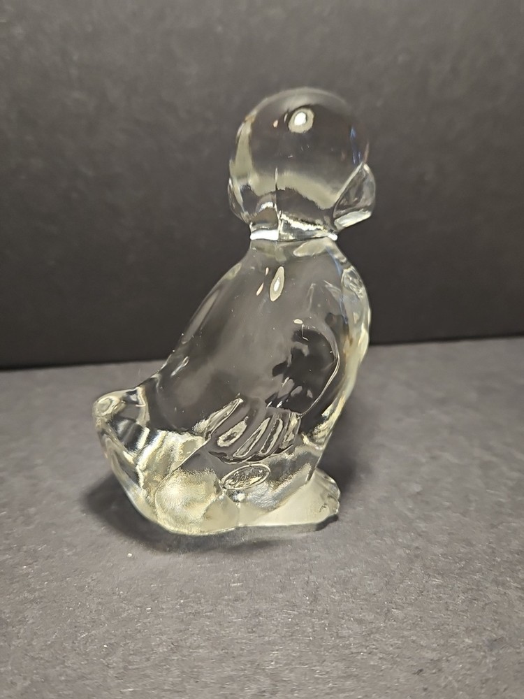 This Fenton Duckling figurine is a 3.5-inch tall piece of clear solid glass, featuring a glossy finish. Made in the United States during the late 20th century, this vintage collectible is part of the Glass Pets product line. The figurine depicts a duckling in an animal-themed design, making it a decorative and charming addition to any collection. With its original production technique of molded glass, this Fenton duckling figurine is a unique and detailed piece for collectors of decorative pottery and glassware.