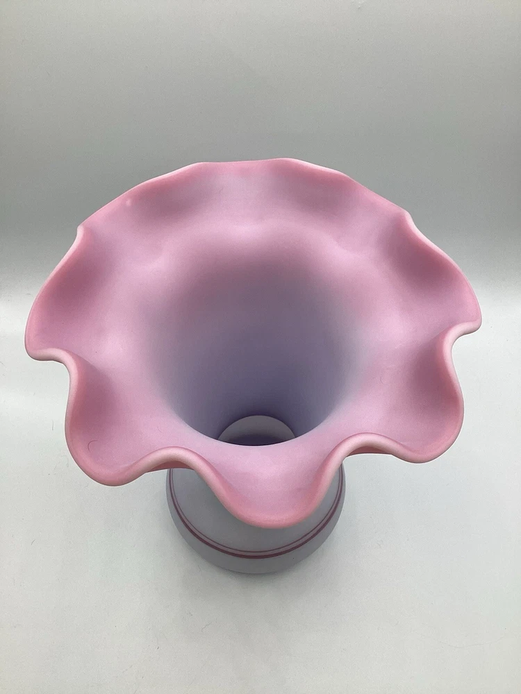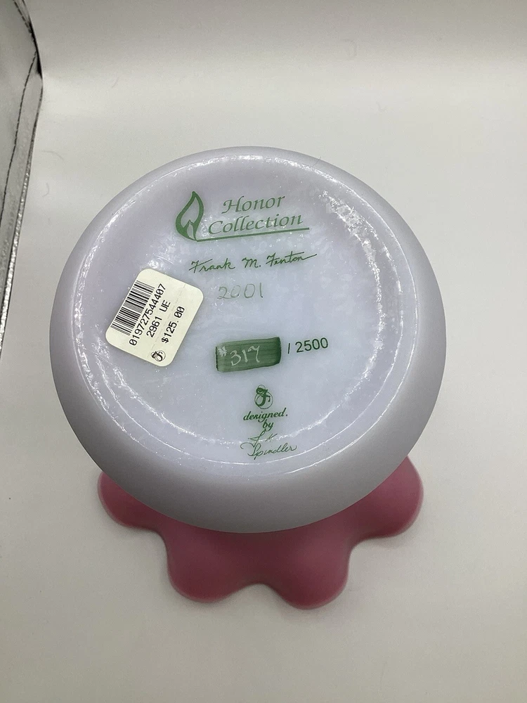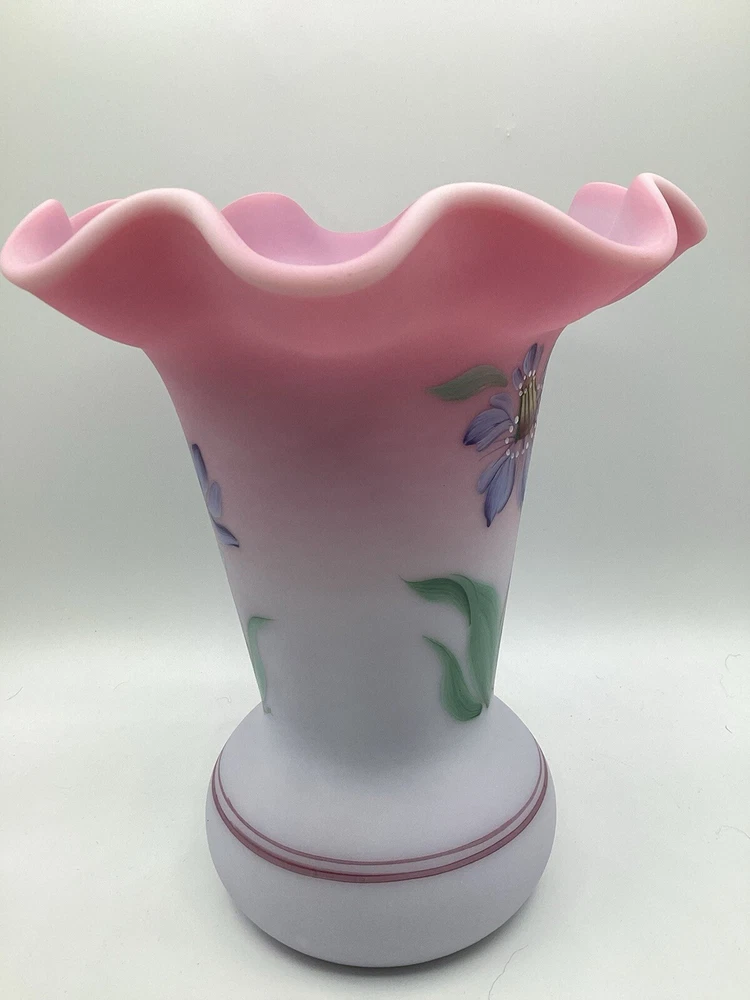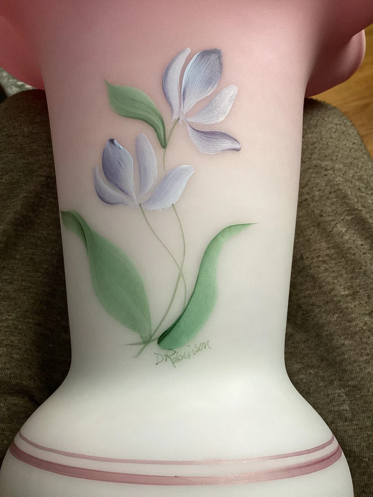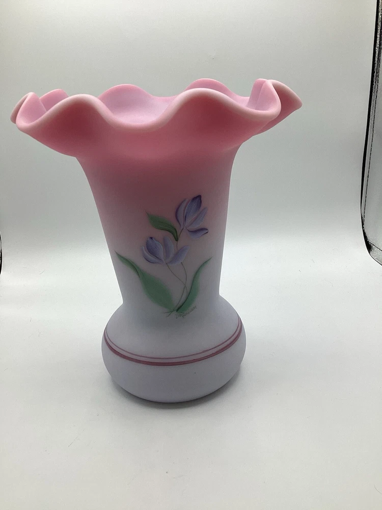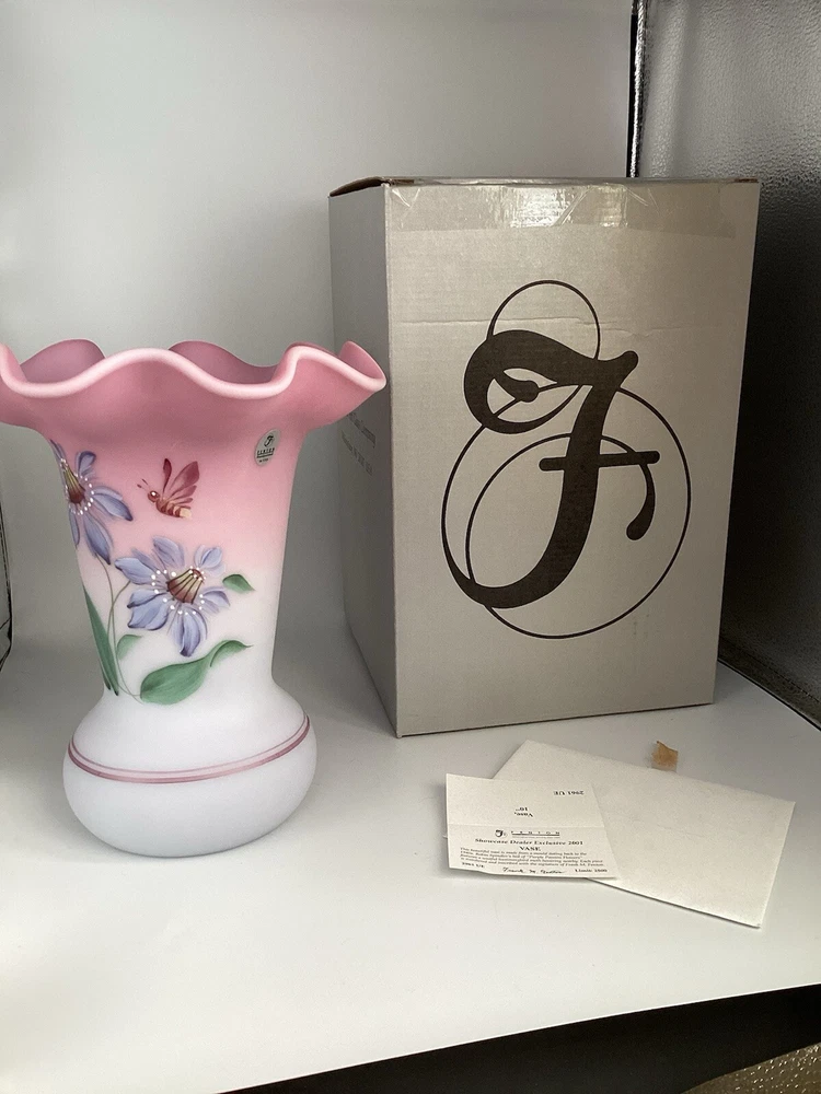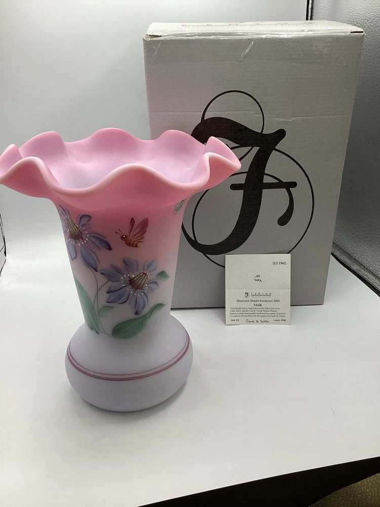 Fenton Ltd Ed Blue Burmese Honor Collection Showcase Dealer Exclusive 2001 Vase. This beautiful vase is designed by JK Spindler. Spindler’s bed of “Purple Passion Flowers” features a wistful hummingbird moth hovering nearby. Has beautiful purple flowers painted around the entire vase. It is hand painted and signed by the artist D. Robinson. The artist signature is signed underneath one of the flowers. Each piece is numbered and inscribed with the signature of Frank M Fenton. This piece is number 317 of only 2500. This vase is blue Burmese and is a showcase dealer exclusive piece. It is approximately 9 1/4” tall and the top opening is 8” across. There are no chips or cracks. Comes with the original box and card.