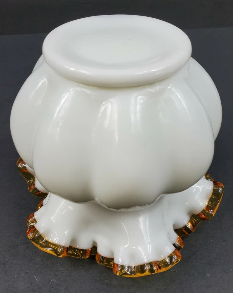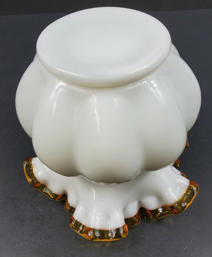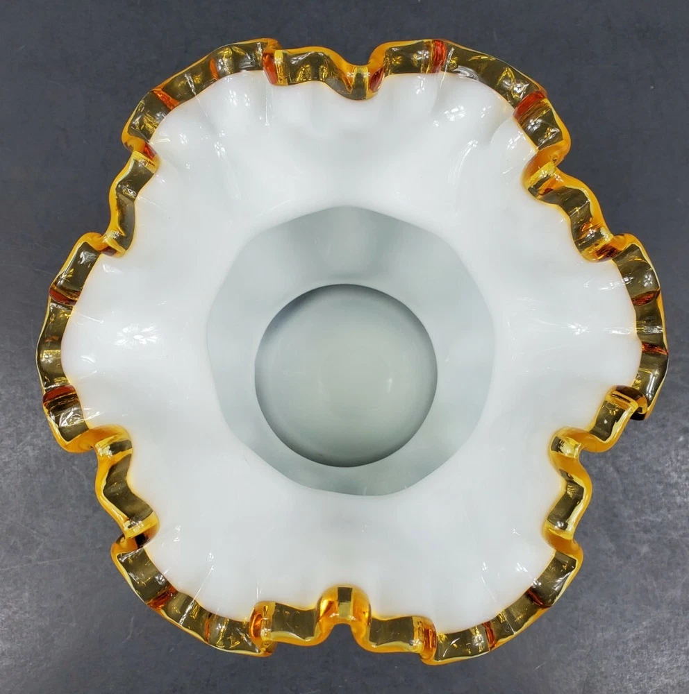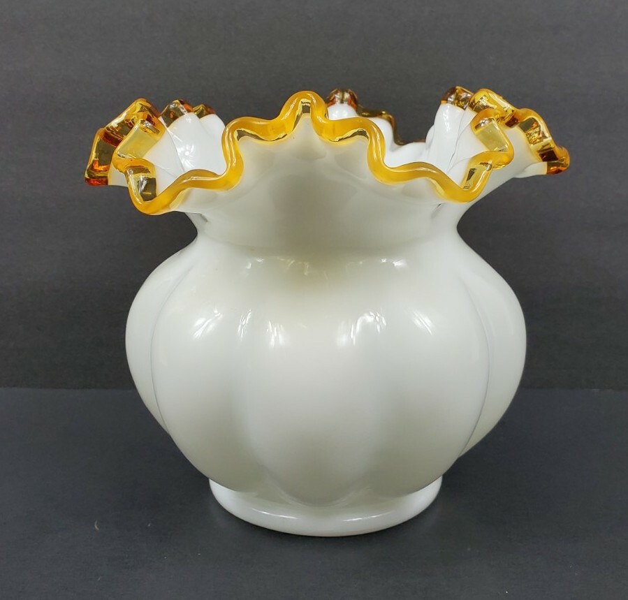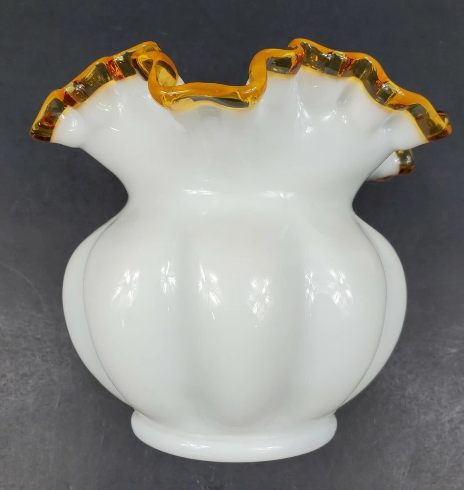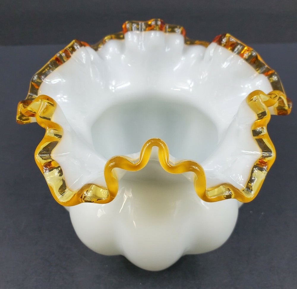 Fenton Milk Glass Amber Gold Crest Double Ruffled Melon Rose Bowl Vase EUC. No chips or cracks. Excellent condition. 6 5/8" wide, 5 1/2" tall. It weighs 1 lb 6.8 oz.