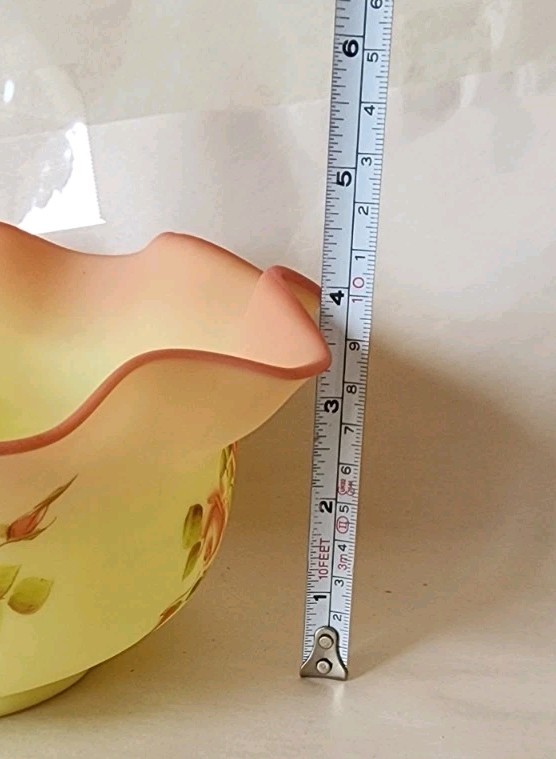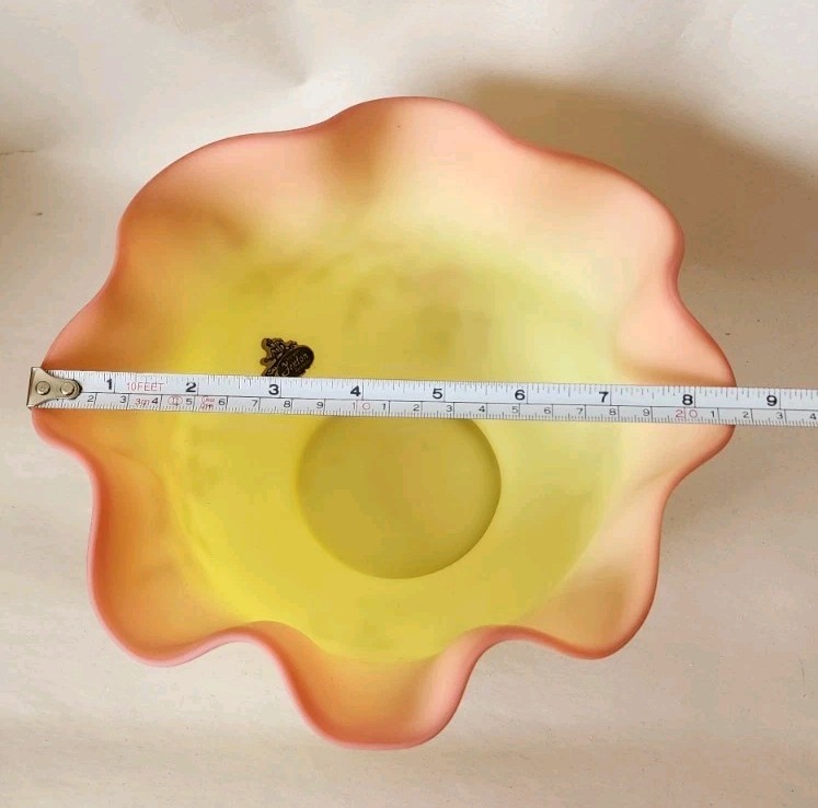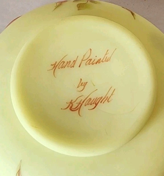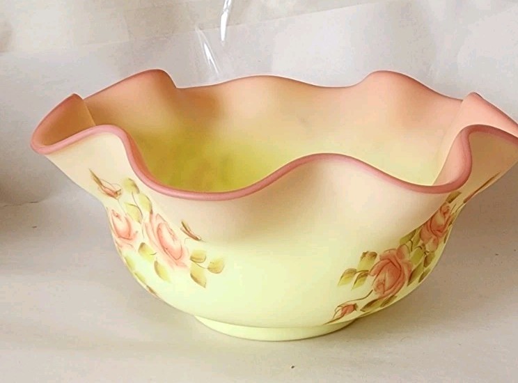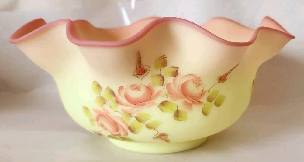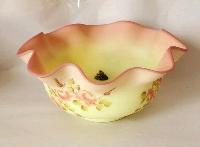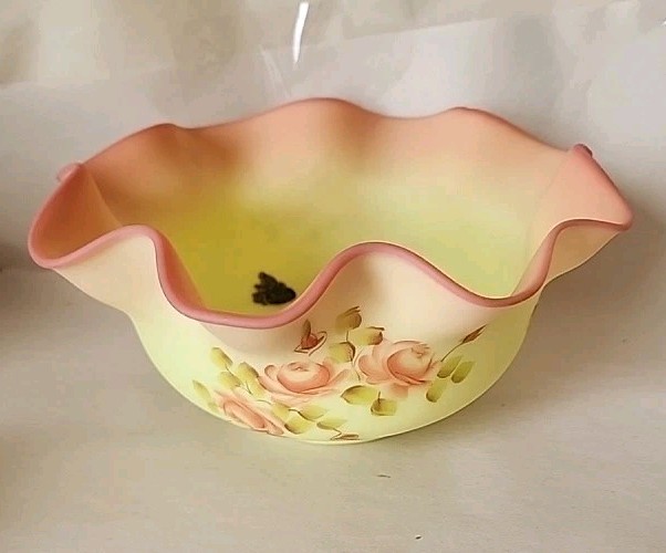 The product is an Fenton Pink Burmese Ruffled Edge Roses 8.5" Bowl, made of glass in the United States. The original piece features a multi-color design and is marked with an original sticker, showcasing its authentic and genuine craftsmanship, hand painted by K. Haught. Perfect for collectors of decorative items, this bowl adds a touch of elegance and charm to any space with its unique and intricate design.