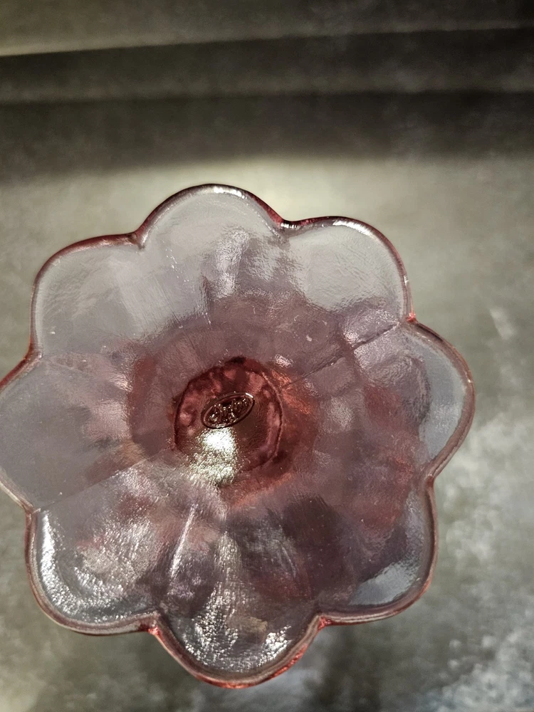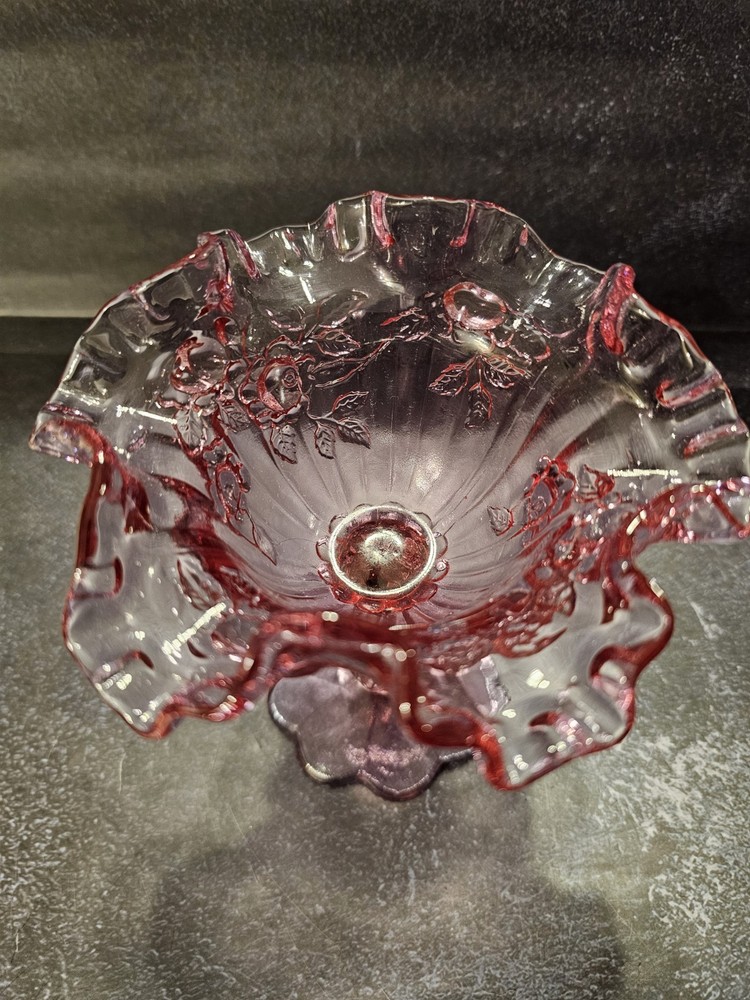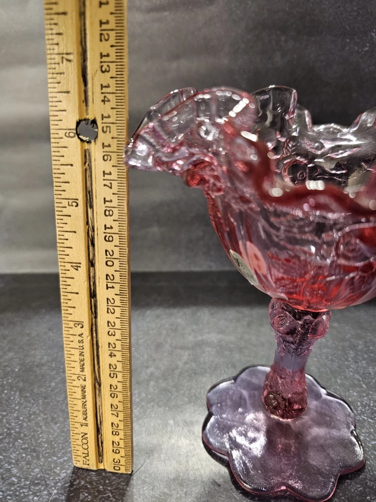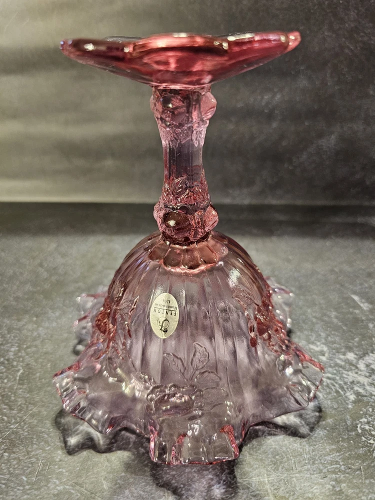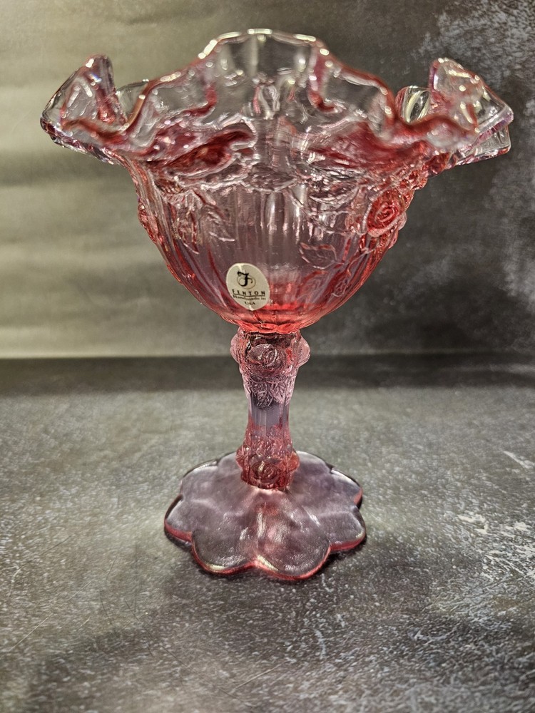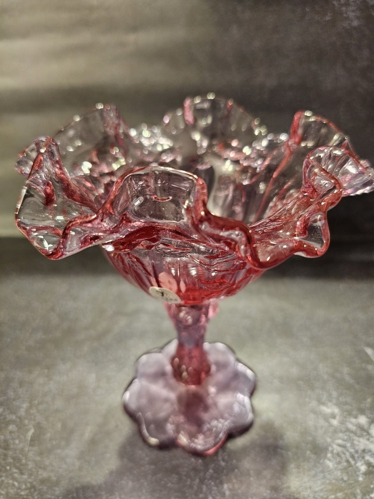 perfect condition! Experience the charm of vintage Fenton art glass with this exquisite rose pink cabbage rose ruffled pedestal compote dish. Elegantly crafted in the 1960s, this piece showcases the classic beauty of fused glass with a glossy finish that enhances its timeless appeal. Perfect as a standalone statement piece or as part of a curated collection, this compote is a testament to the enduring allure of Fenton's artful designs. The dish features a round shape with a single compartment, ideal for housing candies, small treats, or simply as a decorative element to add a touch of elegance to any room. Made in the United States, this original piece bears the distinguished mark of Fenton's craftsmanship, making it a must-have for enthusiasts and collectors alike.