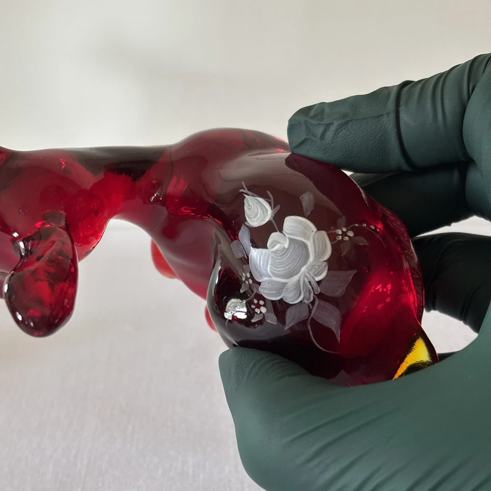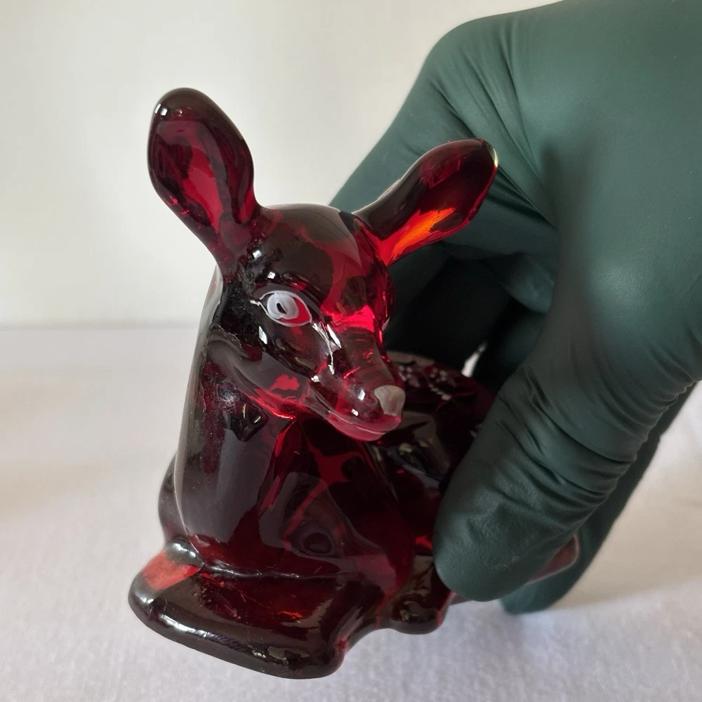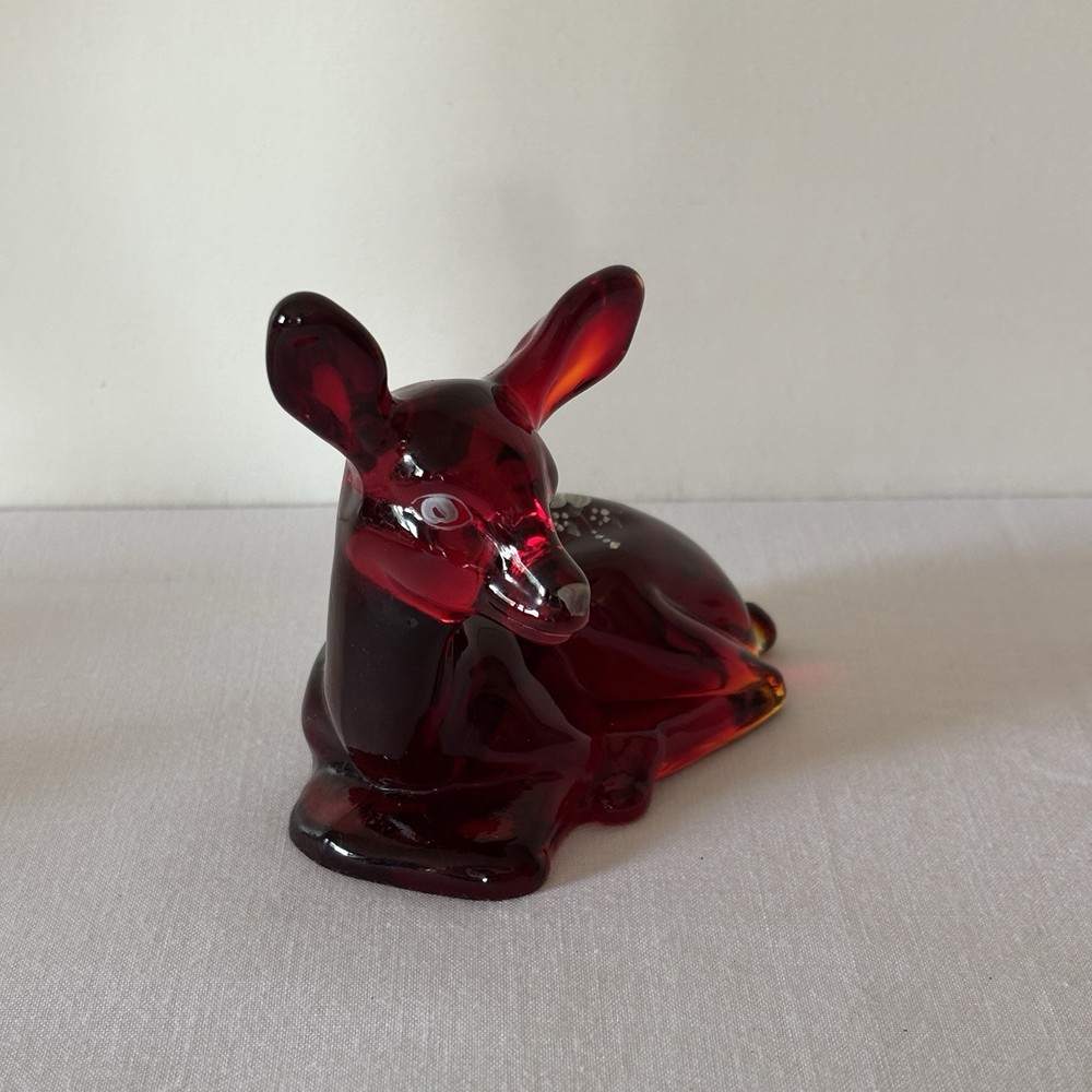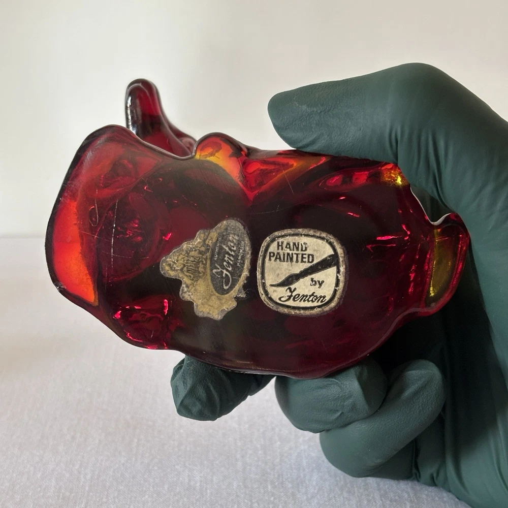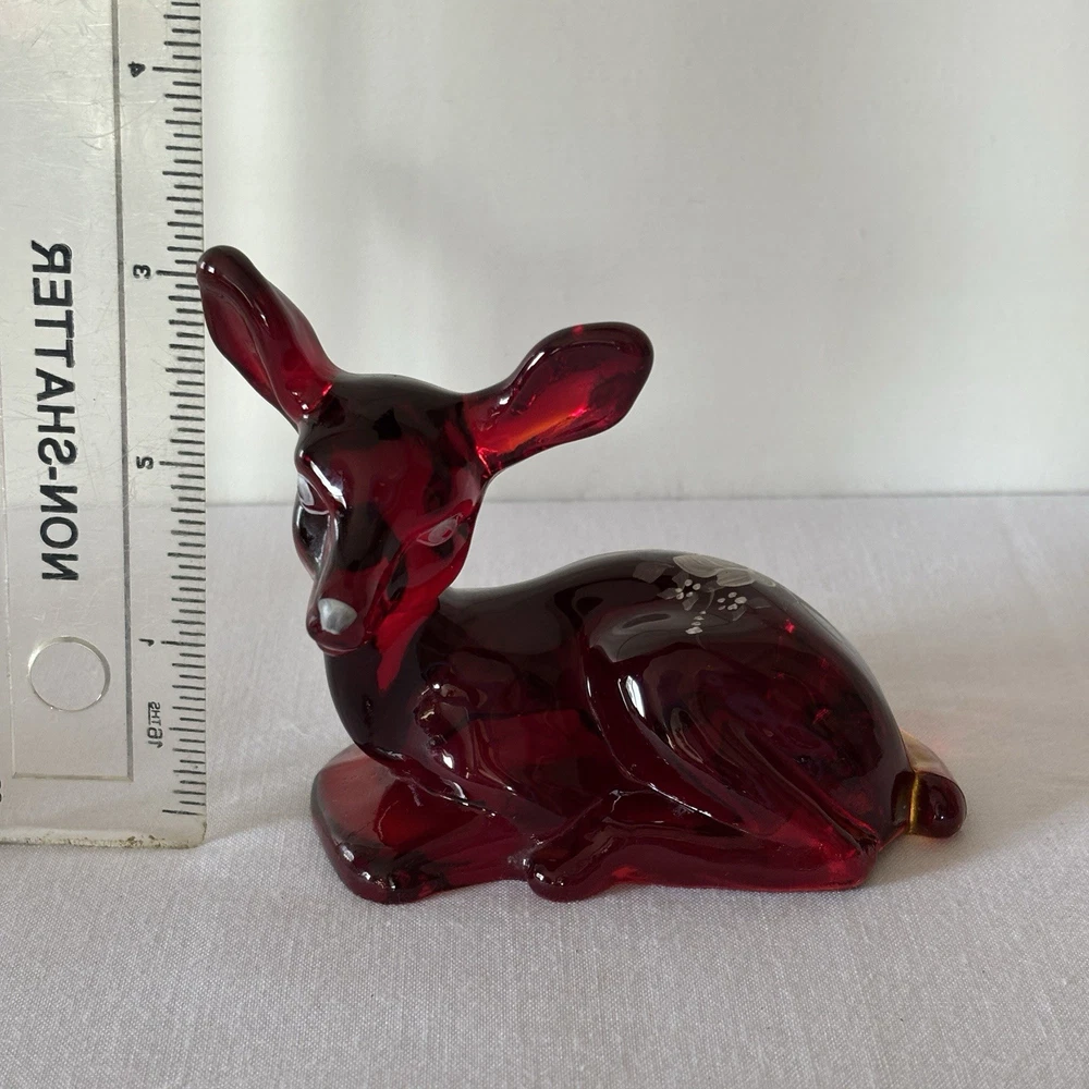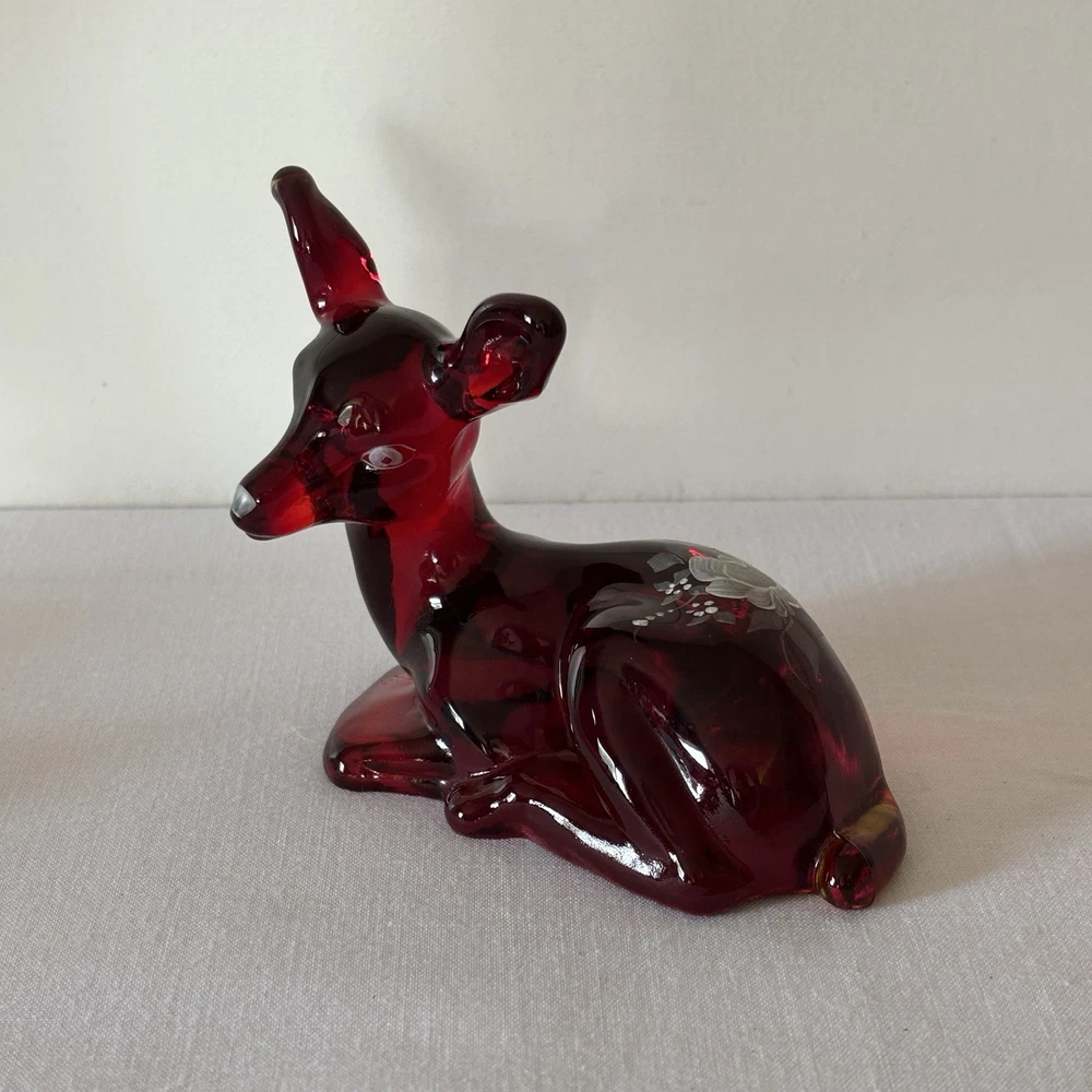 Fenton Ruby Red Glass Deer Figurine – Hand Painted – Signed Donna R or K – Original Labels This listing is for a stunning Fenton ruby red glass deer figurine in a resting pose, featuring hand-painted white floral detailing. The piece is signed “Hand painted by Donna R” or “Donna K” (signature is slightly unclear) and retains both original Fenton stickers on the base. Details: • Deep ruby red glass with rich translucence • Hand-painted white floral motif on the back • Artist signature: Hand painted by Donna R or Donna K • Includes both the “Hand Painted by Fenton” label and partial original Fenton logo sticker • Please refer to photos for exact dimensions and scale Condition: Excellent vintage condition. No chips, cracks, or repairs noted. The paint is crisp and intact. The original labels are present, though one shows some age-related wear. Uses: • A gorgeous addition to any Fenton or art glass collection • Beautiful decor for display shelves, curio cabinets, or holiday scenes • Lovely gift idea for deer lovers, collectors, or as a symbol of gentleness and peace A rare and charming signed piece showcasing the craftsmanship and hand-painted artistry Fenton is known for. ⸻ Welcome to The Gay Delphinium! I offer a variety of vintage items, such as books, toys, and more. These items naturally show signs of age and wear, which adds to their unique charm. What you see in the photos is exactly what you’ll receive. I strive to mention any notable flaws, broken parts, or missing pieces in my listings, but if you have any questions or need more details, please don’t hesitate to reach out. I usually ship within 2–5 business days, but please note that I ship from rural Canada, and while I do my best to get your items to you as quickly as possible, shipping can sometimes take a bit longer, especially during the winter months. Save on shipping by bundling items from my shop! If it doesn’t show up automatically, just send a message and we’ll get it sorted out. If you happen to notice any mislabeling or errors in my listings, I would greatly appreciate you letting me know! Thank you for supporting my shop, and I hope you find something special! Returns & Condition All items are sold AS-IS and described to the best of my ability. Photos are part of the description, please review them carefully and ask any questions before purchasing, especially if you have dealbreakers. By completing a purchase, you acknowledge that you have read the full description and examined all photos. Minor variations, wear, or imperfections shown in the photos are considered part of the item?s condition and are not grounds for return. Vintage and used items may show signs of age consistent with their history; these characteristics are not considered defects. Return Policy I do not accept returns unless there is a clear and significant difference between the item received and the listing description/photos. Returned items must be received in the same condition as sent, with all original parts and packaging. Refunds may be reduced or denied if the item is returned altered, incomplete, or damaged. Serial numbers and identifying marks are recorded for verification. Packaging & Shipping Items are packed securely and shipped with tracking. Please inspect packages upon delivery and report any shipping damage within 48 hours.