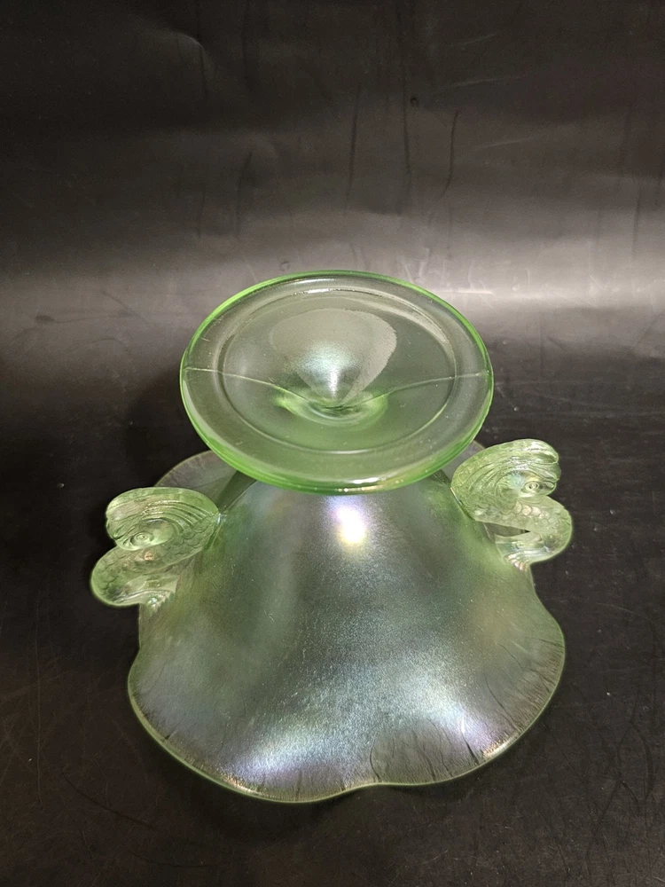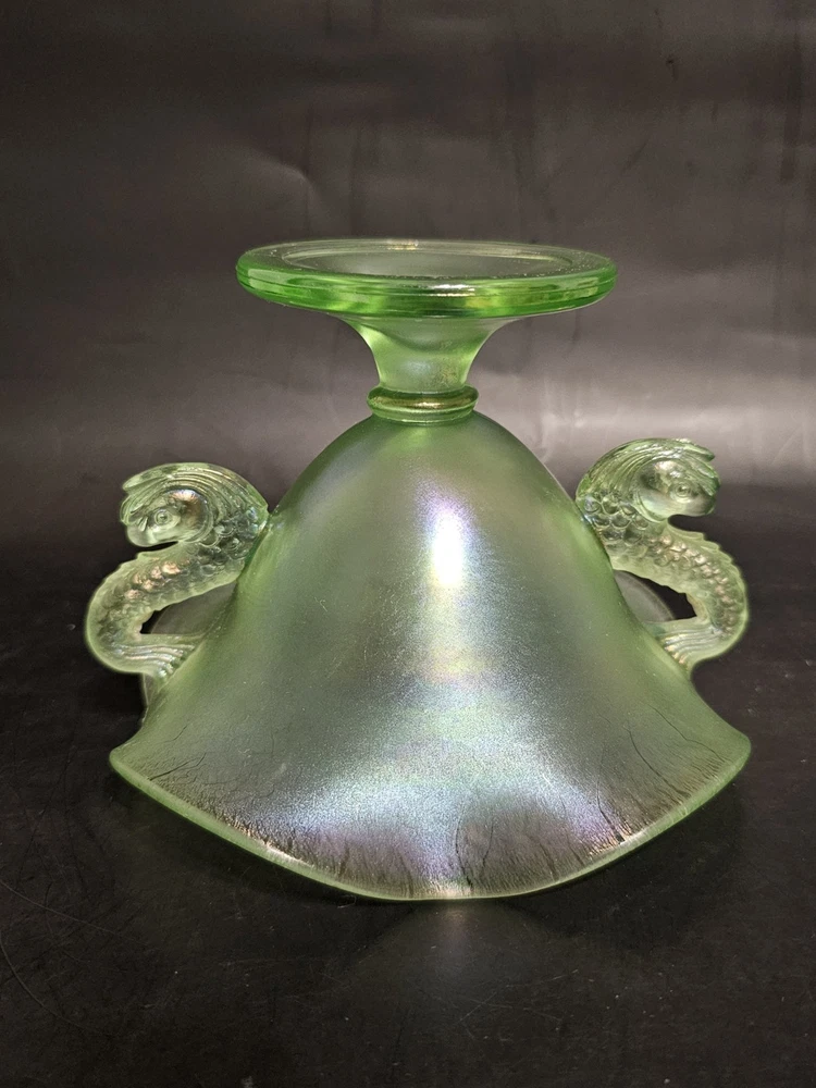 In excellent condition The 1533 Fenton Topaz Stretch Dolphin Handled Comport is a vintage glass figurine from the early 20th century. Made in the United States in 1931, this Art Deco style piece features a 3D effect and color-changing properties. Hand-blown with a matte finish, it showcases the intricate craftsmanship of Fenton glass, now a sought-after collectible for pottery and glassware enthusiasts. This unique and decorative piece is a rare find from the Americas, making it a valuable addition to any collection.