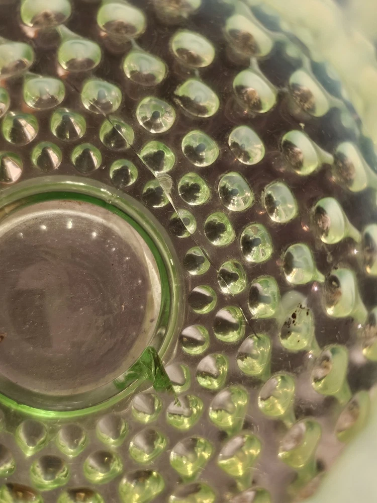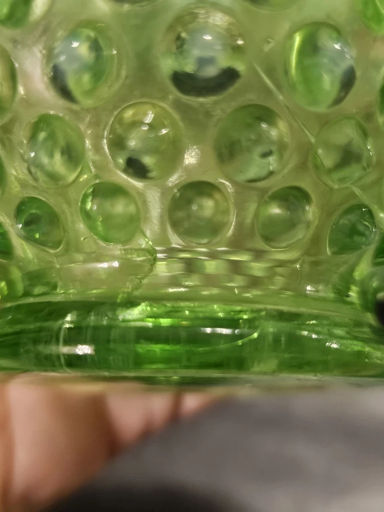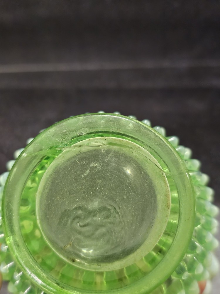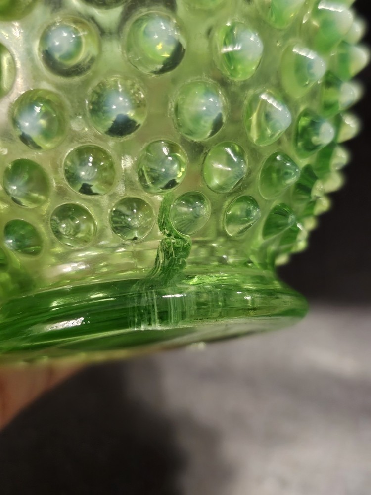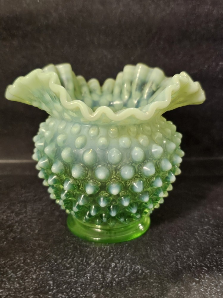 Elevate your glassware collection with the Fenton Hobnail Lime Green Vaseline Opalescent Uranium miniature vase. A true gem from the 1950s, this piece showcases the exquisite craftsmanship of the era with its hand-blown glossy finish. Its vibrant lime green hue and classic hobnail pattern are a testament to the timeless beauty of Fenton's pressed glass designs. Carefully crafted in the United States, this antique vase stands at 4 1/2 inches tall, making it a charming addition to any curio cabinet or display shelf. With its distinctive uranium glass quality, it emits a subtle glow, adding a touch of vintage elegance to your space. This original piece, handmade with the care and attention to detail that Fenton is known for, is a must-have for collectors and enthusiasts alike.