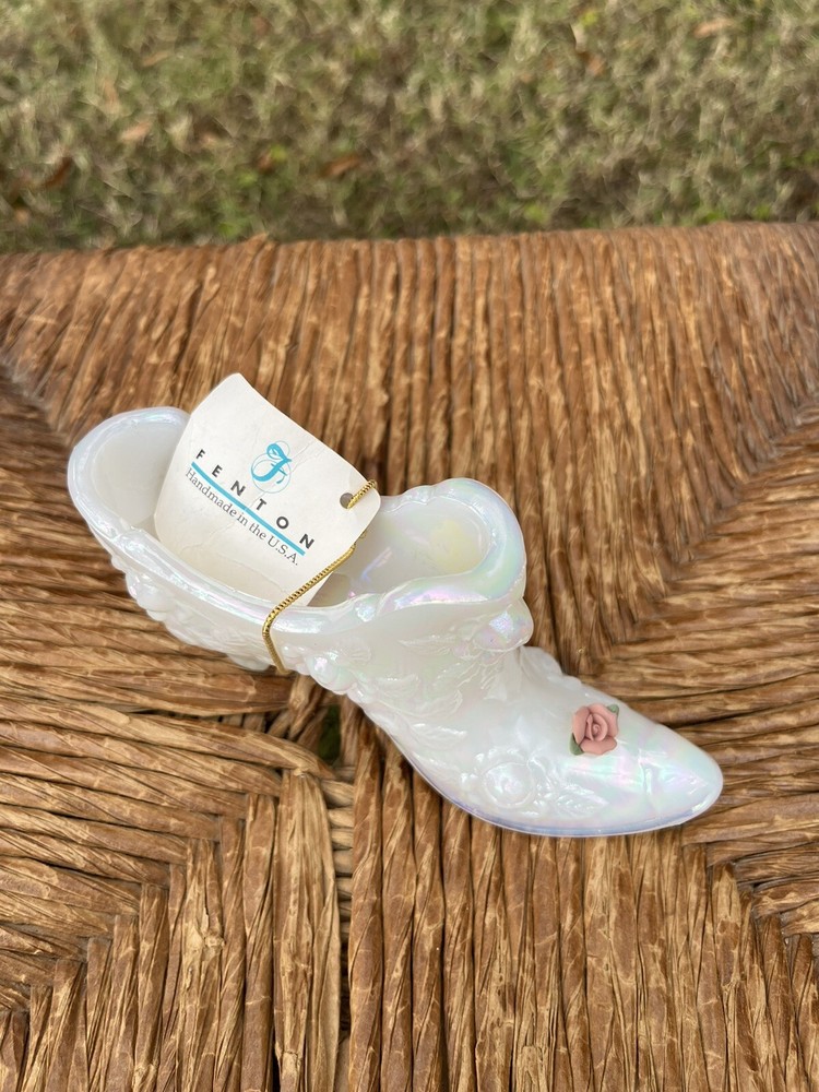 Fenton White Iridescent Cabbage Rose Milk Glass Slipper Shoe with Original Tag. Condition is Used. Shipped with USPS Ground Advantage.