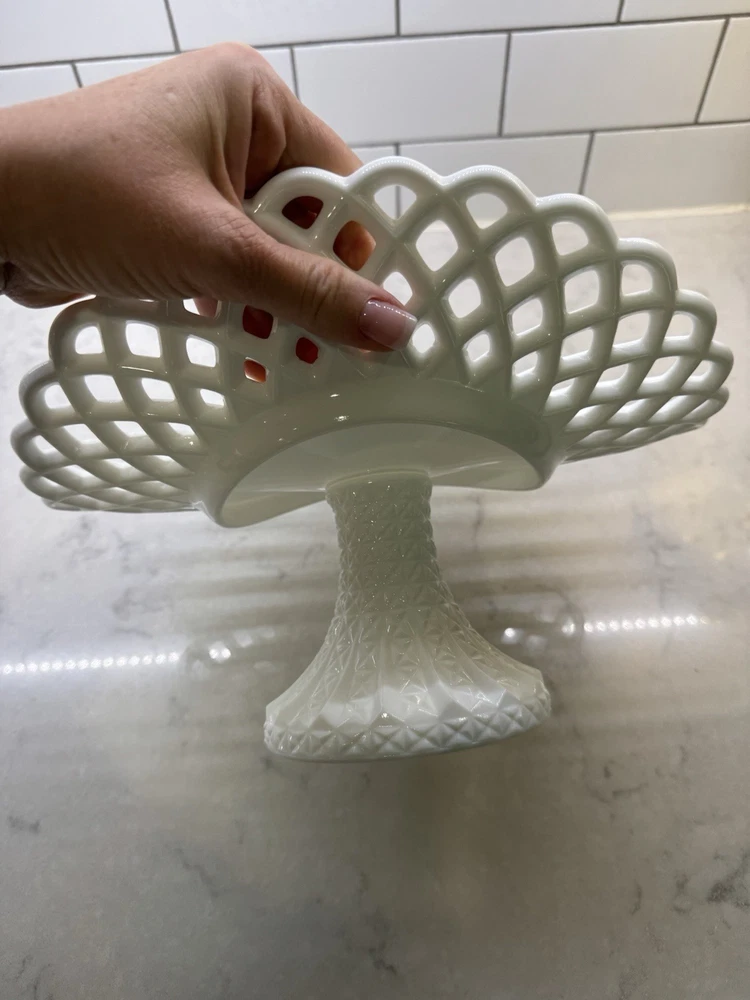 The product is a rare vintage Fenton white milk glass lace banana boat cake plate compote stand. Made by the renowned brand Fenton, this cake stand features a classic white color and is crafted from milk glass, giving it a unique and elegant look. Its intricate lace design adds a touch of sophistication to any dining or display setting, making it a rare and sought-after piece for collectors orThose looking for a vintage touch to their home decor.