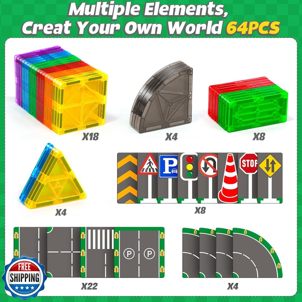 Feoxialy 64PCS Magnetic Building Blocks for Kids Ages 3-8 - STEM Learning Tiles