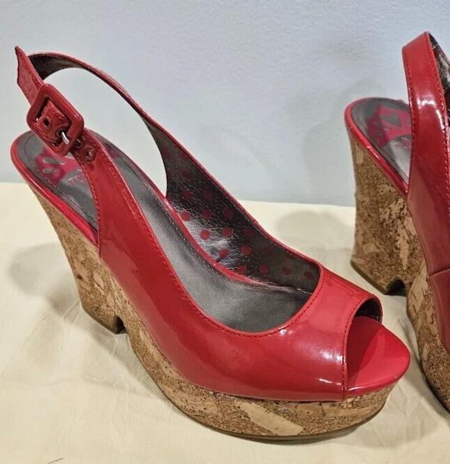 Vintage: No Theme: 90s, Christmas, City, Dance, Disco, Movie, Music, Preppy, Punk, Retro, School MPN: 24-05-043 Type: Heel Brand: Fergalicious Heel Height: Ultra High (4 in & Higher) Toe Shape: Peep Toe Customized: No Features: Adjustable Strap, Buckle Style: Slingback Platform Height: 4.5 Personalize: No Heel Style: Wedge Upper Material: Patent Department: Women Pattern: Solid Season: Fall, Spring, Summer US Shoe Size: 8 Occasion: Formal, Party/Cocktail, Travel Closure: Buckle Color: Red