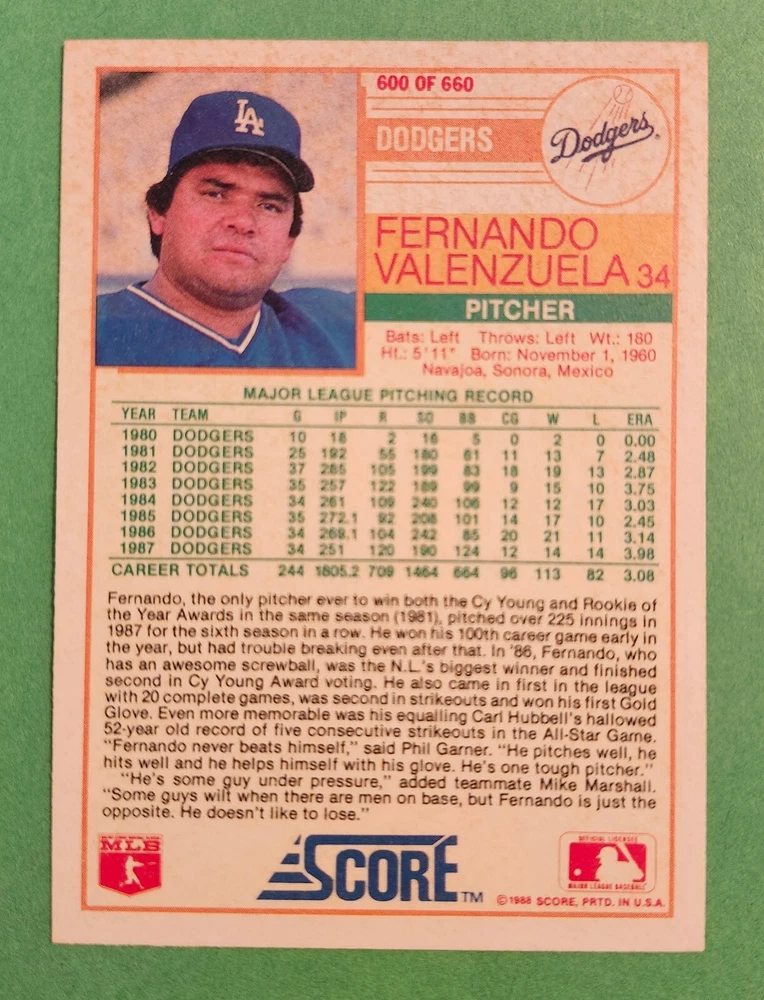 Actual card in photographs. Fernando's 1988 Score base card, likely pulled from a pack bought by myself and in a 9 pocket since 1988. M. Ships ESE PWET fast in loaders.