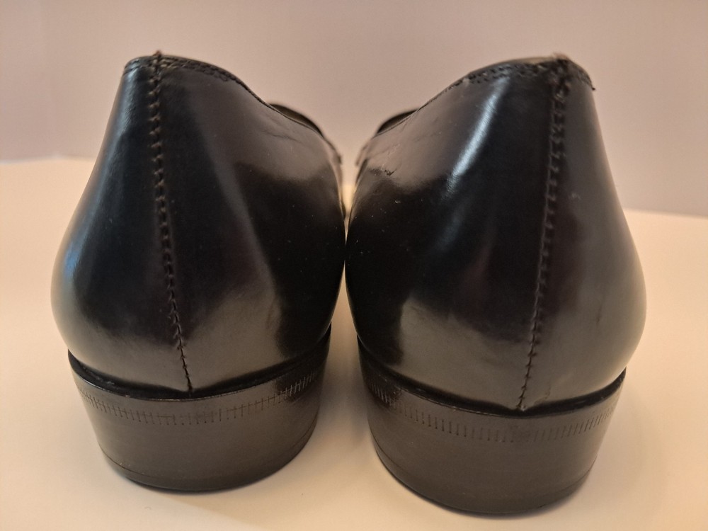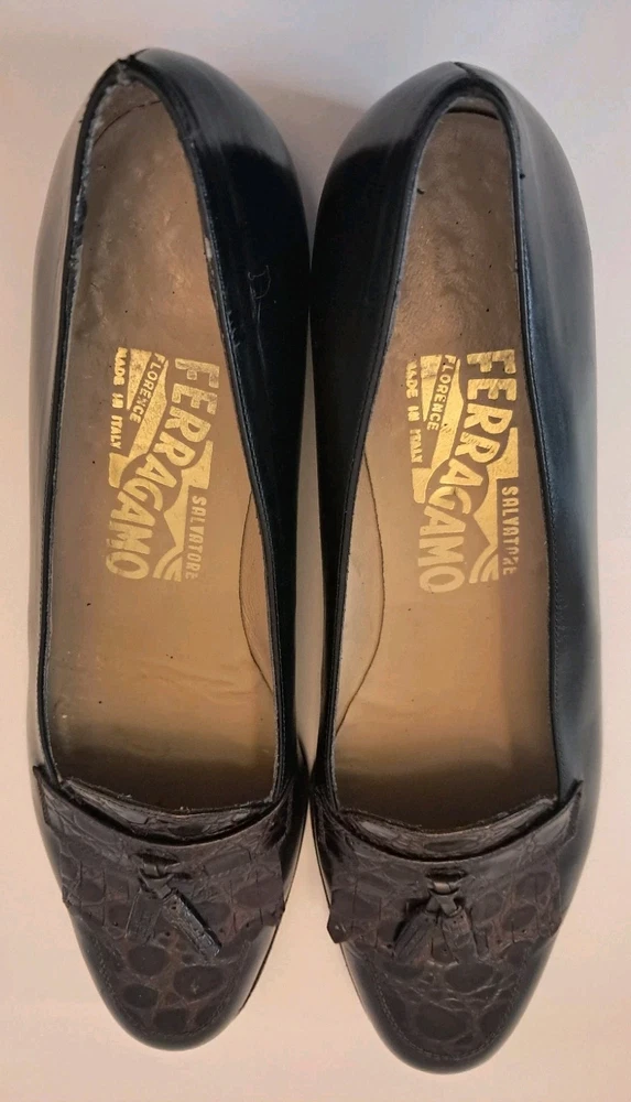 Ferragamo Diplomata Kiltie Tassel Black & Dark Brown Croc Print Embossed Size 7.5 AAA Smoke free pet free home Pre-owned condition but very nice
