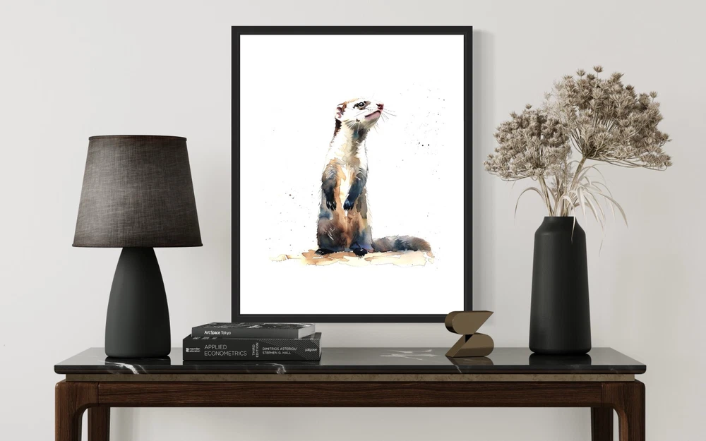 Ferret Animal Watercolor Art Print Poster MATERIAL: 230 gsm Matte Paper SIZE INFORMATION 11x14 in - 27x35 cm 16x20 in - 40x50 cm 18x24 in - 45x60 cm 24x36 in - 60x90 cm HAVE IT FRAMED (BLACK FRAME OPTION AVAILABLE) 11x14 in - 27x35 cm 16x20 in - 40x50 cm 18x24 in - 44x60 cm SHIPPING & HANDLING All your orders will be carefully packaged in a hard tube box or standard USPS box if you buy it framed. Your order will be shipped within 1-3 business days and comes with a tracking number. All orders are made and shipped in the USA. WHAT WE VALUE We take pride in all our artwork and make sure all our customers are happy with their purchases. So if you have any questions or issues, please do contact us! We will respond to any questions and are happy to resolve any problems you may have. 30 DAYS MONEY BACK GUARANTEED! If for any reason you are not happy with your purchase, please send it back for a FULL REFUND.
