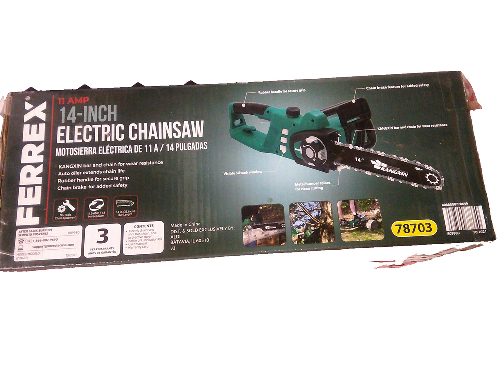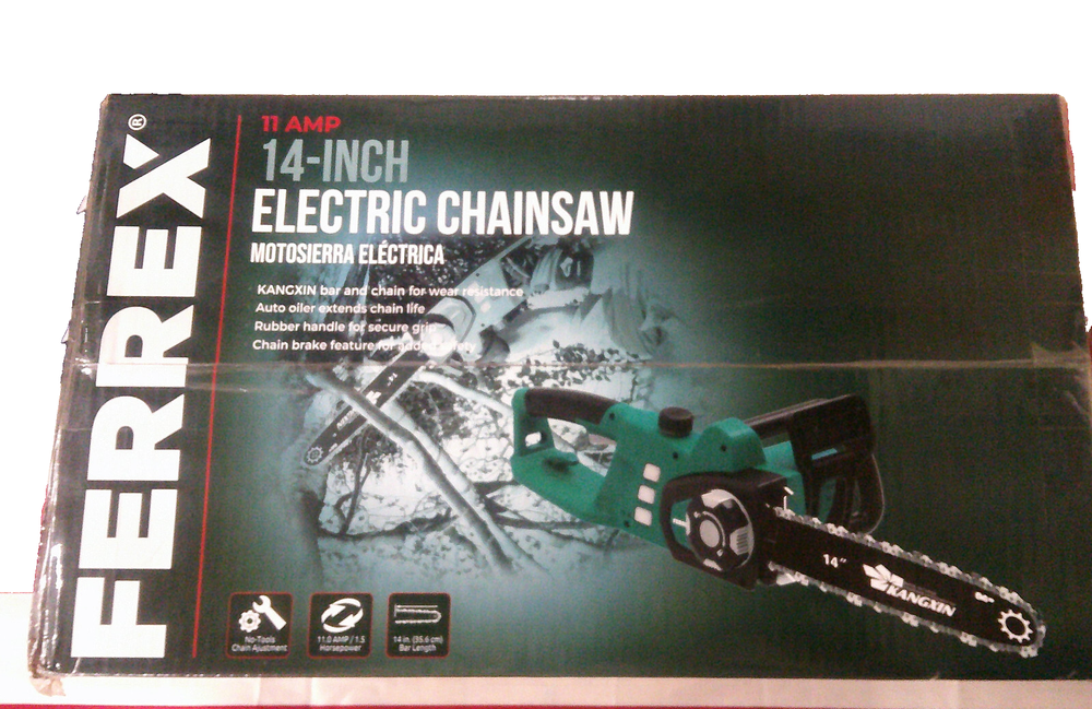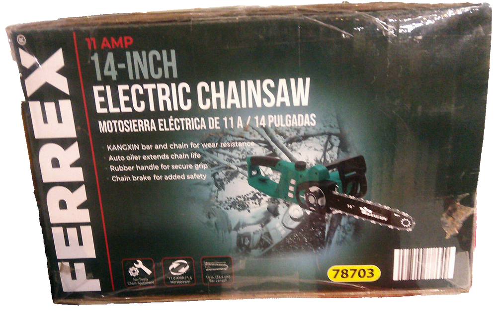 You are purchasing an Ferrex 14-Inch Electric Chainsaw $35.95 OR MAKE AN OFFER! WE ship to the lower 48 states only!!! Any E-mail questions asking to ship otherwise WILL NOT receive a response. We do not offer combined shipping. High value items arrive signature REQUIRED. Please have someone available to sign for your package. Insurance & signature required . Check out my other items! FEEDBACK Please take the time to leave feedback once you have inspected your item. On the rare occasion you are not satisfied, PLEASE contact us. We want to ensure you are another satisfied customer. All pictures are actual items unless otherwise stated. If something is not pictured it is not included in the listing. We work very hard to make sure our listings are accurate and all items function properly. WE DO NOT ACCEPT RETURNS so if you have a question please ask before purchasing.
