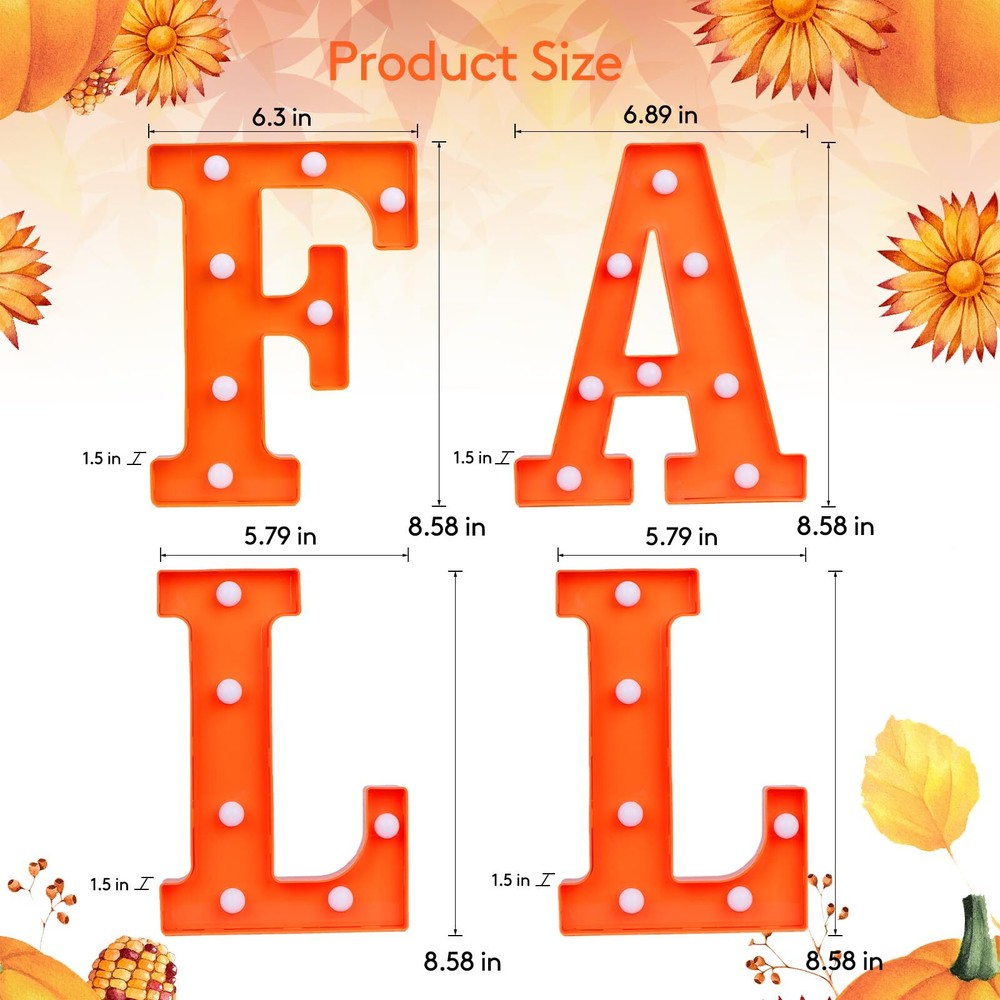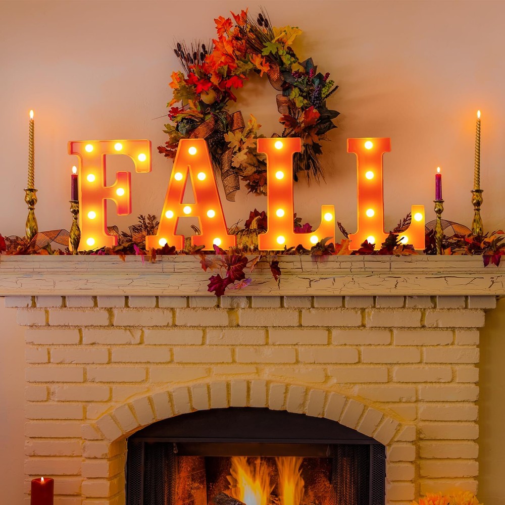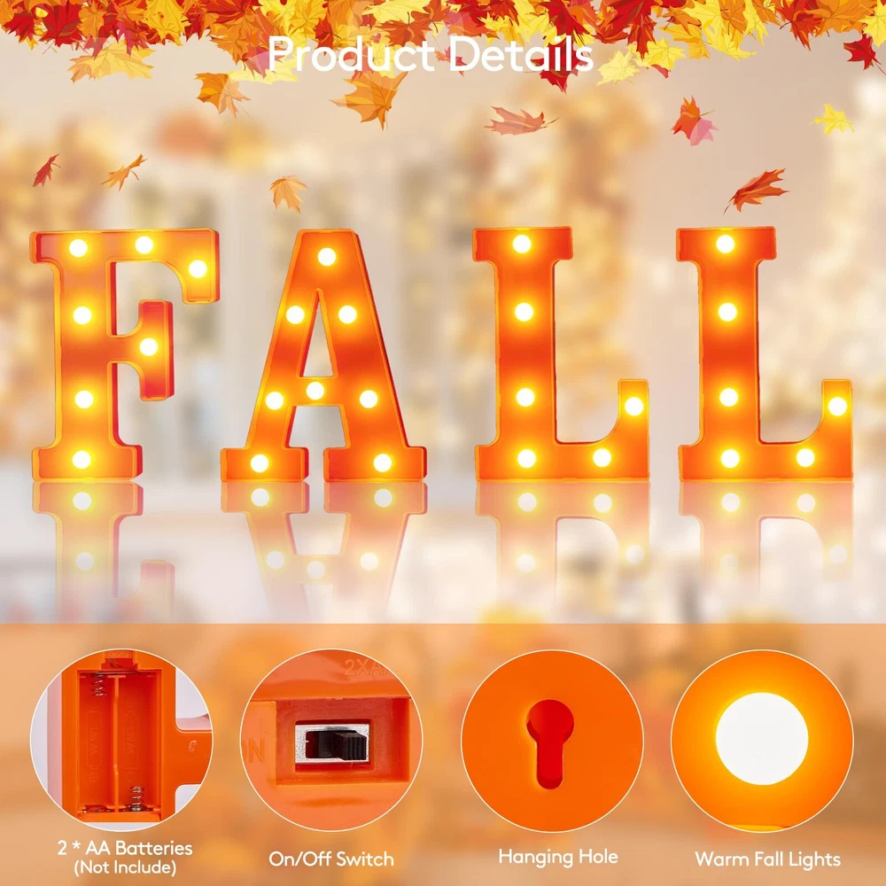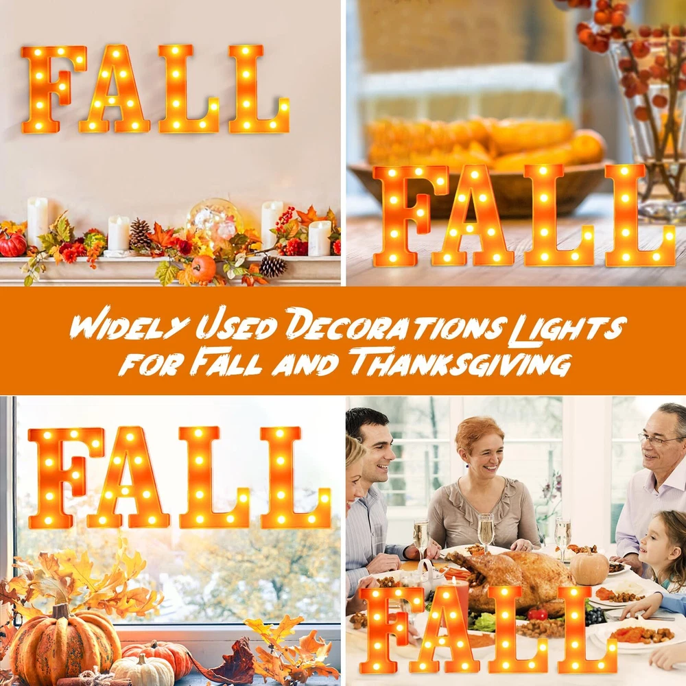Perfect Fall and Christmas Decorations for Home: These lovely "FALL" Led letter lights are great for Fall And Thanksgiving Decorations, you will get 4 pieces of Thanksgiving light up letters. They can light up your fall house party and bring your family a stronger seasonal atmosphere, satisfy your multiple needs for Fall-themed decorations. Battery Operated Fall and Christmas Lights: These fall decorative light up letters powered by 3AA batteries (each letter need 2 batteries, not included). No need to plug in, no extra wire, low power consumption, will not overheat after prolonged usage, safe and reliable to use. It can be used indoor or outdoor. Dress up your home, tabletop, mantel, wall, porch, garden or yard. Easy To Use: These fall marquee light up letters have holes and an on/off switch on the back. You can place them directly on the table, or hang them on the wall with some nails (not included). Premium Material & Reusable: Made of premium plastic material, the "FALL" letter lights are non-toxic, odorless, stable and sturdy. The bulbs on the led letter lights are not easily broken or deformed, which can be reused for a long time. Widely Used Fall And Thanksgiving decorative Lights: These vivid light up letters can easily creates a warm, memorable atmosphere—perfect for everyday decor or social gatherings like fall, Thanksgiving party, indoor outdoor harvest celebration, winter evening party, or casual backyard barbecue. Very convenient to fix or place it anywhere you like, do it by yourself and enjoy the fun! Customer Satisfactions: Feel free to message us through “contact sellers” if products don't meet your expectations. Any problem, please contact us first, we will help you solve the problem within 24hours. Then celebrations start at our unique lighted fall letter lights!