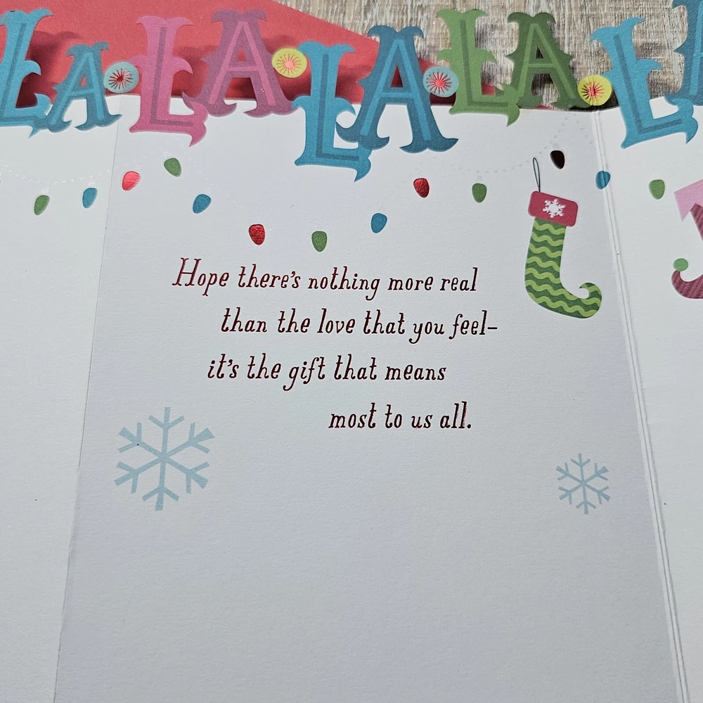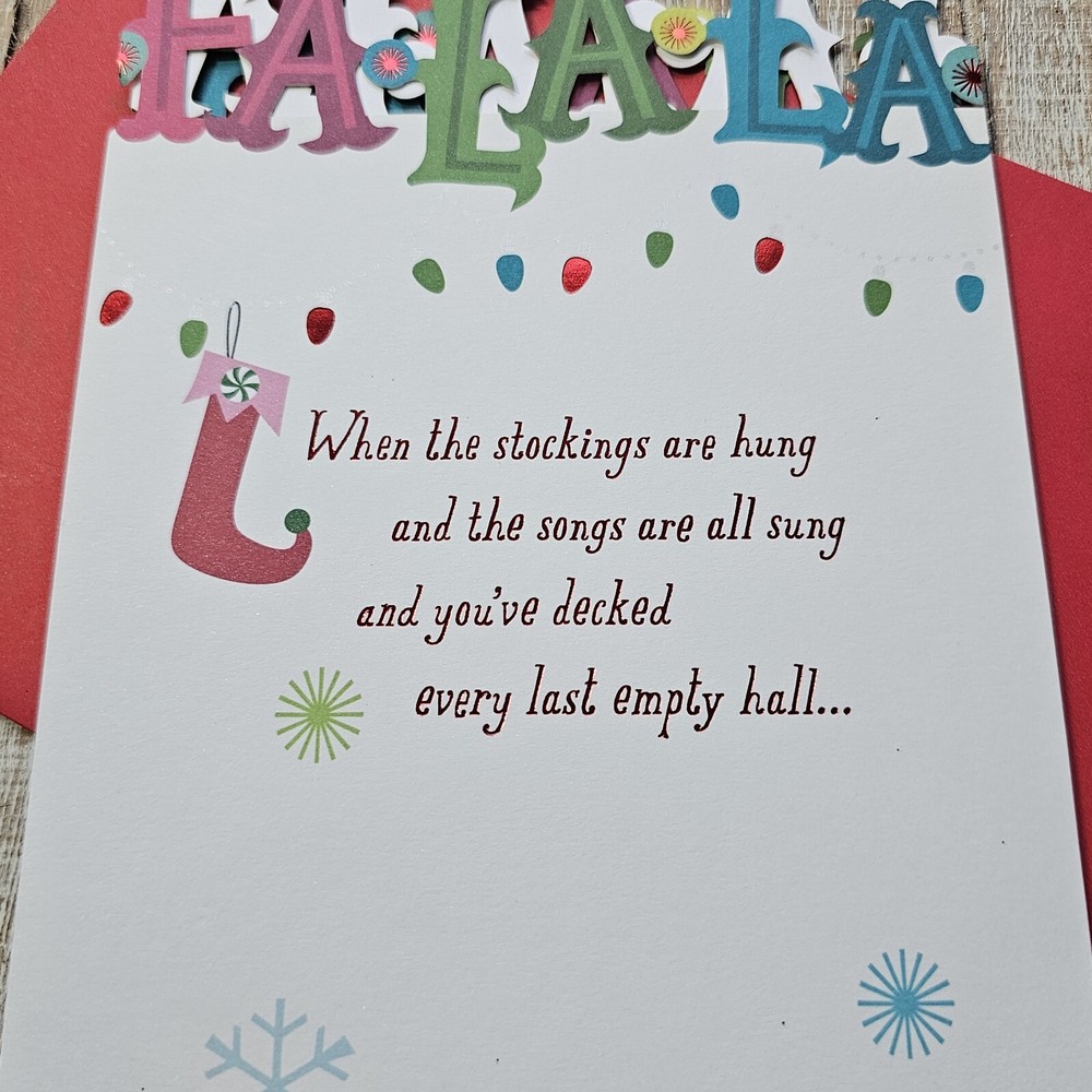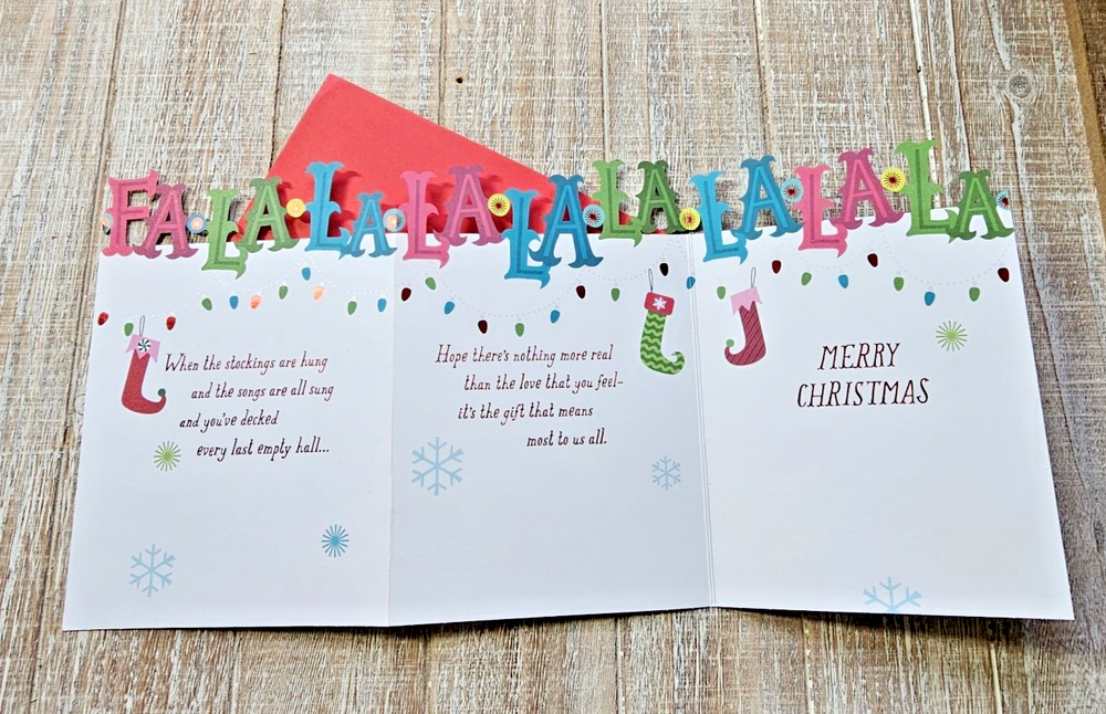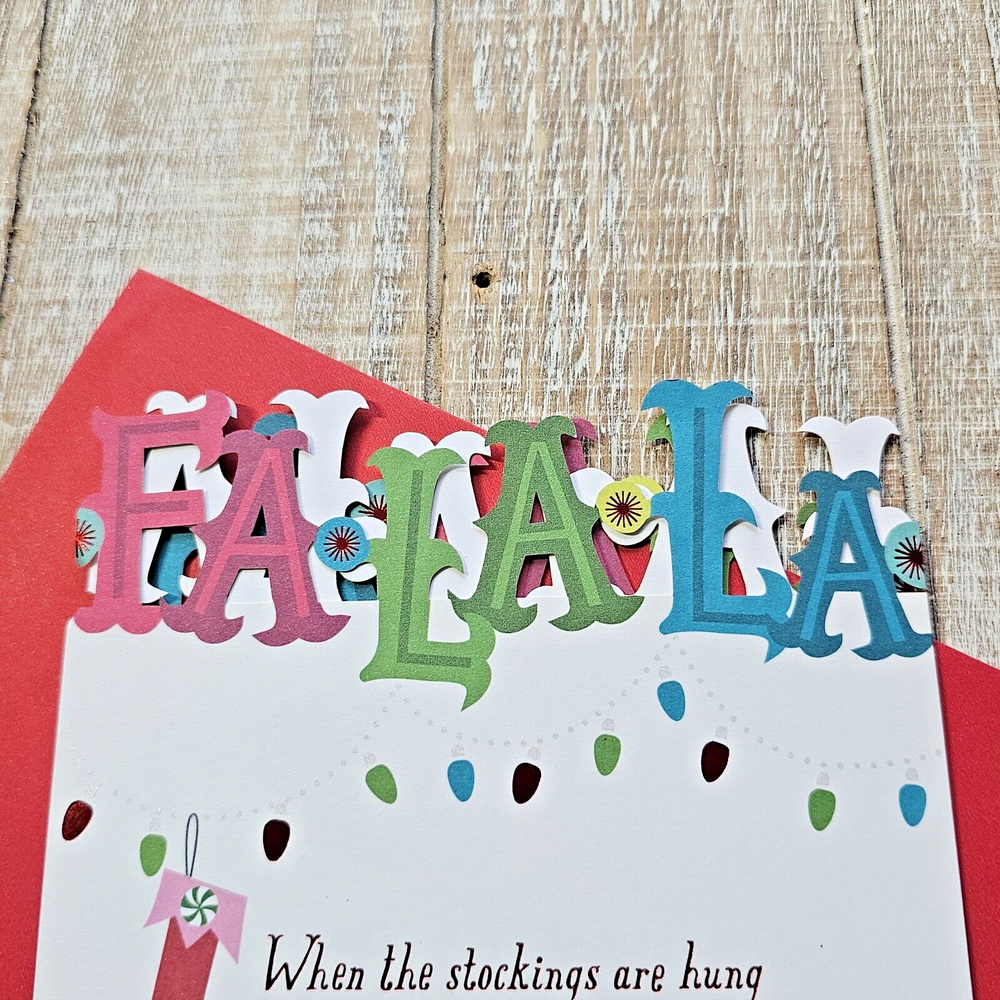 Hallmark Christmas Greeting Card Fa La La Tri Fold Die Cut Lights Glitter Full Size 5.5 x 8 inch card with matching envelope Condition: new Search thousands of cards for all occasions in our eBay Store. **This items ships with limited tracking via USPS First Class.** **The standard time is 5-7 business days for delivery but it may take up to 10 days.**