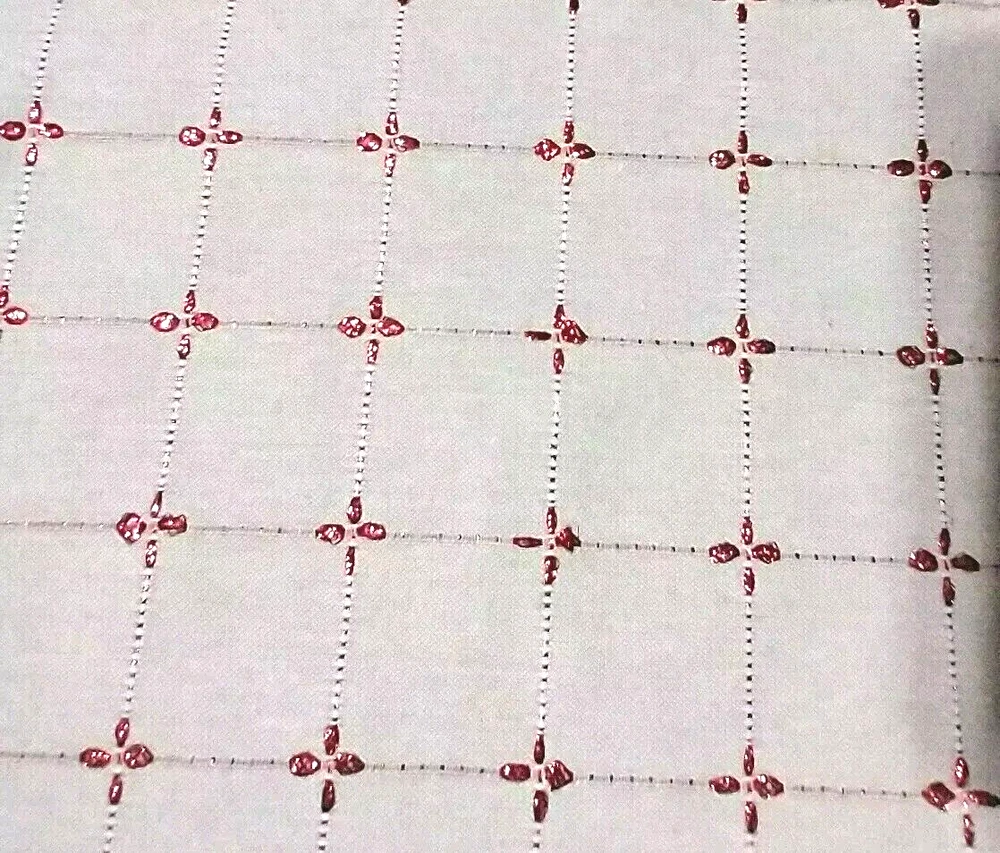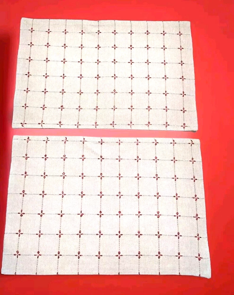 This is a gently pre-owned Set of 2 Christmas / New Years Placemats in very good, like new, condition. Features embroidered red metallic thread starbursts (very sparkly) on beige background. They measure approximately 19.5" in length and 13.25" in width. They are 75% Cotton, 20% Polyester, and 5% Metallic Thread. They are machine washable in cold water. Very Nice Quality! PLEASE SEE ALL PICTURES AS PART OF THE DESCRIPTION.