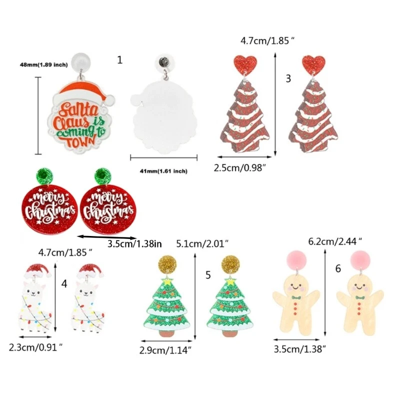 Features: Stand out this Christmas with these creative acrylic earrings. for adding a festive touch to your holiday outfits. Made from lightweight acrylic material, these earrings are not only fashionable but also comfortable to wear. Designed for fashion forward individuals who appreciate unique and personalized styles. These earrings are for those who love to make a statement with their accessories. Whether it's a Christmas party or a casual day out, these earrings can easily elevates any outfit and add a touch of holiday cheer. These Christmas earrings are the choice for family, or loved ones who appreciate festive accessories. Spread the and love this holiday season. Specifications: Acrylic 3 4 5 6 Size: As Shown In The Picture Package Includes: 1pair Earring note: Please allow 1-2cm errors due to manual measurement, make sure that you do not mind before you order. Due to the difference between different monitors, the picture may not reflect the actual color of the item.