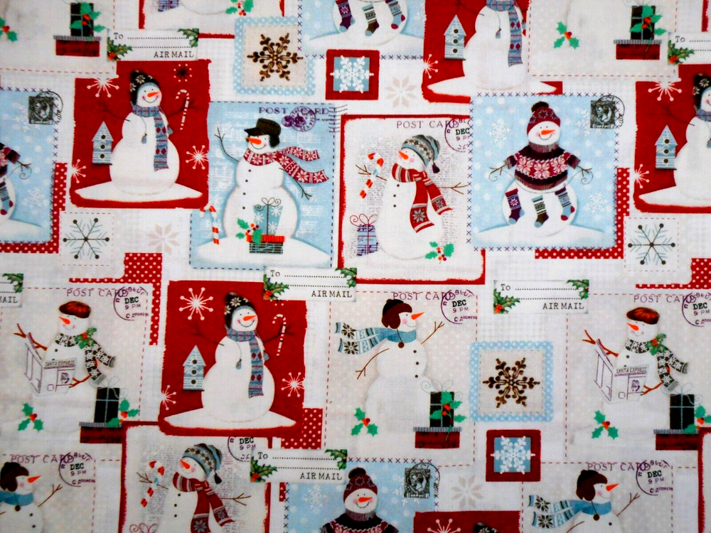 This is a very nice fabric that is 100% cotton. This is a premium quilting cotton by Hobby Lobby. It has Xmas postcards with snowmen on them in patches on a red, ivory & light blue background READ: Because computer monitors show colors and shades differently, the fabric colors can vary from the photos. If you have any questions regarding this, please contact me before p urchasing the item. I have been a quilter for 30 years and am an accomplished seamstress & would be happy to answer any questions you might have. This is for a 1 Yard of Fabric. If you purchase more than 1 Yard, I will give you one continuous cut. If you have a problem with anything you purchase from me, please contact me before leaving neutral or negative feedback and I will work it out with you. Payment is due within 48 hours. If payment isn't received within 5 days, it will automatically go to Ebay's resolution center for non-payment. INSTRUCTIONS FOR COMBINED SHIPPING: I Do combine shipping. You must add the items to your shopping cart and request an invoice from me using the REQUEST TOTAL BUTTON BEFORE completing the payment process, or I won't be able to combine your shipping. Payment is due upon receipt of your invoice. Thank you for looking and God bless you and your family. IF THERE IS A PROBLEM WITH ANY PURCHASE, PLEASE CONTACT ME, THE SELLER, VIA EBAY'S MESSAGING SYSTEM PRIOR TO OPENING A CASE--OPENING A CASE, EVEN IF RESOLVED SMOOTHLY, CAN HURT THE SELLER'S RATINGS. THANK YOU