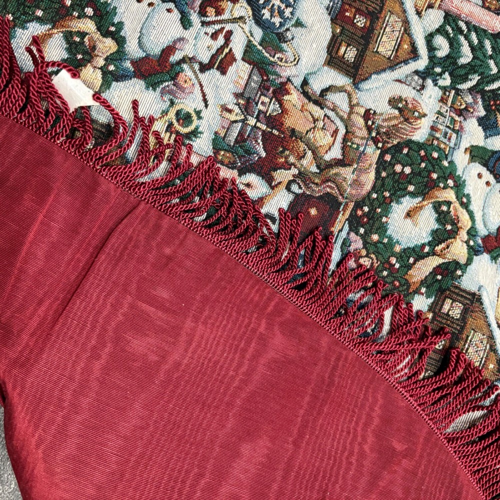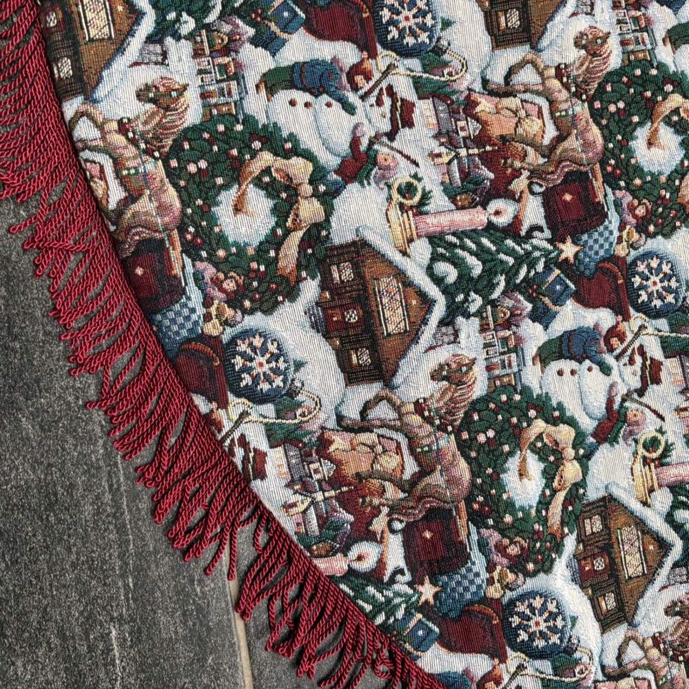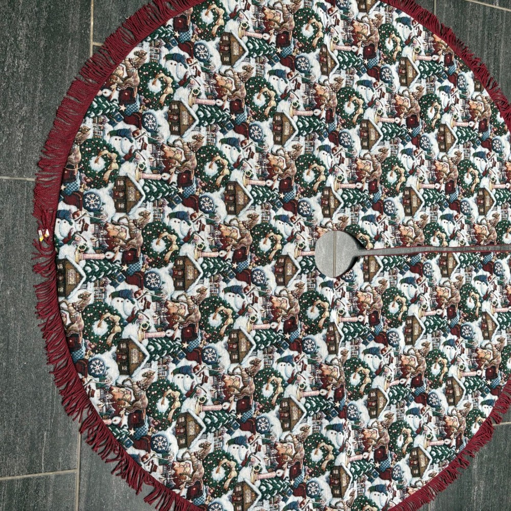 Festive Christmas tree skirt featuring a charming tapestry design. This circular skirt showcases a detailed pattern of Santa Claus figures, snowmen, cozy cabins, and decorated wreaths, all set against a wintry backdrop. The skirt is finished with a decorative red fringed edge, adding a touch of elegance and holiday cheer to your Christmas tree display. Keywords: Christmas tree skirt, holiday decor, tapestry tree skirt, Santa Claus, snowman, cabin, fringed tree skirt, Christmas decoration, holiday tree skirt, festive decor, Christmas theme, holiday season, tree skirt, Christmas tapestry