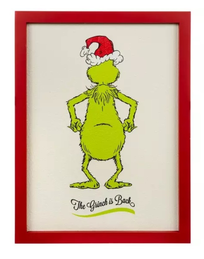 Guess who's back?! The Grinch Is Back Wall Decor features a textured image of your favorite holiday grump with his back turned. He has his hands on his hips and is wearing a red Santa hat that matches the red frame that it comes in. Under the character are the words "The Grinch Is Back" in black font. Pair this holiday decoration with other Grinch pieces for a whimsical display! Product Details ◦ Dimensions: 18" H x 12" W x 1" D ◦ Material: MDF ◦ Shape: Rectangle ◦ Color: Red, Green, Beige & Black Orientation: Vertical