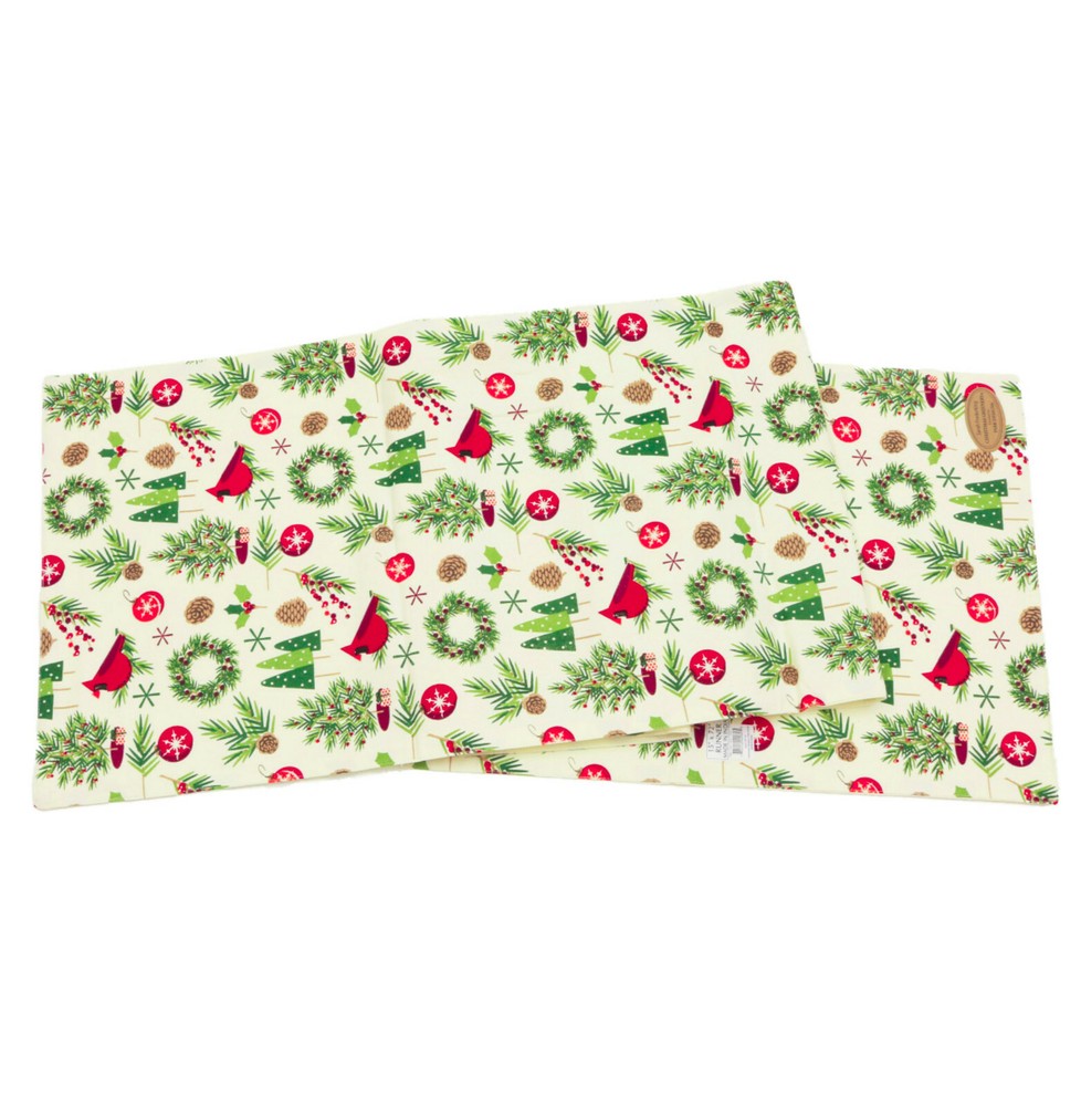 The title of this cheerful Christmas 15x72 inch table runner says it all! Set against an off white background are printed images of Christmas trees with red ornaments and packages, wreaths accented with red berries, and sprays of holly with red berries. The artist has also included pine tree branches with pine cones, modern looking holiday trees, and a cute red cardinal perched on a pine tree branch. Scattered among all of these traditional seasonal images are pine cones, red ornaments, and green and cranberry colored abstract snowflakes. Dining with this well made pretty table runner will bring happy smiles to all. The table runner is 100% cotton and is lined in 100% cotton. You can machine wash cold, gentle cycle, then re-shape and dry flat. 100% cotton 15x72 inches Art by Sarah Frederking and licensed by Park Design Machine washable, gentle cycle then reshape and dry flat