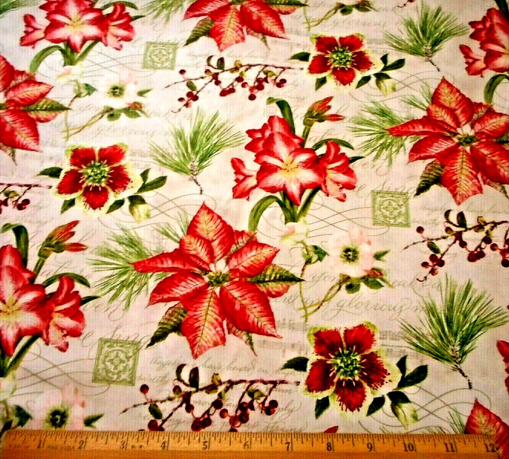 This is a very nice fabric that is 100% cotton. This is a premium quilting cotton by David Textiles. It has red & green flowers & leaves, red poinsettias, berries & green pine on an ivory background that has light tan music script in it. READ: Because computer monitors show colors and shades differently, the fabric colors can vary from the photos. If you have any questions regarding this, please contact me before p urchasing the item. I have been a quilter for 30 years and am an accomplished seamstress & would be happy to answer any questions you might have. This is for a 1 Yard of Fabric. If you purchase more than 1 Yard, I will give you one continuous cut. If you have a problem with anything you purchase from me, please contact me before leaving neutral or negative feedback and I will work it out with you. Payment is due within 48 hours. If payment isn't received within 5 days, it will automatically go to Ebay's resolution center for non-payment. INSTRUCTIONS FOR COMBINED SHIPPING: I Do combine shipping. You must put your items into your shopping cart and request an invoice from me using the request total button before completing the payment process. IF YOU'RE UNABLE TO COMBINE YOUR SHIPPING, PLEASE CONTACT ME. Payment is due upon receipt of your invoice. Thank you for looking and God bless you and your family. IF THERE IS A PROBLEM WITH ANY PURCHASE, PLEASE CONTACT ME, THE SELLER, VIA EBAY'S MESSAGING SYSTEM PRIOR TO OPENING A CASE--OPENING A CASE, EVEN IF RESOLVED SMOOTHLY, CAN HURT THE SELLER'S RATINGS. THANK YOU