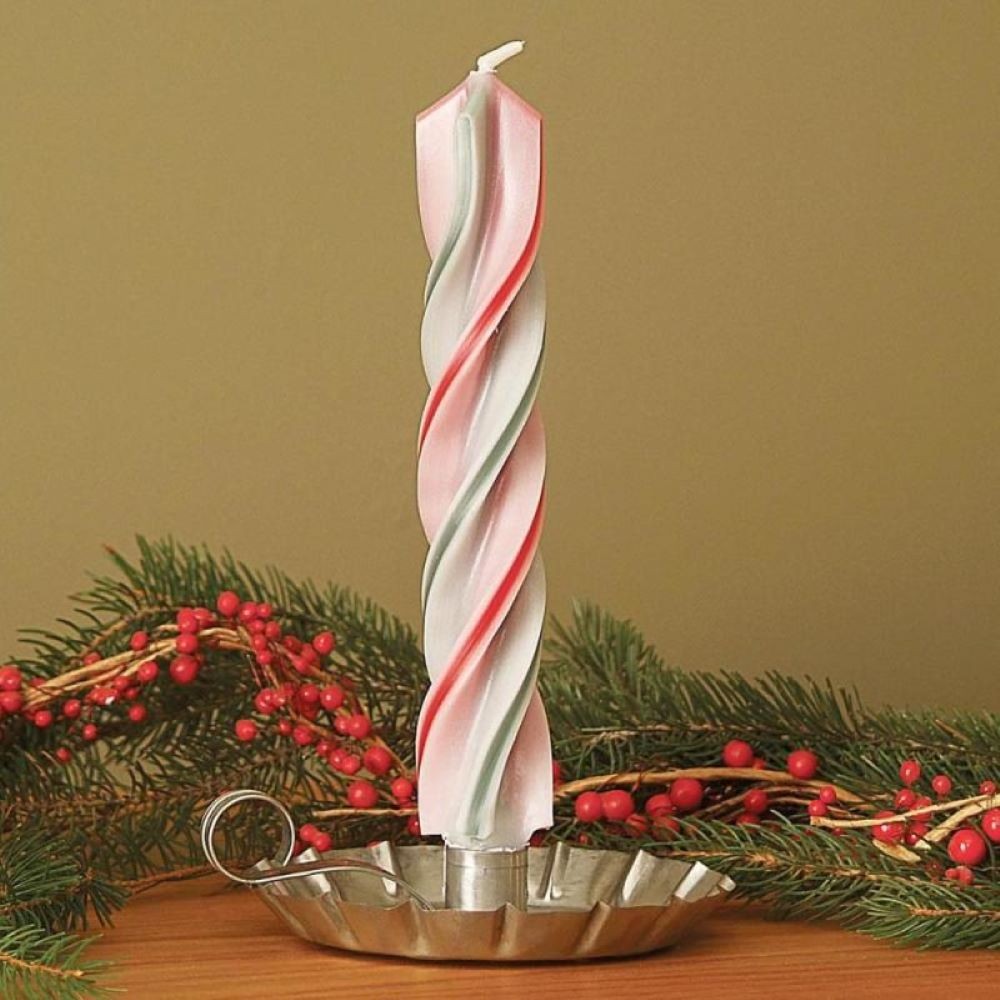 Your home will have a festive cheer this season with this uniquely beautiful hand-dipped candle. Perfect as a centerpiece for a handcrafted holiday spread or by itself. Replace those worn-out or plain candles from the last holiday season with this colorful twist. Set of two dripless, unscented candles burn approximately 10 hours each . Red and green inlaid lines delicately twist and taper to a base of approximately 3/4"OD (9-1/2" tall). Handmade locally.. Note: Tin holder not included. Visit Our Store Contact Us Red/White/Green Spiral Candle (Pack of 2) Your home will have a festive cheer this season with this uniquely beautiful hand-dipped candle. Perfect as a centerpiece for a handcrafted holiday spread or by itself. Replace those worn-out or plain candles from the last holiday season with this colorful twist. Set of two dripless, unscented candles burn approximately 10 hours each Red and green inlaid lines delicately twist and taper to a base of approximately 3/4"OD (9-1/2" tall) Handmade locally. Note: Tin holder not included.