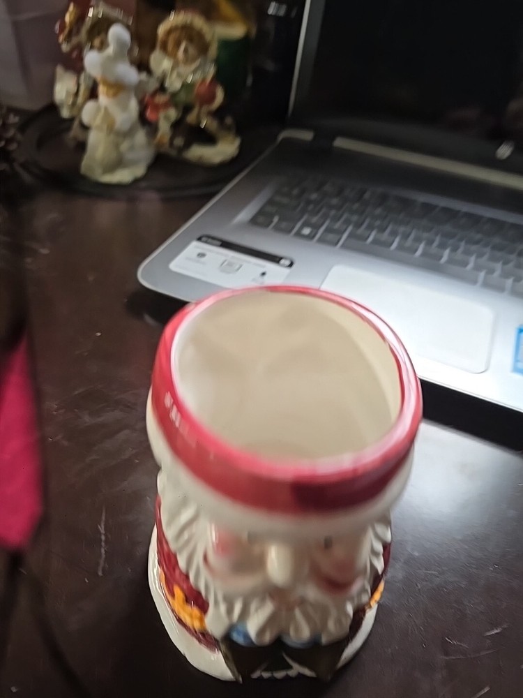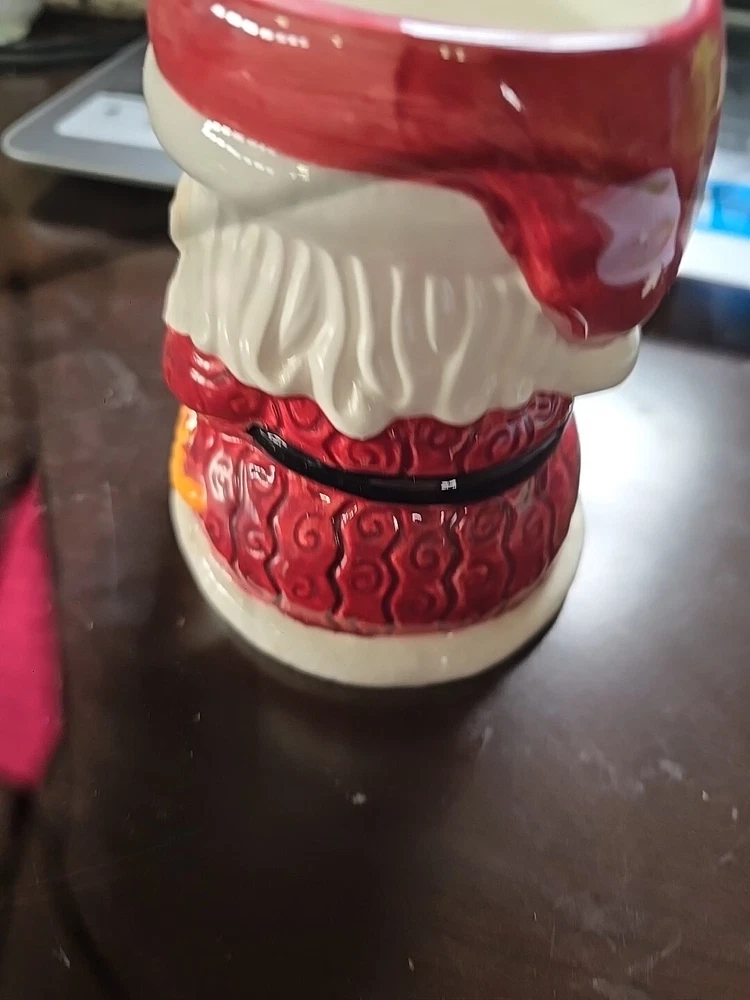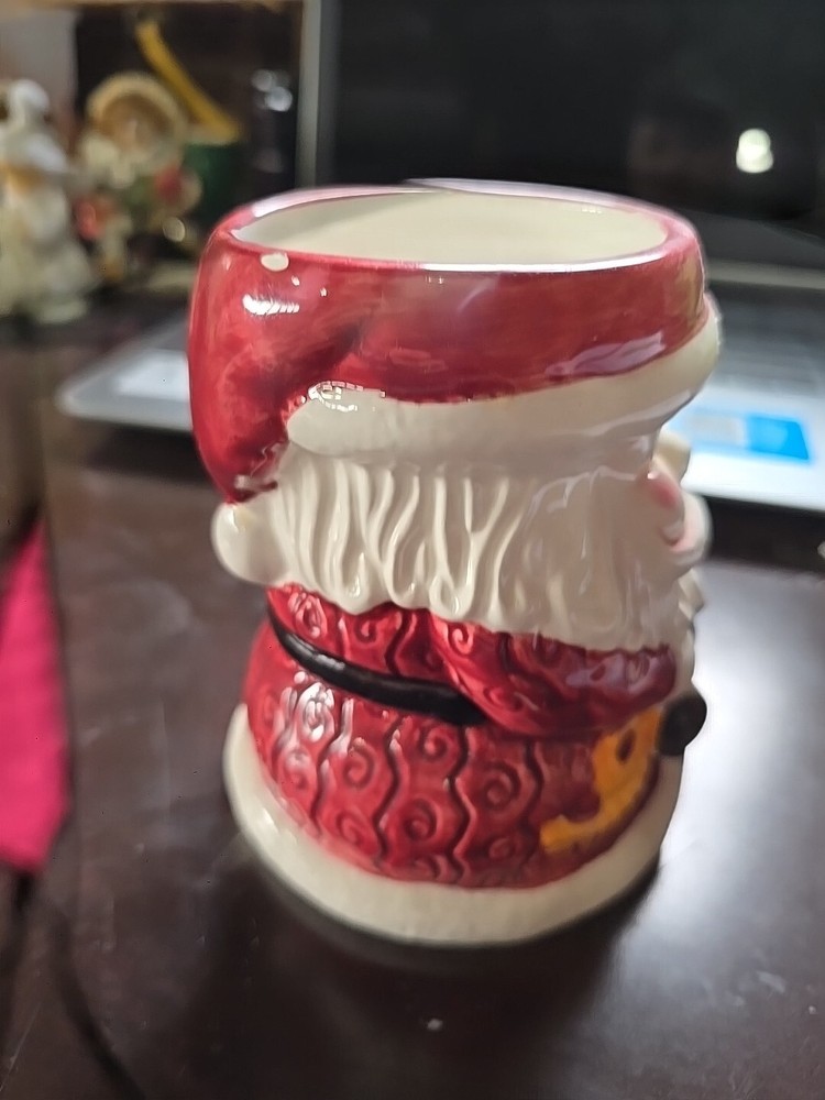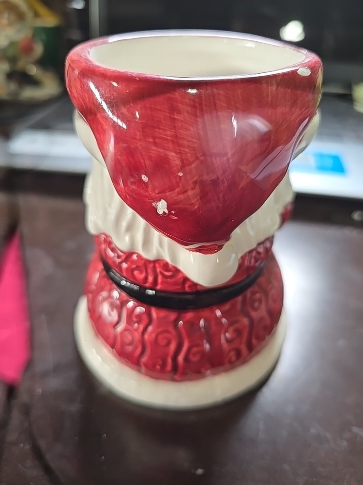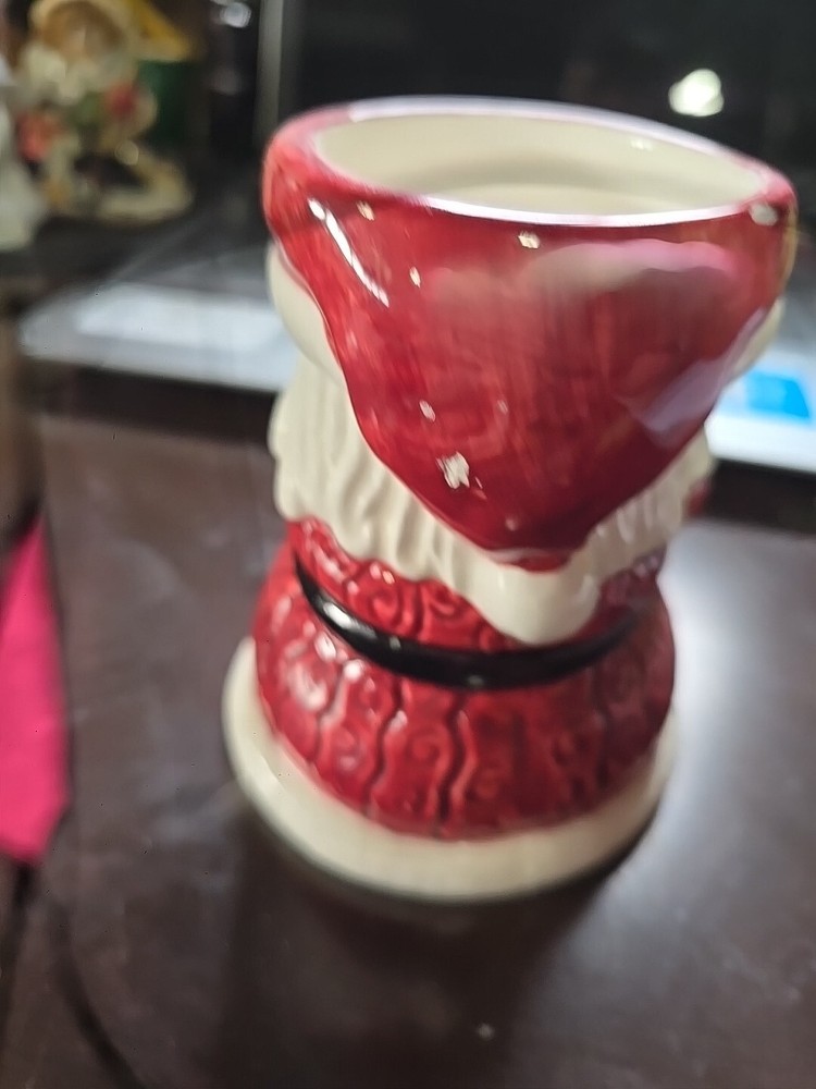 This Santa Flower Pot is made of ceramic and stands at a height of 4.75 inches. Designed with a Christmas theme, this flower pot is shaped like Santa Claus, making it a festive and charming addition to your holiday decor. Perfect for displaying small plants or flowers, this collectible ornament adds a touch of whimsy to your home during the holiday season. has a few chips shown in pictures