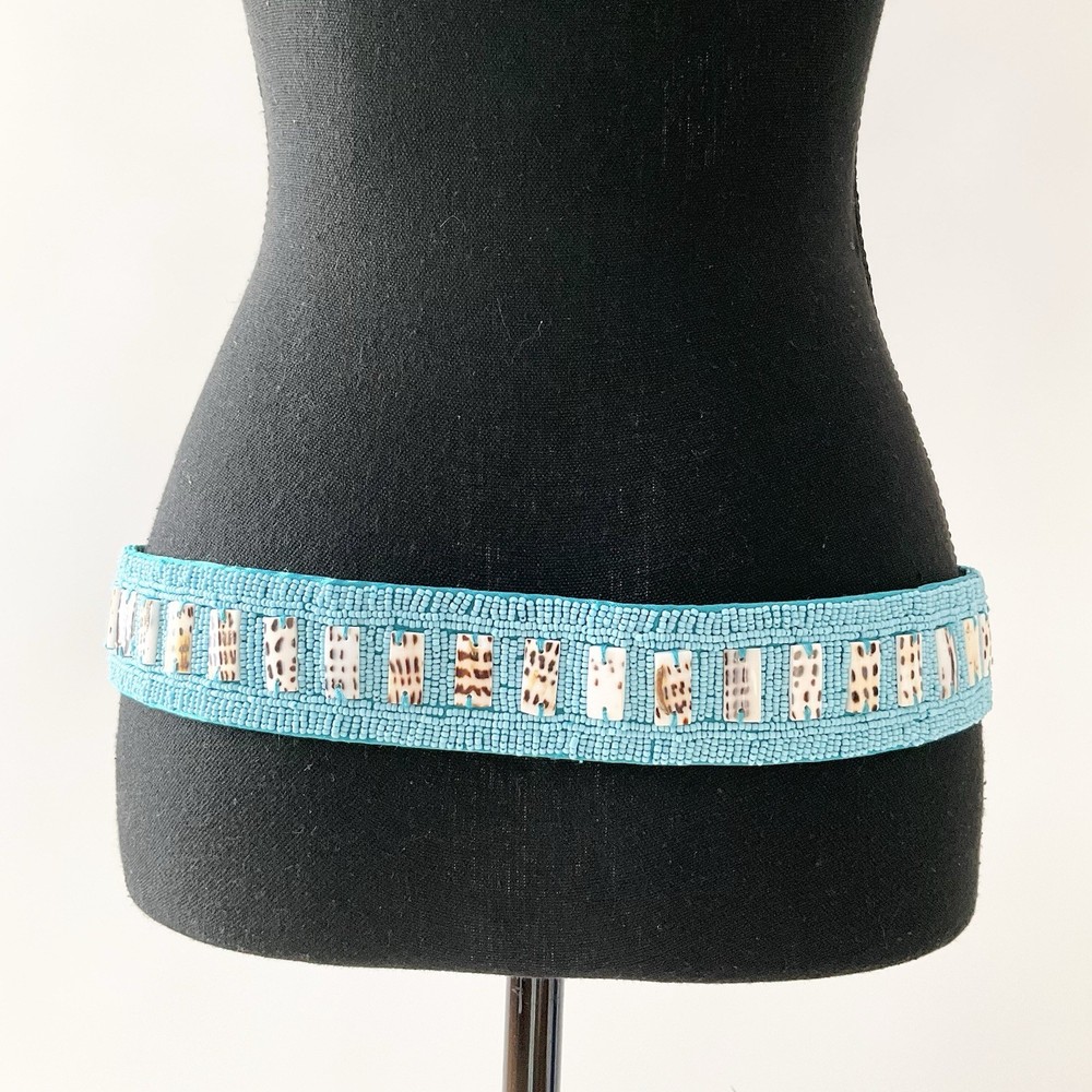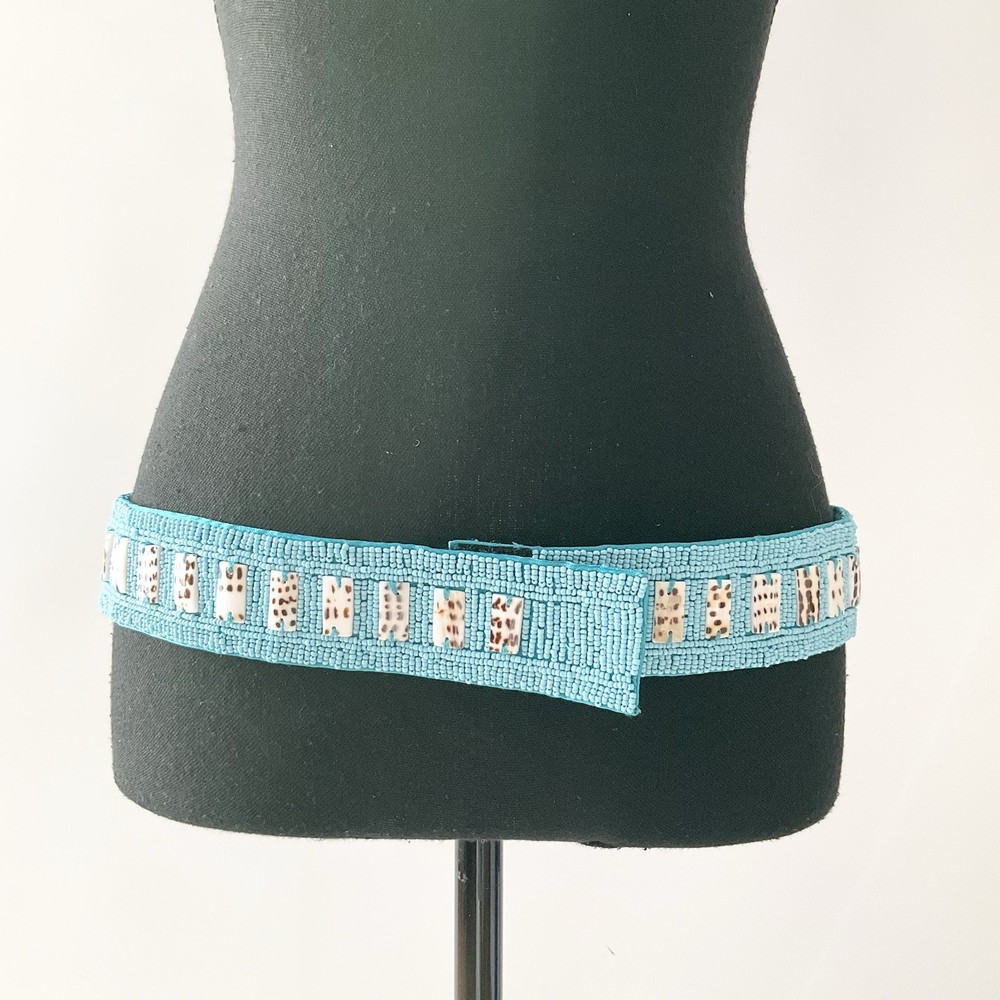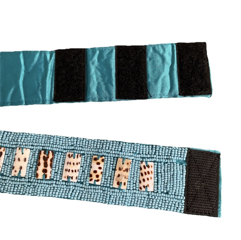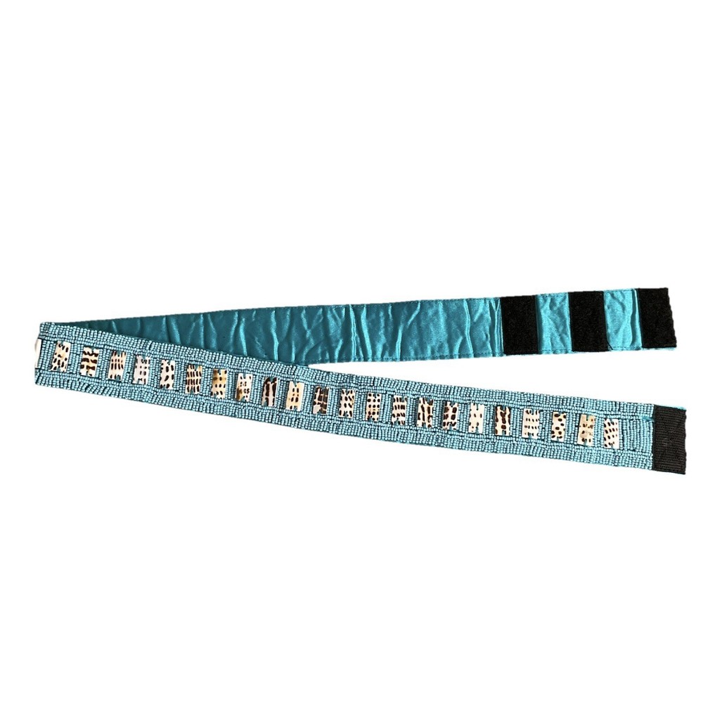 This teal hip belt features intricate beading with a mix of small and large decorative beads, adding a bold, artistic touch to any outfit. Though it has no brand label, it’s thoughtfully designed with three Velcro size options for an adjustable and secure fit. Perfect for adding a pop of color and texture to dresses, tunics, or layered looks. Measurements: Length to 1st Velcro 37, Length to last Velcro 33