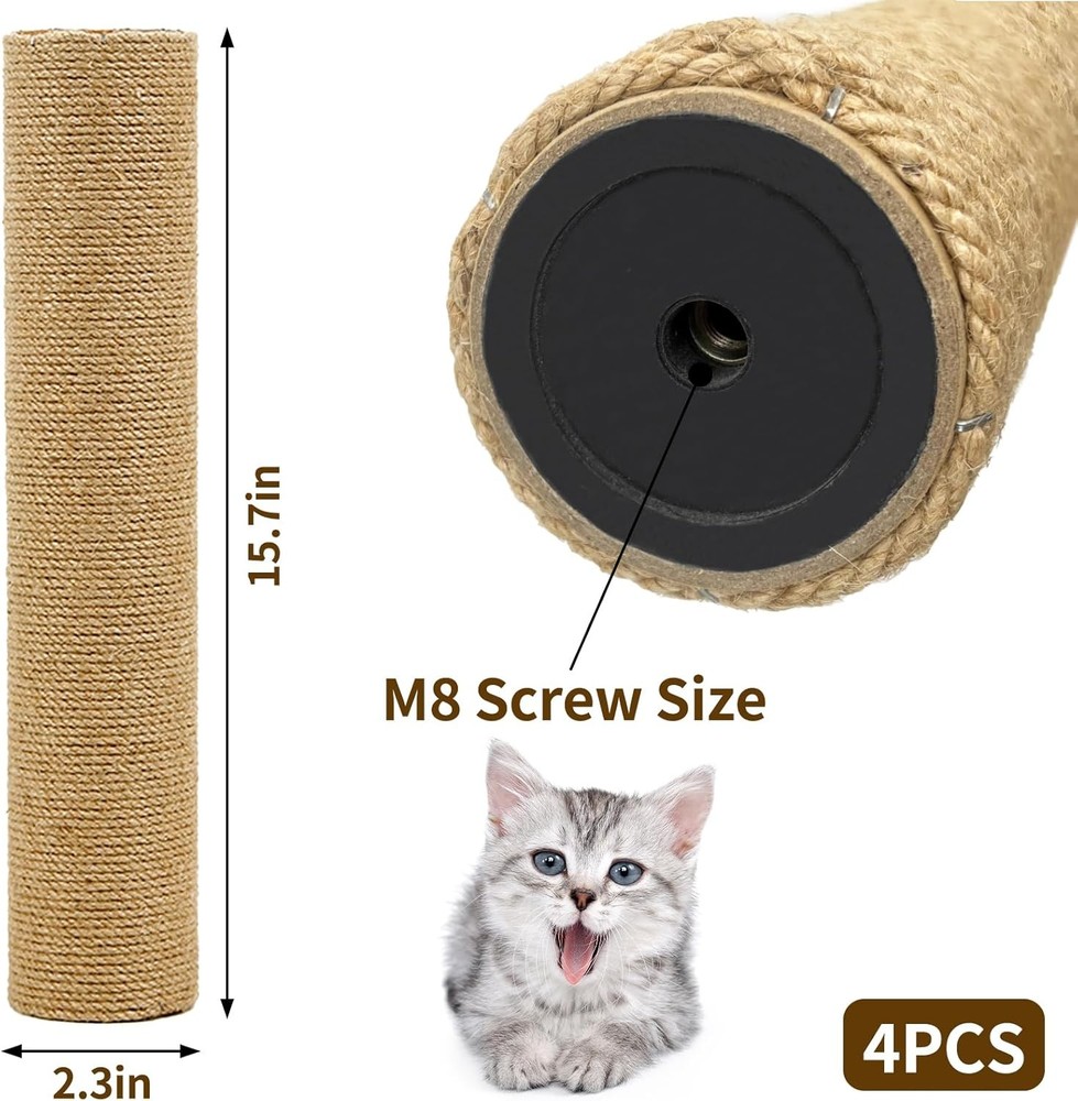 Fhiny 4PCS Cat Scratching Post Replacement 15.7" Natural Jute Spare Brown Product Details Item Weight: 4.07 pounds Manufacturer: Fhiny Country of Origin: China Item model number: FY032-L-4 Item Package Dimensions L x W x H: 15.31 x 5.79 x 5.43 inches Item Dimensions LxWxH: 15.7 x 2.3 x 2.3 inches Brand Name: Fhiny Target Audience Keyword: Cat,Kitten,Kitty Model Name: FY032-L-4 Color: Brown Material: Hemp, Jute Age Range Description: Kitten Care Instructions: Hand Wash Only Breed Recommendation: Large BreedS, Medium Breeds, Small Included Components: post Specific Uses for Product: Indoor Product Dimensions : 15.7 x 2.3 x 2.3 inches; 4.08 Pounds Item model number : FY032-L-4 Manufacturer : Fhiny Country of Origin : China Product Dimensions: 15.7"L x 2.3"W x 2.3"H Specific Uses For Product: Indoor Recommended Uses For Product: Indoor Natural Sisal: Cat replacement scratching posts are made of tightly wound with sisal rope,not easy to loose, sturdy durable and natural look and no odor; it can be used to replace your old cat scratcher tree that have been damaged, lost, or eliminated Confirm Your Screw Type: Please note: The screws types commonly used are M8 and M10,our screw type is M8, please pay attention before purchase it; before replacing the old cat scratching post or preparing to diy a new scratcher Size & Easy To Install: When you receive the package, you will get four 2.3"Dia×15"L replacement cat tree posts, which can be used to reorganize the scratching post, and it is very easily to install Replaceable: Your cat grows bigger and bigger, does the scratching post you bought before seem shorter and shorter? It’s okay, you can choose a new, longer cat tree parts to replace it Healthy Scratch: Cat use cat scratching post mainly for 2 reasons: To remove the dead outer layer of their claws and to flex their feet and claws; scratching is a normal, instinctive behavior Why You Need: When your cat breaks the old scratching post, you can replace it with our cat scratching post replacement, which is a special parts for a cat tree. Instead of buying a brand new one. This can save you a lot of money
