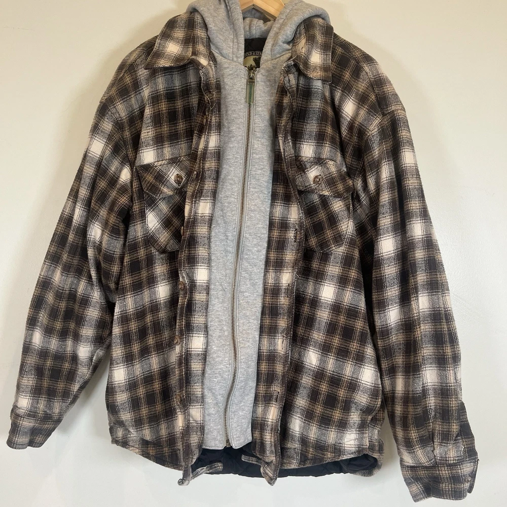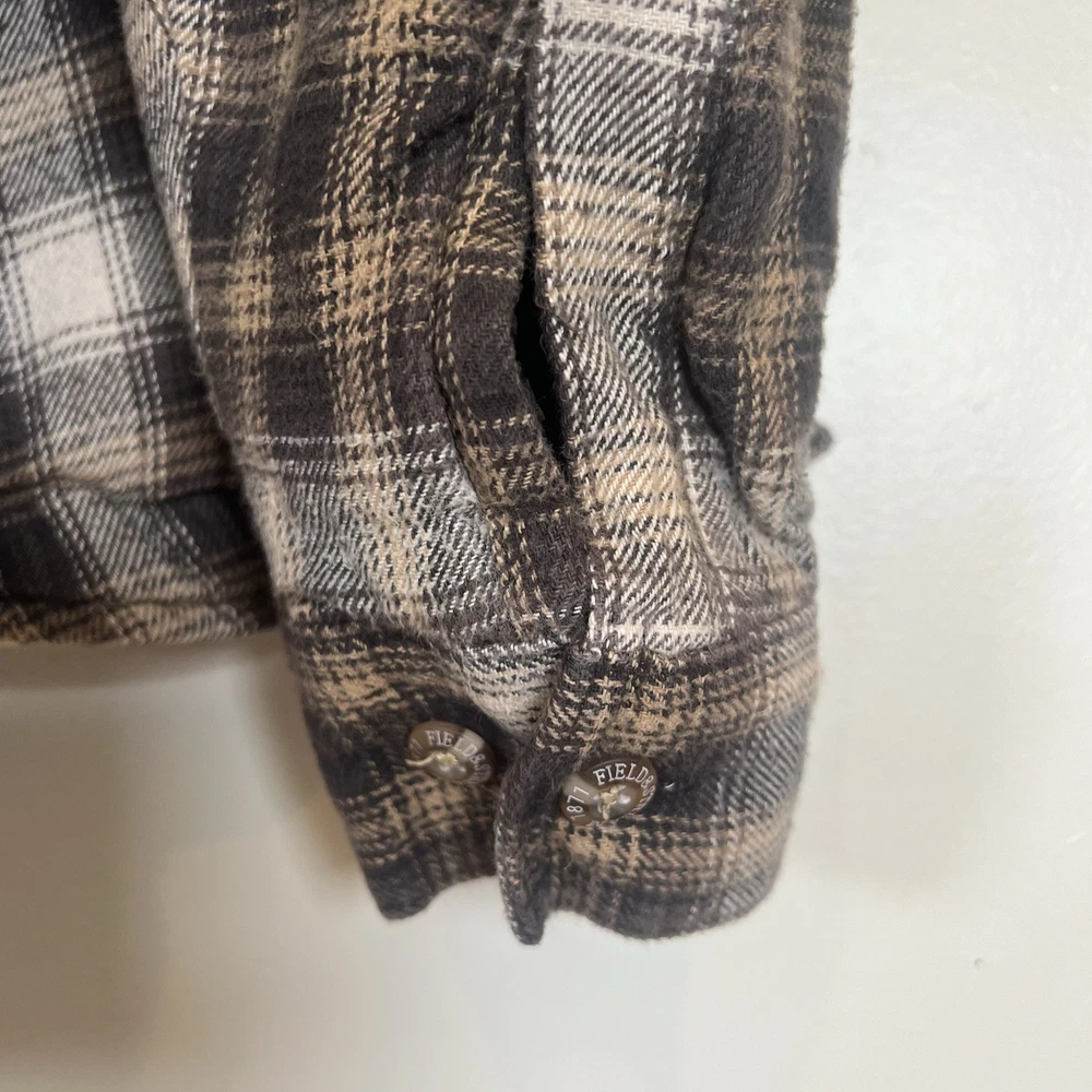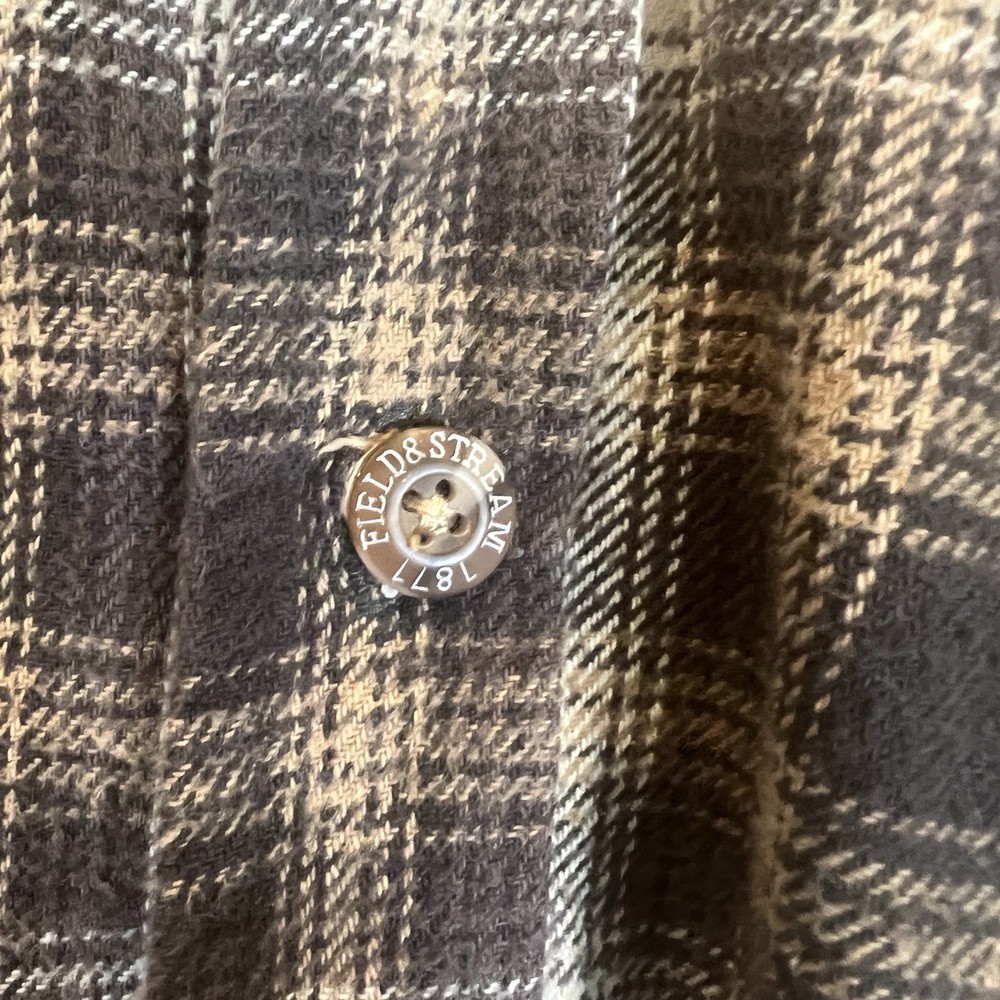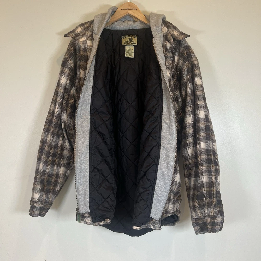 Field & Stream Flannel Plaid Zip Front Hooded Quilted Jacket Brown Mens XL Chest: 28 inches flat measure pit to pit while zipped Length: 31 inches from center back neckline to bottom hem edge Sleeve length: 24 inches from shoulder Shoulder to Shoulder: 24 inches All buttons attached. Zipper has Field & Stream Toggle. Zipper works. Button Chest Pockets; Slash style hand pockets Jacket has been washed. Pre-owned in excellent condition with no rips, holes, snags, stains, discoloration, or defects. See photos. Ask questions. Thank you!