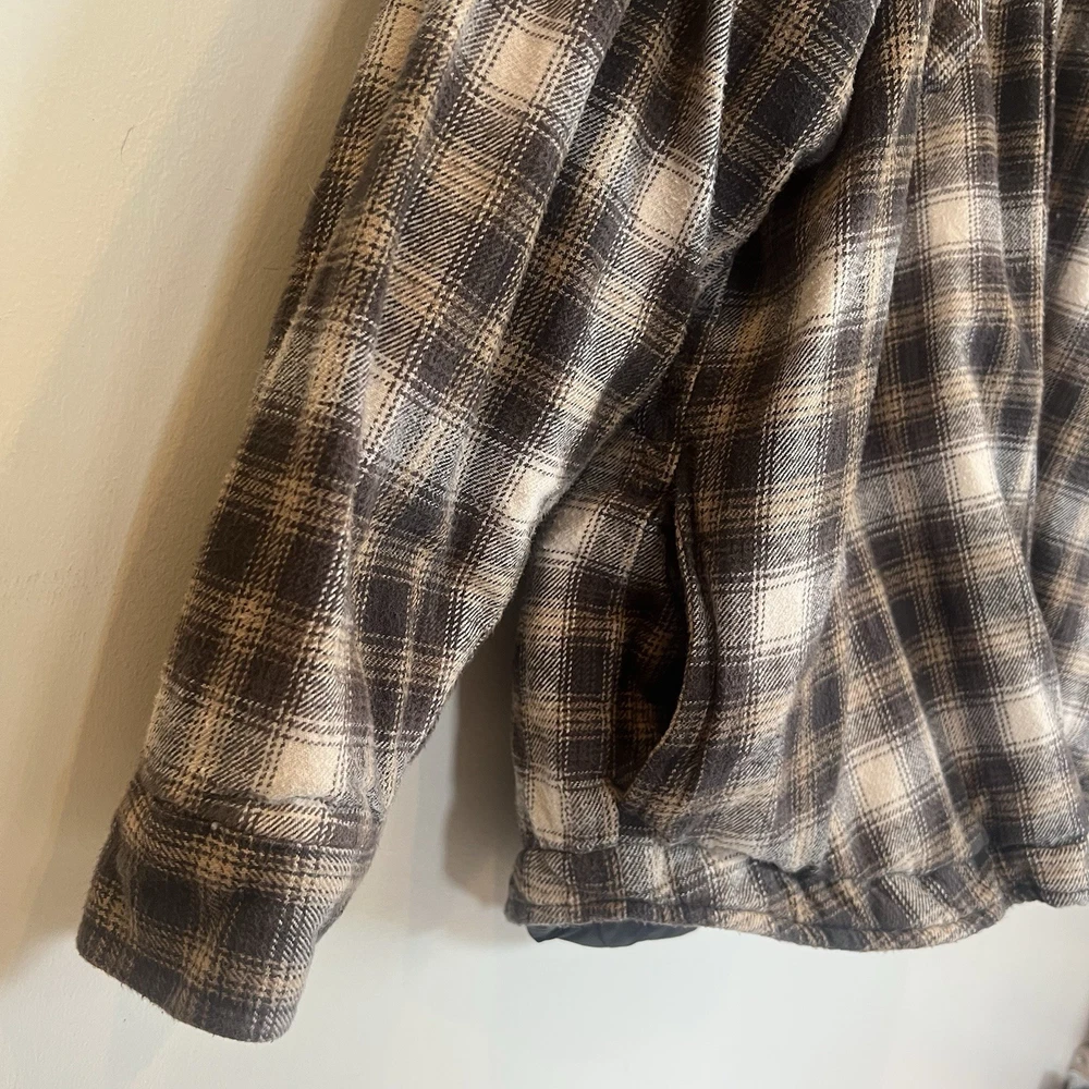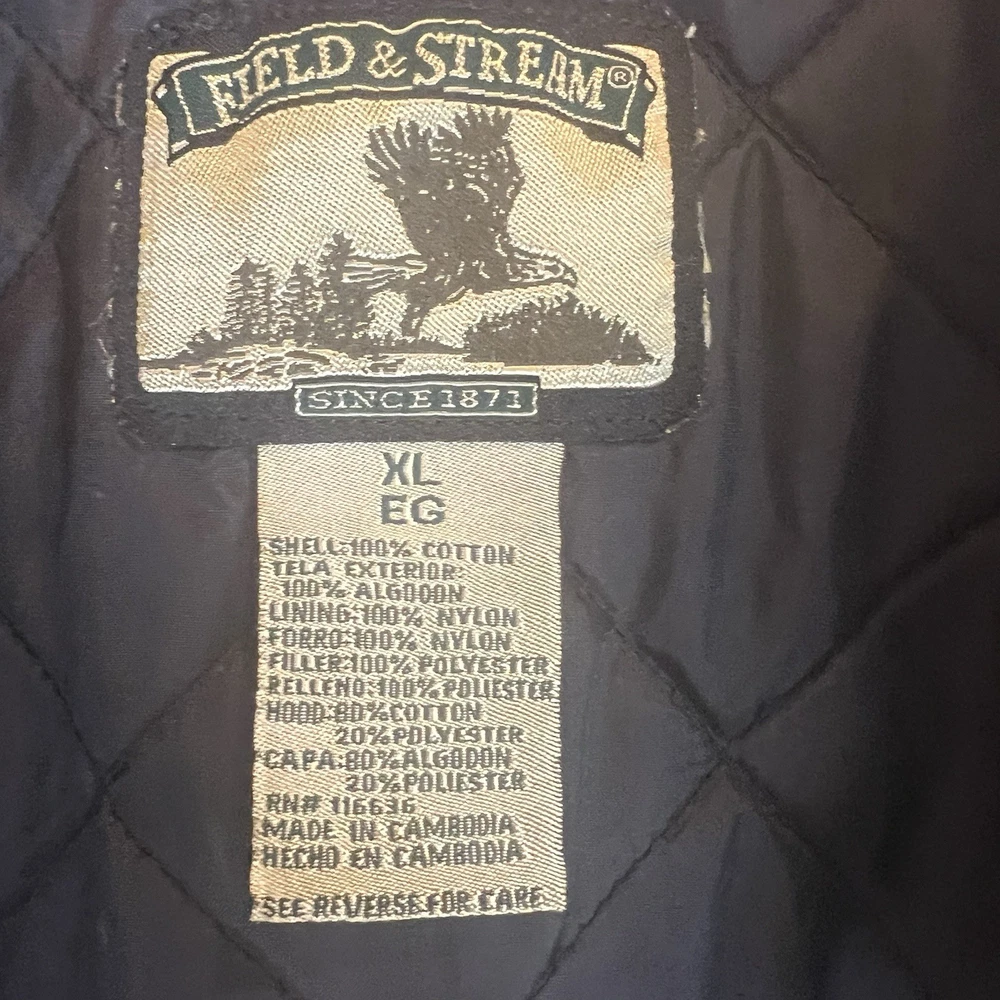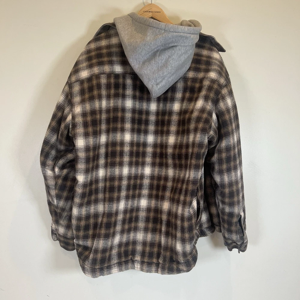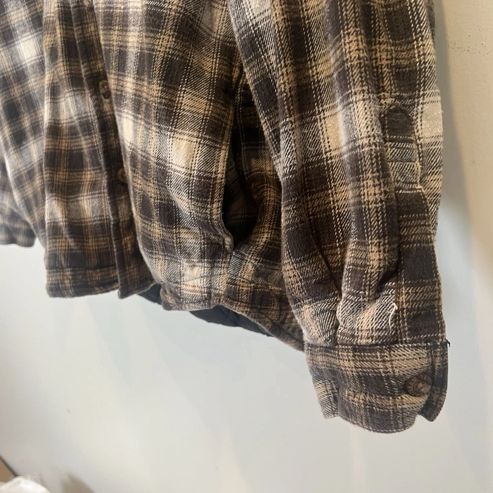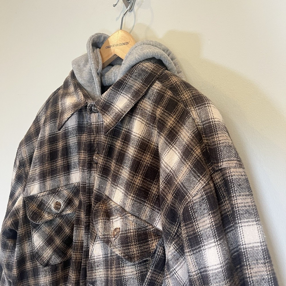 Field & Stream Flannel Plaid Zip Front Hooded Quilted Jacket Brown Mens XL Chest: 28 inches flat measure pit to pit while zipped Length: 31 inches from center back neckline to bottom hem edge Sleeve length: 24 inches from shoulder Shoulder to Shoulder: 24 inches All buttons attached. Zipper has Field & Stream Toggle. Zipper works. Button Chest Pockets; Slash style hand pockets Jacket has been washed. Pre-owned in excellent condition with no rips, holes, snags, stains, discoloration, or defects. See photos. Ask questions. Thank you!