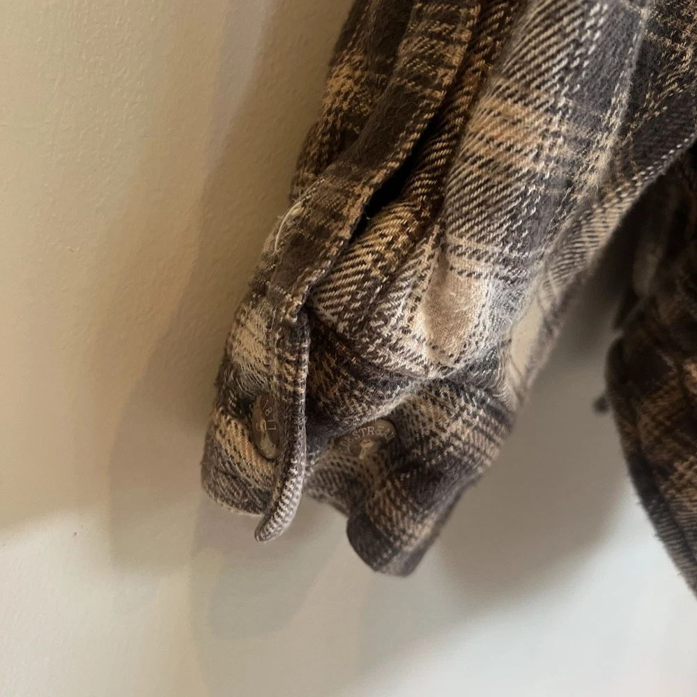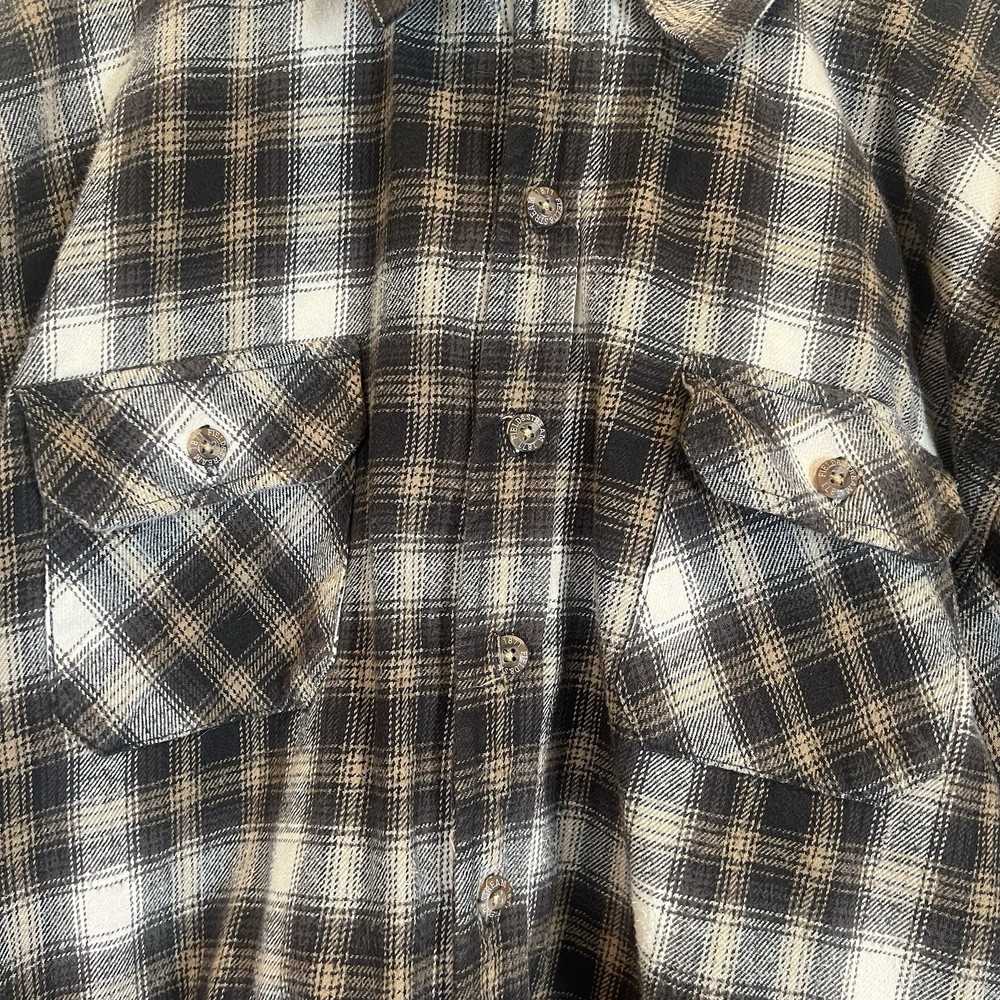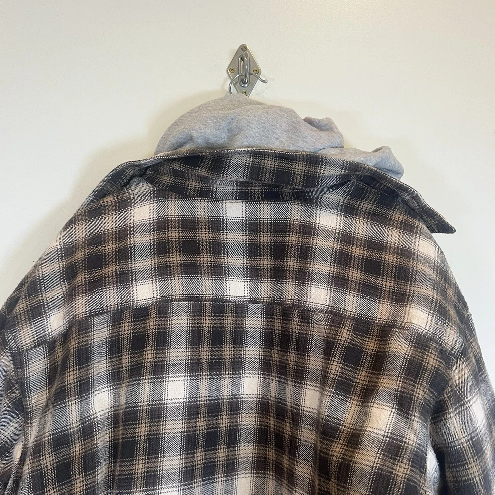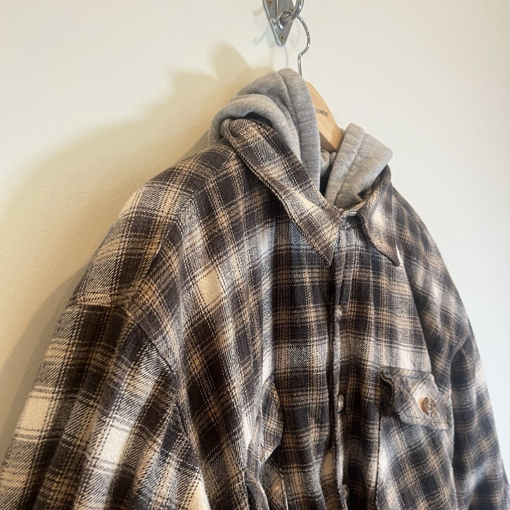 Field & Stream Flannel Plaid Zip Front Hooded Quilted Jacket Brown Mens XL Chest: 28 inches flat measure pit to pit while zipped Length: 31 inches from center back neckline to bottom hem edge Sleeve length: 24 inches from shoulder Shoulder to Shoulder: 24 inches All buttons attached. Zipper has Field & Stream Toggle. Zipper works. Button Chest Pockets; Slash style hand pockets Jacket has been washed. Pre-owned in excellent condition with no rips, holes, snags, stains, discoloration, or defects. See photos. Ask questions. Thank you!