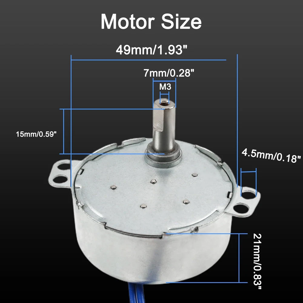 Fielect Synchronous Motor AC 110V 15-18RPM Turntable Motor CW Direction 4W 【Parameters】 - Voltage:AC110V; Speed:15-18RPM; Power:4W; Direction:CW; Diameter:49.8mm/1.96"; Thickness:20.5mm/0.81"; Wire length:400mm/15.75"; Shaft diameter:7mm/0.28"; Shaft length:15mm/0.59" 【Advantage】 - The synchronous reluctance motor small in size, light in weight and easy to use,which is good for handmade, DIY projects, models and anything you want 【Features】 - The synchronous motor has low power consumption, large torque, large operation, low noise and easy installation. It is an ordinary AC motor 【Application】 - AC synchronous motors are mainly used for air guide mechanisms of electric fans, head shaking mechanisms, heaters, lamps and other electrical appliances 【Noted】 - This kind of synchronous motor is a non-directional synchronous motor. When the load reaches the rated torque of the motor, it will automatically reverse. Do not use external force to rotate the motor shaft Fielect Synchronous Motor Specifications: Brand:Fielect Voltage:AC110V Speed:15-18RPM Power: 4W Direction:CW Diameter:49.8m/1.96" Thickness:20.5mm/0.81" Wire Length:400mm/15.75" Shaft diameter:7mm/0.28" Shaft length:15mm/0.59" Material:metal and plastic Color:Silver gray Product description: 1.The permanent magnet synchronous motor and the reducer are combined into one, which can control the advantages and disadvantages of the synchronous motor. 2.Under the rated frequency, the motor speed is not affected by the voltage and remains stable. If the motor is overloaded or blocked, the motor coil will not be burned. 3.The slower the speed, the greater the torque, and use it within the specified voltage and power range of the product. Avoid product damage due to improper use. Package Content: 2Pcs x Synchronous Motor Wire Note: 1.The size of the product are manually measured, please allow slight errors, thank you for your understanding. 2.The actual product and the color of the item shown in the picture may be slightly different from the actual product, please refer to the actual product. 3.Please pay attention to the size of the item before you purchase it. Shipping We offer FREE shipping on all orders! We ship within Three business days of payment, usually sooner. We use a selection of shipping services such as UPS, FedEx, USPS etc. We only ship to the lower 48 states, no APO/FPO addresses or PO Boxes allowed. Local pickups and combined shipping options are not provided at this time. Return You can return a product for up to 30 days from the date you purchased it. Any product you return must be in the same condition you received it and in the original packaging. Please keep the receipt. Payment We accept payment by any of the following methods: PayPal Please pay as soon as possible after winning an auction, as that will allow us to post your item to you sooner! Feedback Customer satisfaction is very important to us. If you have any problem with your order, please contact us and we will do our best to make you satisfied. Contact Us If you have any queries, please contact us via ebay. We usually respond within 24 hours on weekdays. Please visit our eBay store to check out other items for sale! Thank you for shopping at our store.