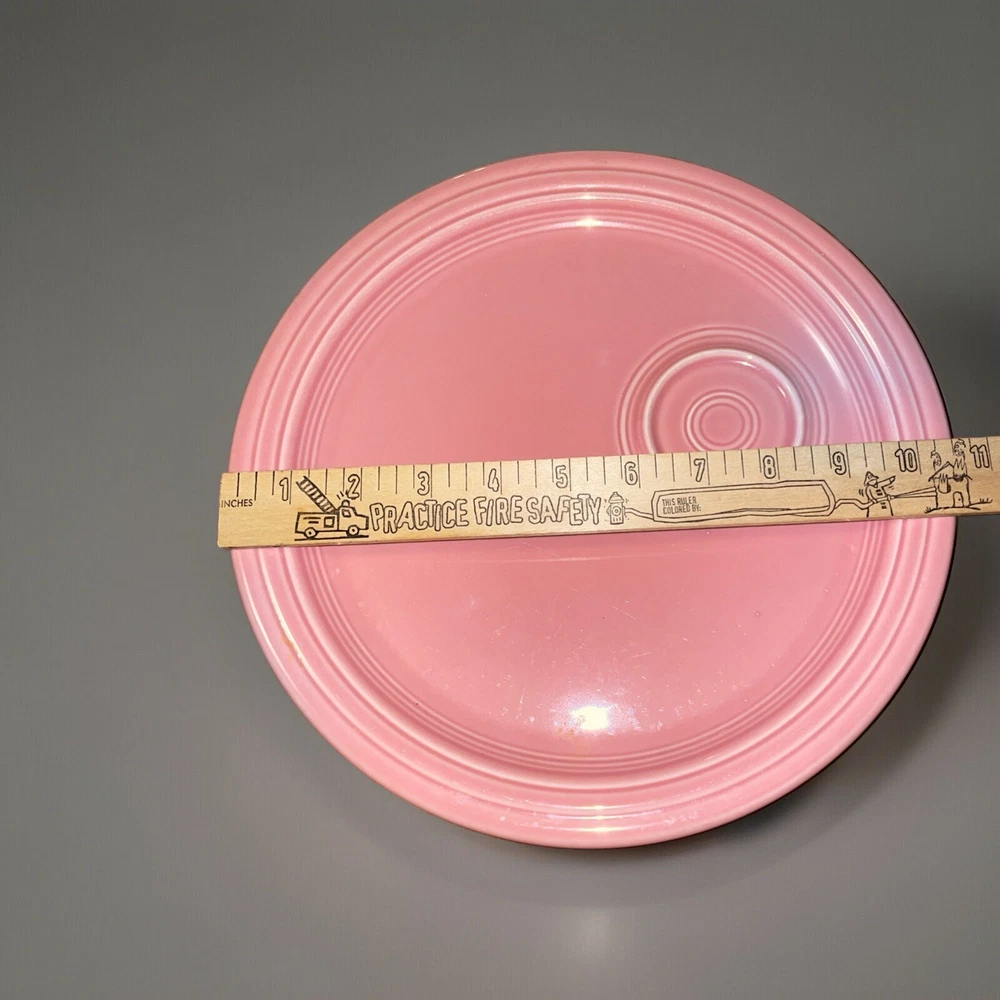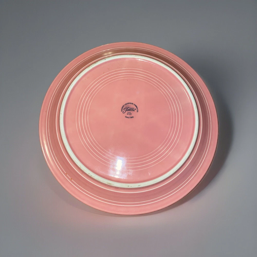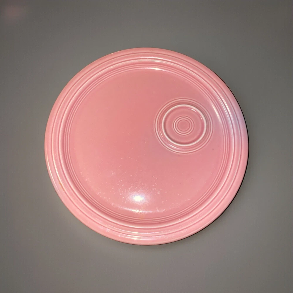 Add a pop of color to your snack time with this Fiesta Rose snack plate. Made of durable stoneware, this 10.5" round plate features a solid rose pattern that is perfect for any occasion. The plate is a vintage piece from the Homer Laughlin Fiestaware product line, made in the United States using mass production techniques. The backstamp is printed and the plate is not handmade. This one-piece set includes a snack plate and is in excellent condition.