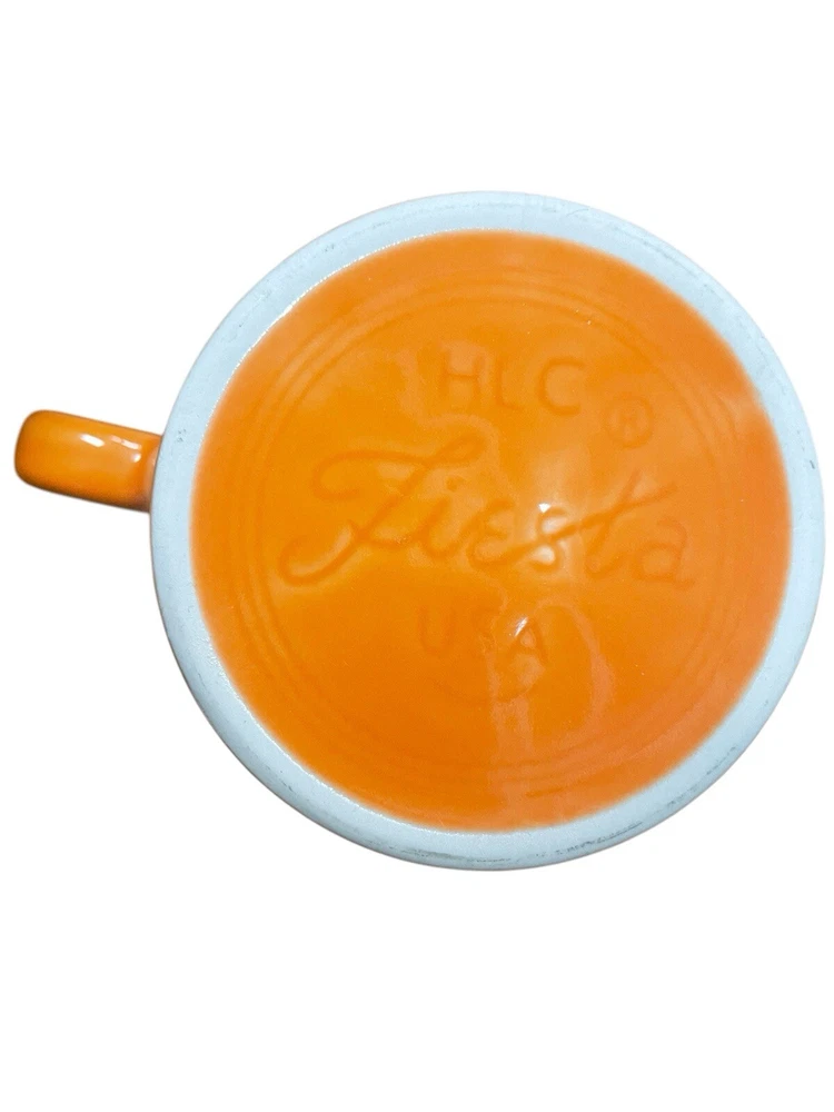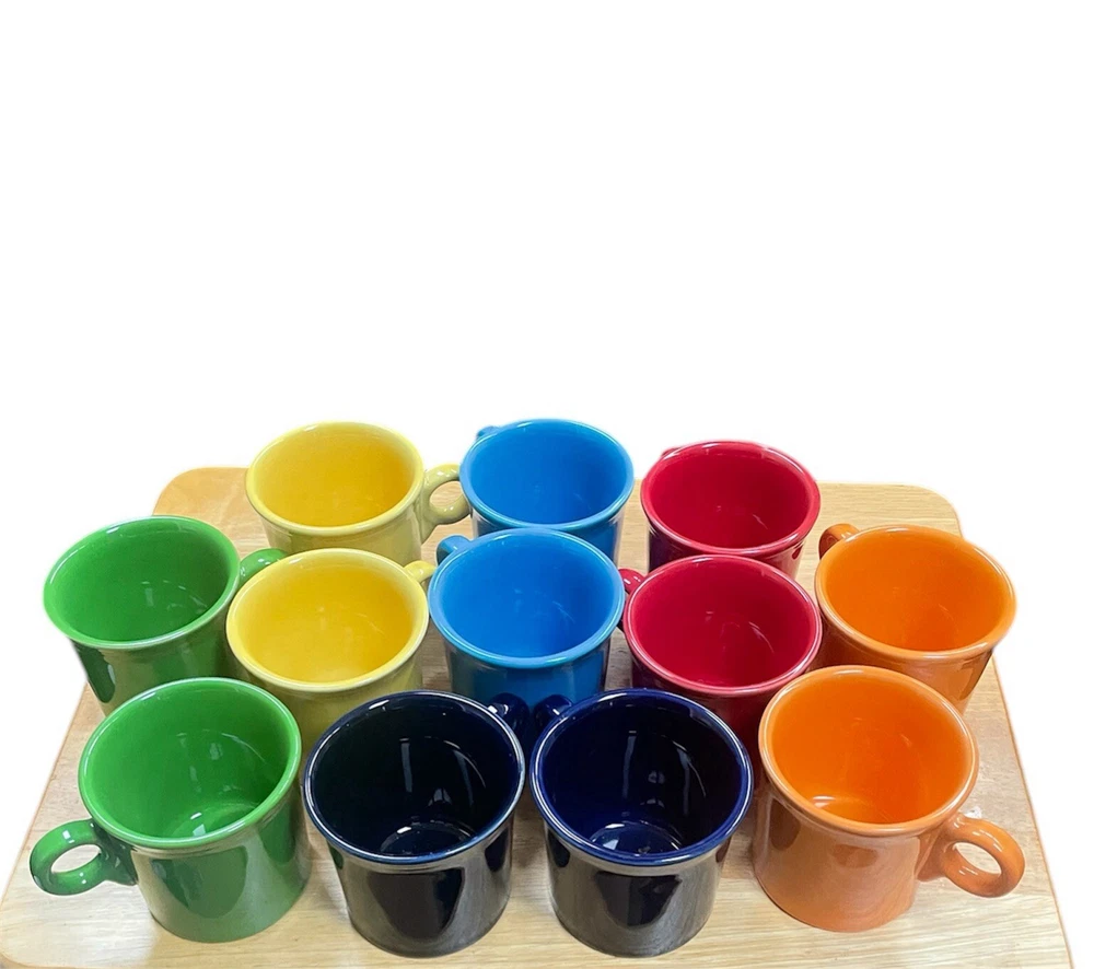 This set of 12 FiestaWare coffee mug is adorned with the distinctive "O Ring" pattern in assorted colors, adding a contemporary touch to the design. Manufactured in 1999 in the United States, these mugs are microwave safe and feature a glossy finish. Signed by Fiesta, these original art pottery mugs are perfect for all occasions.