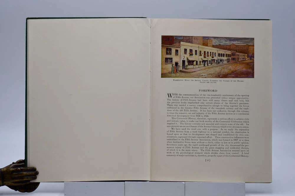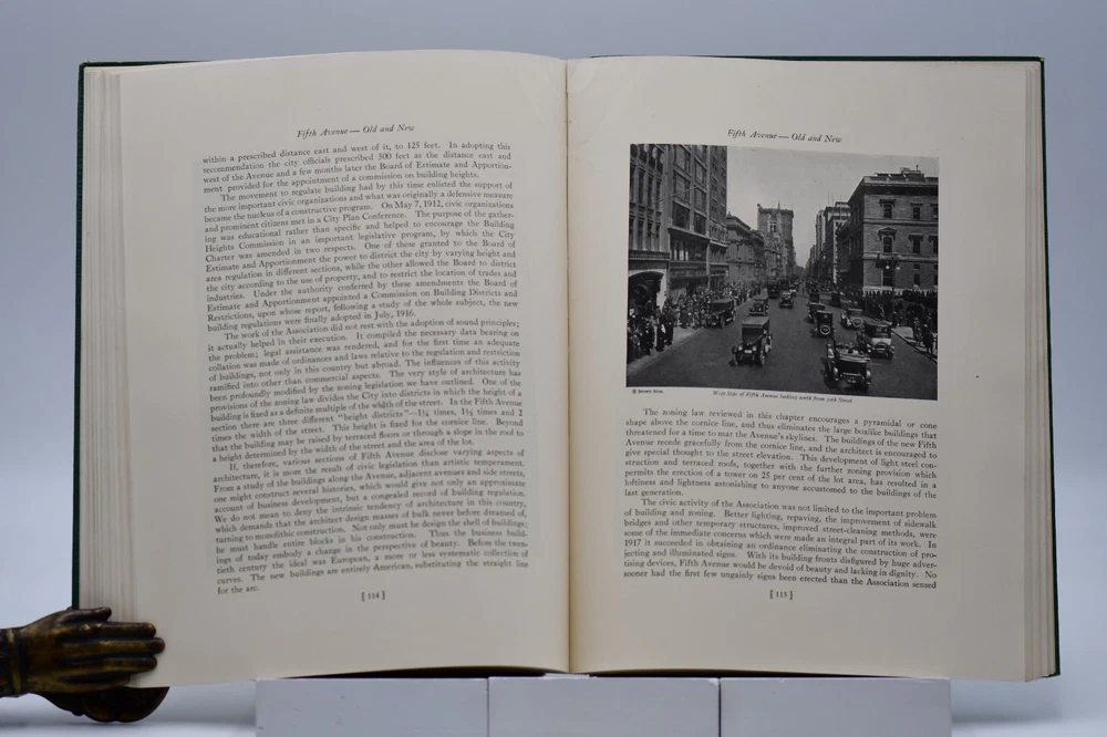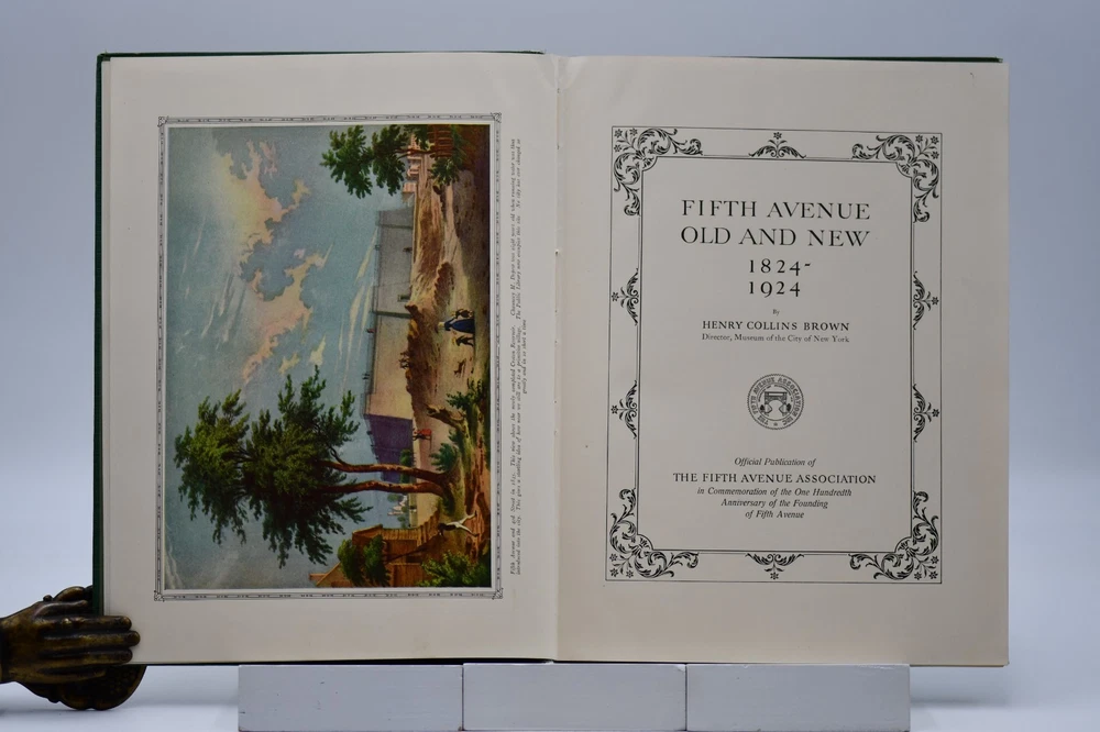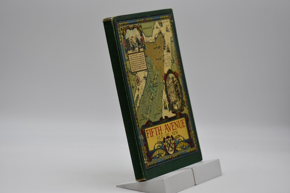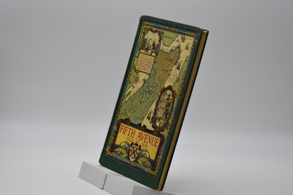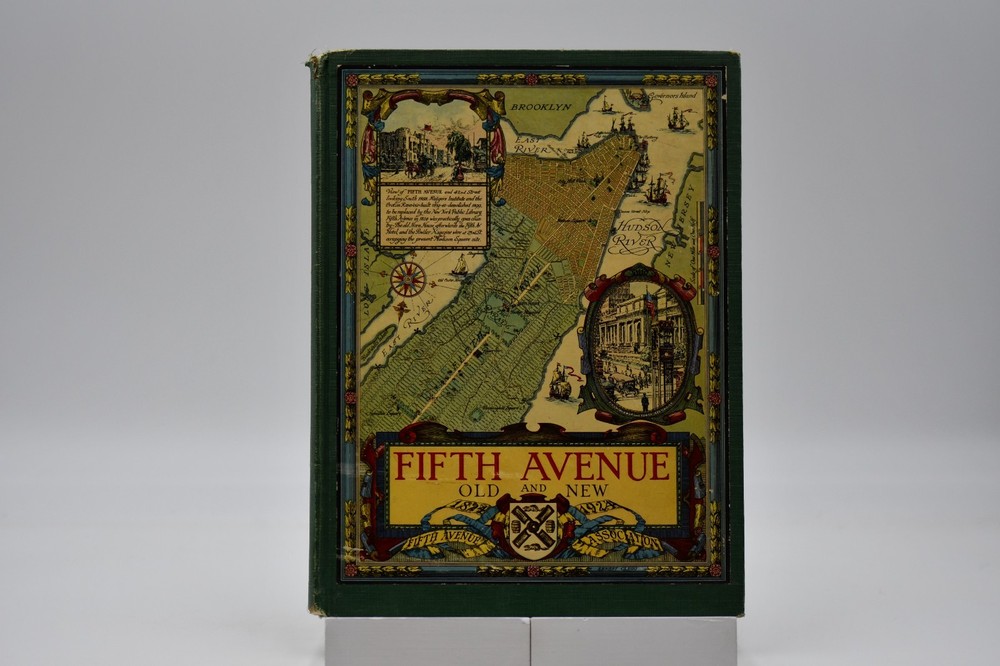 Every town in America has a street that is special or unique to that town, but one street Fifth Avenue in New York is known around the world. In “Commemoration of the One Hundredth Anniversary of the Founding of Fifth Avenue” the Fifth Avenue Association produced this book, “Fifth Avenue Old and New 1824 to 1924”. Written by Henry Collins Brown this “Centennial History represents a serious effort to achieve civic and historic value, to make our book worthy of the Centennial Celebration. Seventeen years ago the rapid northward growth of the city threatened the permanent injury of Fifth Avenue and the great shopping and residential district, of which it is the main artery.” In this Centennial Book the first 97 pages take the reader through the history of “Old Fifth Avenue” with text, black and white illustrations, and photographs. Starting on page 98 through 124 the “Fifth Avenue To-day” is presented starting with a Century of Realty Values. The final section of the book is “dedicated to the men and the institutions whose efforts have helped to make possible THE FIFTH AVENUE OF TODAY”, which is basically approximately 64 pages of advertisements, although they are an equally important part of the history. Now, one hundred years later the association would be pleased to know that Fifth Avenue (specifically Upper Fifth Ave, 49 th – 60 th streets) remains a vibrant neighborhood, known for its iconic attractions and cultural landmarks. It is considered one of the world’s most expensive retail locations with luxury shopping destinations, flagship stores, and high-end boutiques. Henry Collins Brown (1862 – 1961) is today defined as a New York historian, lecturer, author, and founder of the Museum of the City of New York. But as arriving in New York from Scotland he left school at 15 but he became passionate about the history of his adopted city. He worked as an advertising salesman, became a journalist for “The Sun” writing about the city’s history as well as its buildings. In 1923 he founded the Museum of the City of New York but three years later was pushed out as the and it was not until the museum’s 75 th anniversary in 1998, Brown received acknowledgement. Barred from society he retreated to his home in Hastings-on Hudson, fought anxiety and depression, suffered a nervous breakdown and was institutionalize. When he emerged, he wrote the acclaimed memoir of mental illness “A Mind Mislaid” published in 1937. This book remains as testament to his knowledge and love of Fifth Avenue and New York City. Condition: On the outside the book has numerous flaws and damage but none that carry over to the interior of the book. Dark forest green cloth boards have an illustrated pastedown that covers the front board that has some rubbing at the edges and rubbing along the board edges and the rear board has numerous cosmetic blemishes. The spine is cloth only with both the top and bottom back strip worn completely off with a tear in the fabric and rubbing along where the spine is attached to the binding. All corners are bumped and with wear. Spine and binding are tight but with a slight slant, hinges are sound with no cracking to the decorative endpapers. Text block is intact with all pages attached. Light age tanning throughout. Previous owner address label to the front endpaper. Internal pages are overall clean with no tears, chips, or other previous owner marks. Approximately 190 pages. Dimensions: H – 12” W – 9-1/4”
