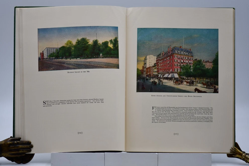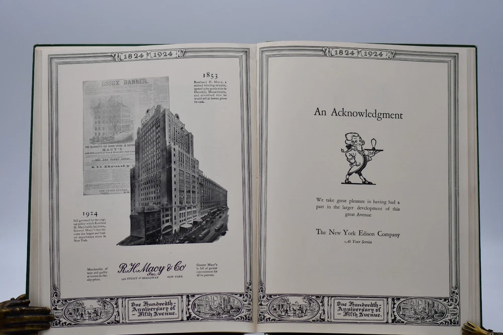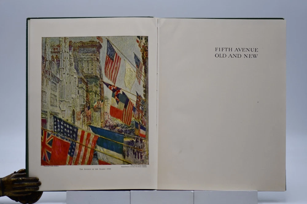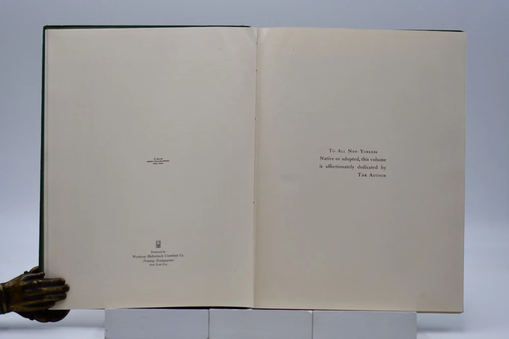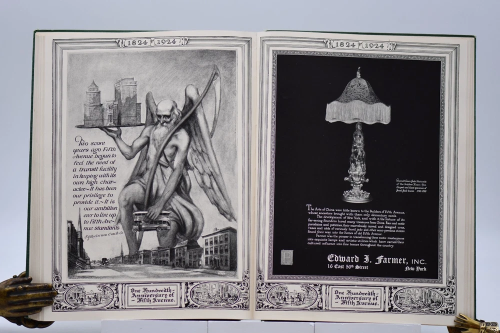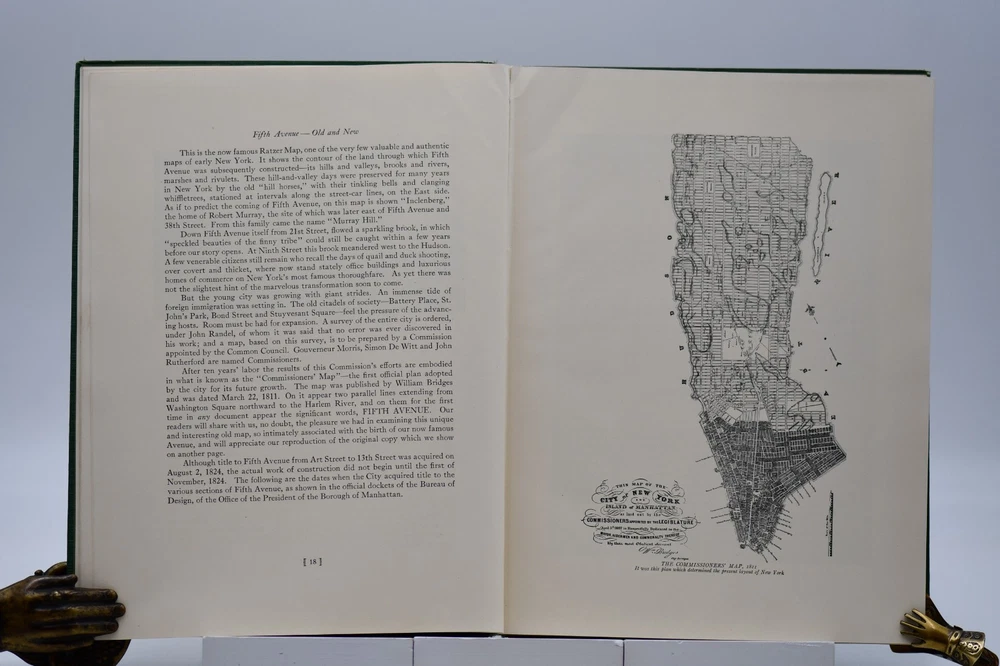 Every town in America has a street that is special or unique to that town, but one street Fifth Avenue in New York is known around the world. In “Commemoration of the One Hundredth Anniversary of the Founding of Fifth Avenue” the Fifth Avenue Association produced this book, “Fifth Avenue Old and New 1824 to 1924”. Written by Henry Collins Brown this “Centennial History represents a serious effort to achieve civic and historic value, to make our book worthy of the Centennial Celebration. Seventeen years ago the rapid northward growth of the city threatened the permanent injury of Fifth Avenue and the great shopping and residential district, of which it is the main artery.” In this Centennial Book the first 97 pages take the reader through the history of “Old Fifth Avenue” with text, black and white illustrations, and photographs. Starting on page 98 through 124 the “Fifth Avenue To-day” is presented starting with a Century of Realty Values. The final section of the book is “dedicated to the men and the institutions whose efforts have helped to make possible THE FIFTH AVENUE OF TODAY”, which is basically approximately 64 pages of advertisements, although they are an equally important part of the history. Now, one hundred years later the association would be pleased to know that Fifth Avenue (specifically Upper Fifth Ave, 49 th – 60 th streets) remains a vibrant neighborhood, known for its iconic attractions and cultural landmarks. It is considered one of the world’s most expensive retail locations with luxury shopping destinations, flagship stores, and high-end boutiques. Henry Collins Brown (1862 – 1961) is today defined as a New York historian, lecturer, author, and founder of the Museum of the City of New York. But as arriving in New York from Scotland he left school at 15 but he became passionate about the history of his adopted city. He worked as an advertising salesman, became a journalist for “The Sun” writing about the city’s history as well as its buildings. In 1923 he founded the Museum of the City of New York but three years later was pushed out as the and it was not until the museum’s 75 th anniversary in 1998, Brown received acknowledgement. Barred from society he retreated to his home in Hastings-on Hudson, fought anxiety and depression, suffered a nervous breakdown and was institutionalize. When he emerged, he wrote the acclaimed memoir of mental illness “A Mind Mislaid” published in 1937. This book remains as testament to his knowledge and love of Fifth Avenue and New York City. Condition: On the outside the book has numerous flaws and damage but none that carry over to the interior of the book. Dark forest green cloth boards have an illustrated pastedown that covers the front board that has some rubbing at the edges and rubbing along the board edges and the rear board has numerous cosmetic blemishes. The spine is cloth only with both the top and bottom back strip worn completely off with a tear in the fabric and rubbing along where the spine is attached to the binding. All corners are bumped and with wear. Spine and binding are tight but with a slight slant, hinges are sound with no cracking to the decorative endpapers. Text block is intact with all pages attached. Light age tanning throughout. Previous owner address label to the front endpaper. Internal pages are overall clean with no tears, chips, or other previous owner marks. Approximately 190 pages. Dimensions: H – 12” W – 9-1/4”