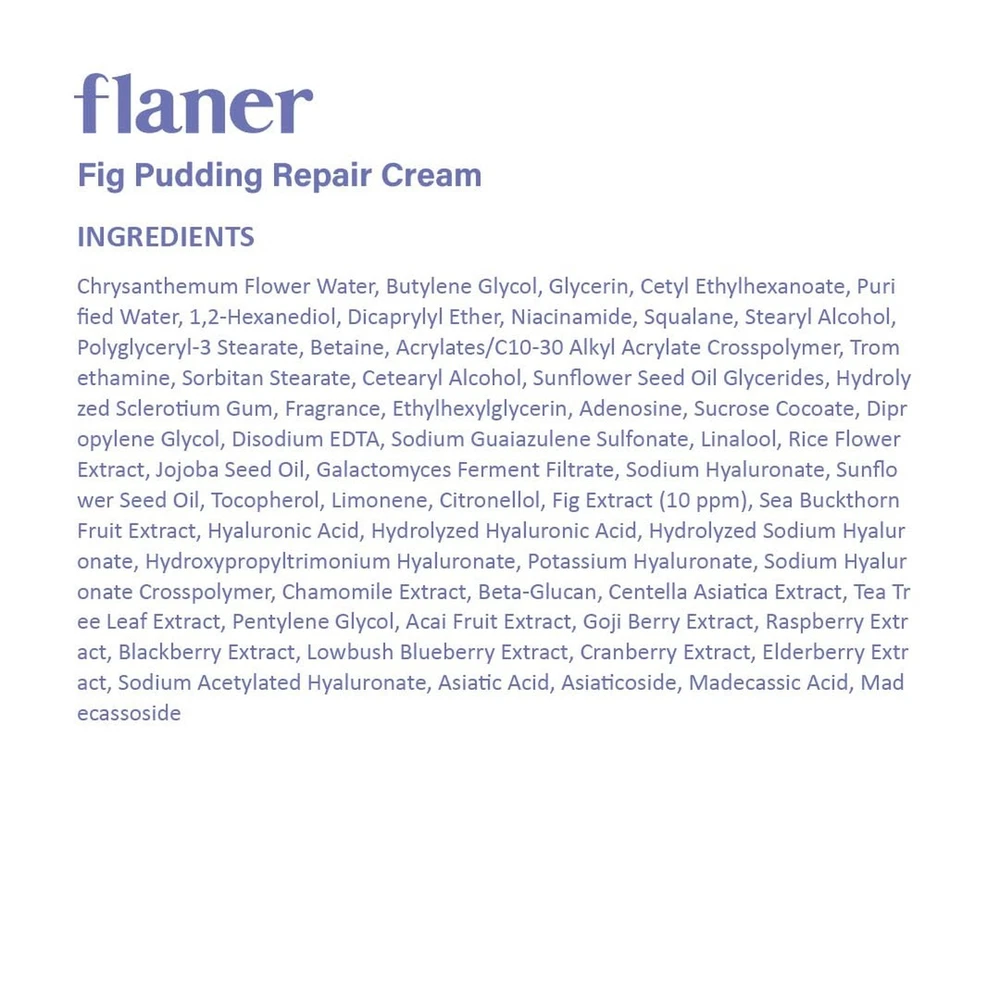 Fig Pudding Barrier Repair Cream – 11x Hyaluronic Acid Moisturizer Cream, Barrier Care, Ceramide, Hydration and Barrier Strengthening, Vegan, Korean Skincare, Dry & Sensitive Skin, 1.69 fl.oz - Buy Now with Fast Shipping! Fig Pudding Barrier Repair Cream – 11x Hyaluronic Acid Moisturizer Cream, Barrier Care, Ceramide, Hydration and Barrier Strengthening, Vegan, Korean Skincare, Dry & Sensitive Skin, 1.69 fl.oz Product Details Brand: flaner Item Volume: 50 Milliliters Item dimensions L x W x H: 2.4 x 2.4 x 1.97 inches Age Range (Description): Adult Special Feature: Hyaluronic Acid, Hypoallergenic, Natural Ingredients Product Dimensions : 2.4 x 2.4 x 1.97 inches; 3.2 ounces Manufacturer : Flaner Key Features ✅ 11x HYALURONIC ACID: 11 types of hyaluronic acid densely moisture from the inside out, providing long-lasting hydration, and leaving your skin plump, dewy, and moisturized all day. ✅ BOUNCY PUDDING TEXTURE: Experience a luxurious, memory-shape cream that is lightweight, non-sticky and absorbs quickly, leaving a smooth, comfortable finish perfect for day and night hydration. ✅ FIG GLOW: Packed with antioxidant-rich Fig Extract, Sea Buckthorn, and 7 berries to visibly brighten, protect, and boost skins natural glow. ✅ SKIN BARRIER CARE: DERMA-CLERA and Ceramides contribute to a stronger skin barrier, replenishing moisture while helping to improve skin elasticity and soothe dryness. ✅ CLEAN BEAUTY FORMULA: Crafted with naturally derived, low-irritation ingredients, this cream is dermatologist-tested and safe for all skin types including sensitive skin types. Product Description